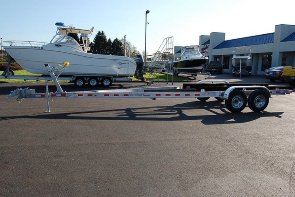 WE ARE DIAMOND MARINE OF CONNECTICUT, THE USA's LARGEST VENTURE DEALER. WHY? BECAUSE WE SPECIALIZE IN THE MOST POPULAR MODEL.. THE I-BEAM ALUMINUM BUNK TRAILER.. AND WE KEEP ALL MODELS IN-STOCK, YEAR ROUND!!. THIS PARTICULAR MODEL IS THE VATB-8725 TANDEM AXLE BUNK TRAILER AND HAS AN 8725 LB CARRYING CAPACITY AND IS DESIGNED FOR A BOAT 27-29FT BOAT (PLEASE MEASURE BOW-EYE TO DRAIN PLUG TO DETERMINE THE RIGHT TRAILER FOR YOUR BOAT), HAS 225/75D 6 LUG GALVINIZED STEEL WHEELS (ALLOY MAG WHEELS SHOWN IN PICTURES ARE OPTIONAL AT $75PER WHEEL), DIAMOND PLATE FENDERS, CORROSION RESISTANT FASTENERS, LARGER THAN INDUSTRY STANDARD BUNKS, HEAVY DUTY WINCH STRAPS, PLUG AND PLAY WIRING HARNESS, MARINE GRADE DISC BRAKES (STANDARD ON ONE AXLE, CHECK YOUR STATES LAWS AS SOME STATES REQUIRE BRAKES ON ALL AXLES, $380 EXTRA), SUPER LUBE HUBS, AND VENTURE IS NMMA CERTIFIED. ALL VENTURE TRAILERS ARE COMPLETELY ADJUSTABLE (WITH JUST A 3/4" SOCKET) TO FIT YOUR BOAT RIGHT IN NO TIME AT ALL. THE TRAILERS SHOWN IN THE PICTURES HAVE TWO DIFFERENT STYLES OF ALUMINUM WHEELS, AS AVAILABILTY VARIES AND IS SUBJECT TO VENTURE"S DISCRETION. BOW GUIDES ARE STANDARD ON ALL ALUMINUM TRAILERS AND TARGET BUNKS AS SHOWN IN SOME OF THE PICTURES ARE AN OPTION ($150), OTHER OPTIONS INCLUDE PVC LOAD GUIDES AND POLY GLIDE BUNK SLEEVES. IF YOU ARE NOT SURE WHAT TRAILER YOU NEED FOR YOUR BOAT, JUST CALL US WITH THE MAKE MODEL AND YEAR AND WE WILL SIZE UP THE RIGHT TRAILER FOR YOUR BOAT. TRADE-INS ARE WELCOME AND HOIST SERVICE IS AVAILABLE TO SWITCH YOUR BOAT FROM YOUR OLD TRAILER TO THE NEW ONE. YES WE CHARGE A DEALER PROCESSING FEE OF $149, BUT IF OUT OF STATE, YOU LEAVE HERE WITH A 30DAY TEMP PLATE AND IF YOU ARE FROM CONNECTICUT YOU LEAVE HERE REGISTERED,.. NO DRIVING HOME ILLEGAL FROM DIAMOND MARINE, NO WAITING IN LINE AT DMV.. ASK THE OTHER GUYS WHAT THEY PROVIDE!!!