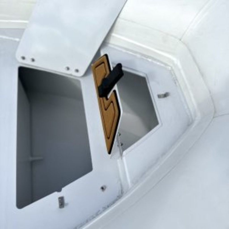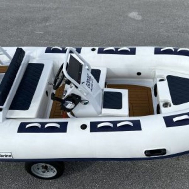 The Eastmarineboats Godiac Elite 390 is a 13 foot Hypalon/ Aluminum RIB made to be a stand alone boat or a luxurious yacht tender. Equiopped with a ton of standard features including a self bailing cockpit, that drains to the bilge and has a bilge pump. All Godiacs are equipped standard with a stereo system, navigation lights, and fuel tanks. The 390 Elite has an aluminum side console with ample storage throughout the boat, including a dedicated anchor locker and roller with an integrated cleat. Its designed for 6 passengers and 50 lbs of gear or equivelant. top speedc is 32 MPH with a 40 hp engine. They are constructed of Hyplaon with 3 air chambers.