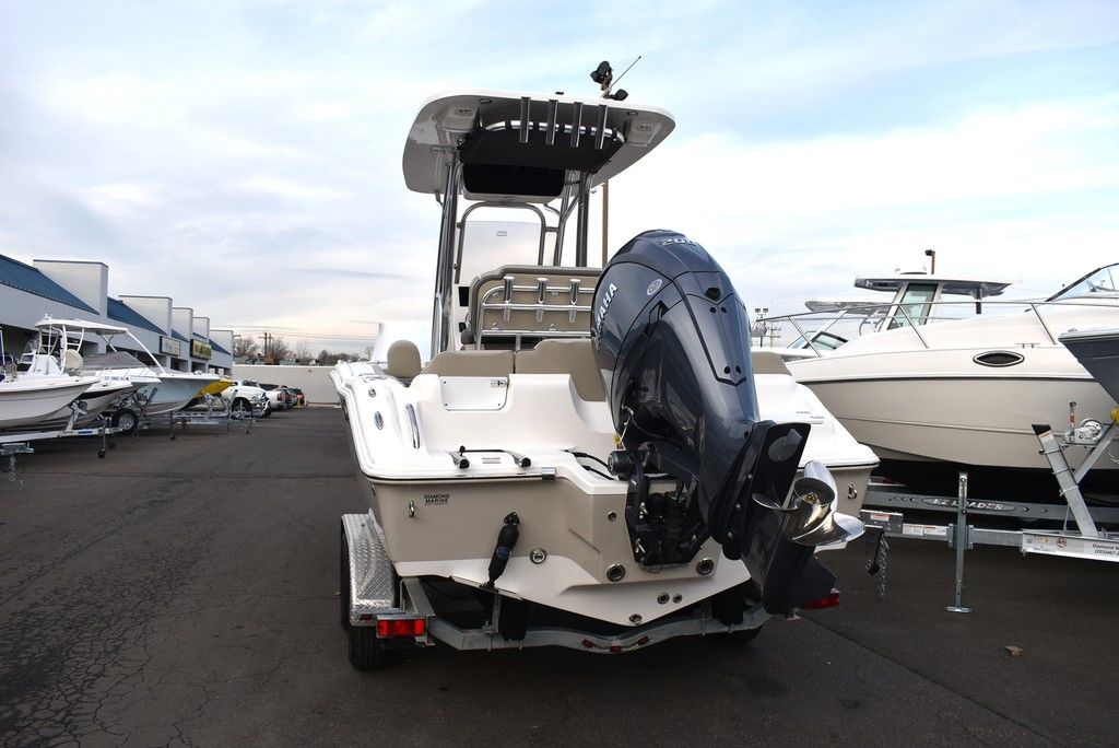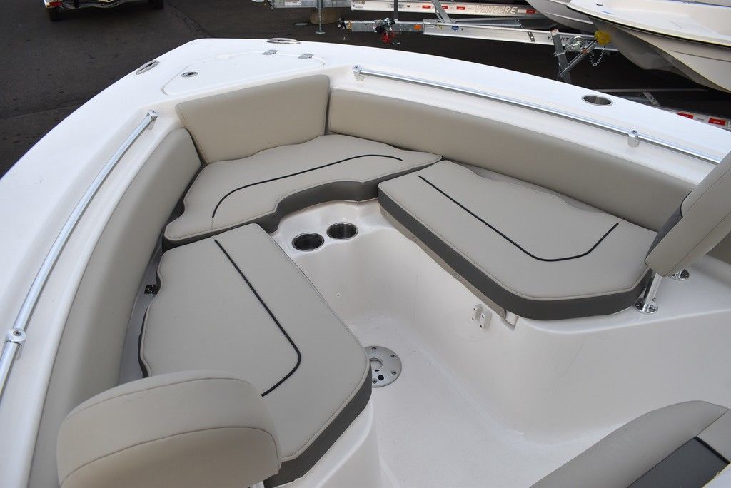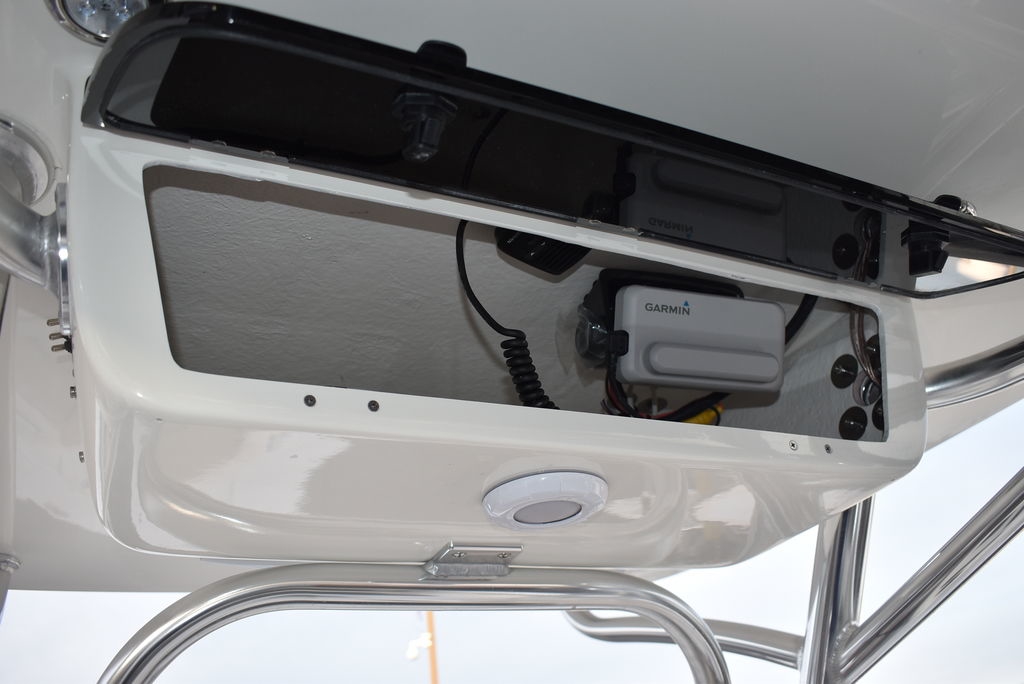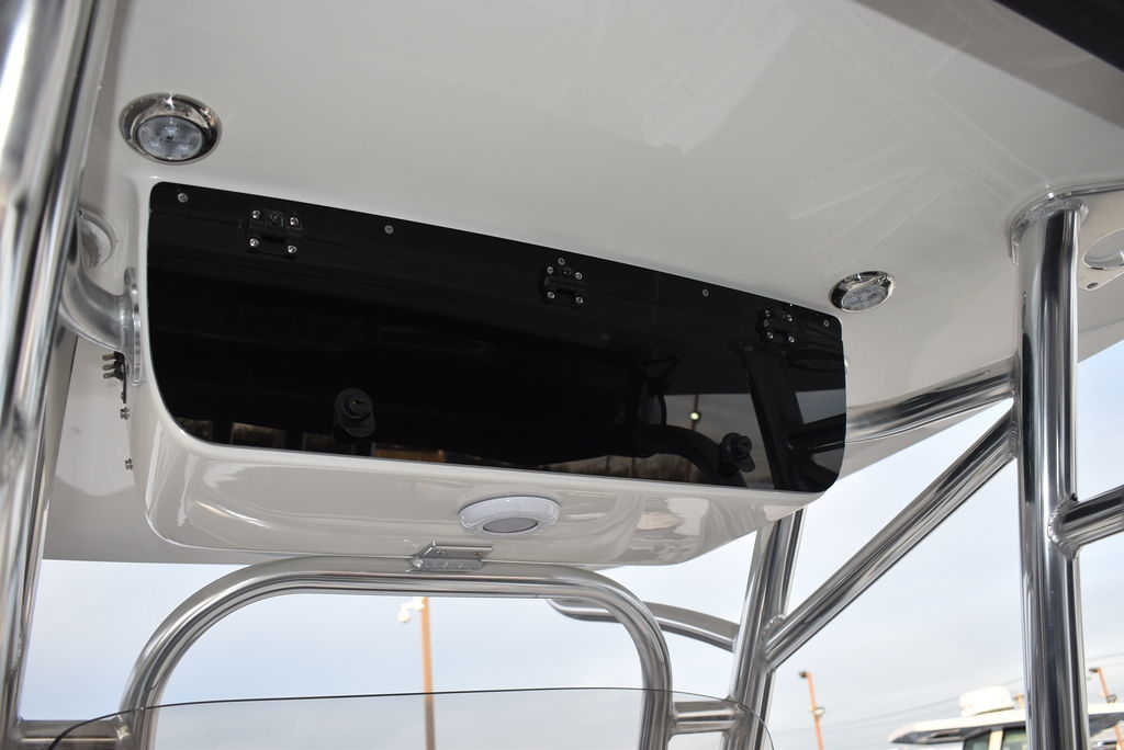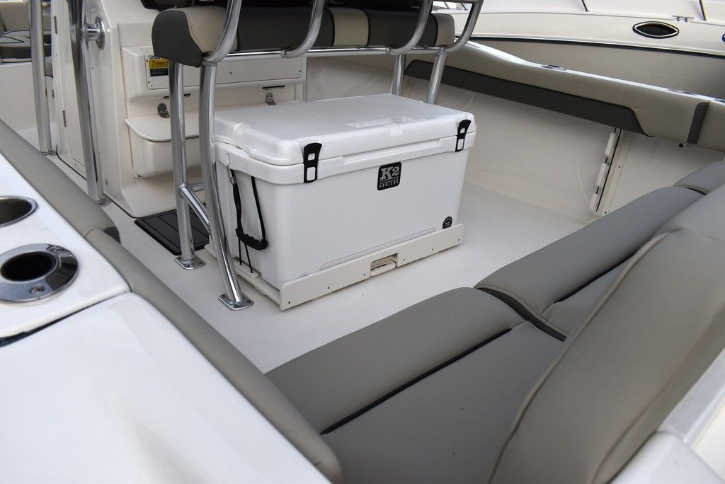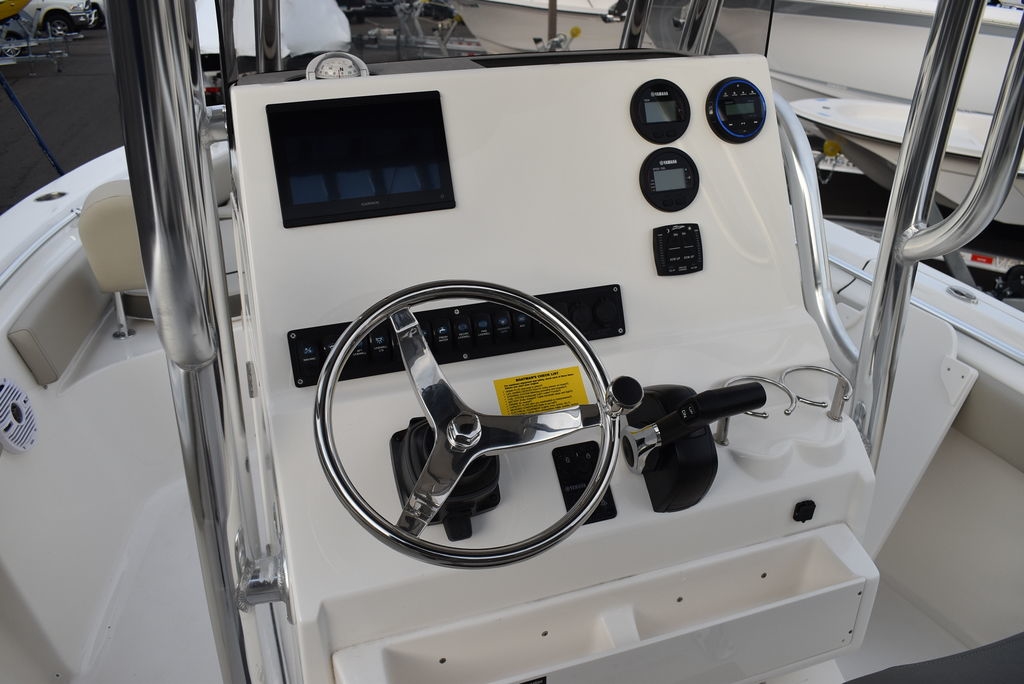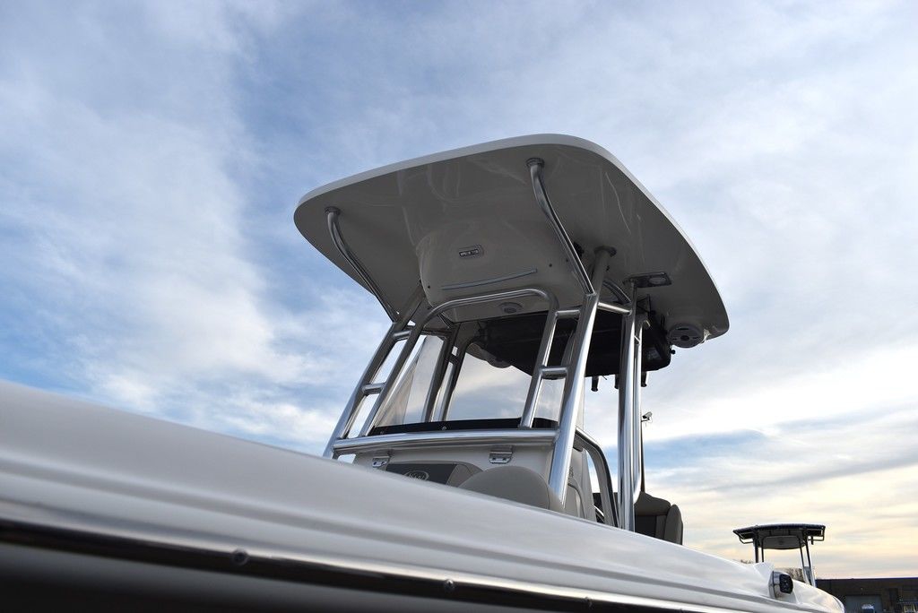 Optional equipment- Sand hull color, Yamaha F200XD mechanical motor, Command link digital gauges, Garmin 943XS Color GPS/Fishfinder w/ GT56 transducer, Clarion stereo w/ 4 speakers, VHF radio w/ antenna, Stainless steel rubrail, Hardtop, Leaning post w/ flip-up bolsters and armrests, Hardtop spray shield, leaning post cover, console cover in black, Interior LED Lights, Underwater lights, Removable bow table/filler cushion, Console dash pad, Floor helm pad, Fresh water washdown, Pop-up fender holders, Tall Windshield, pump-out toilet.