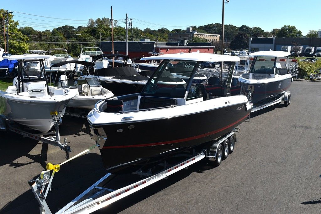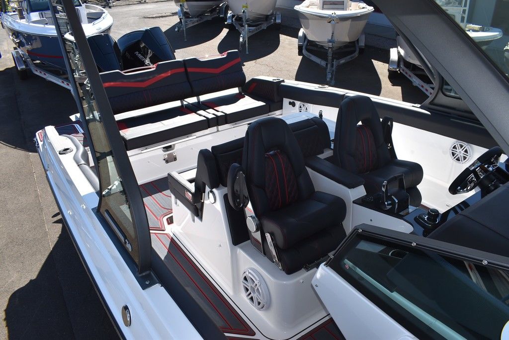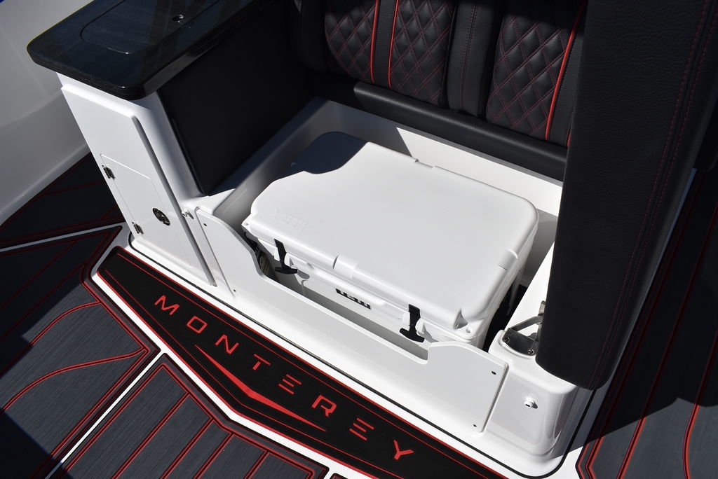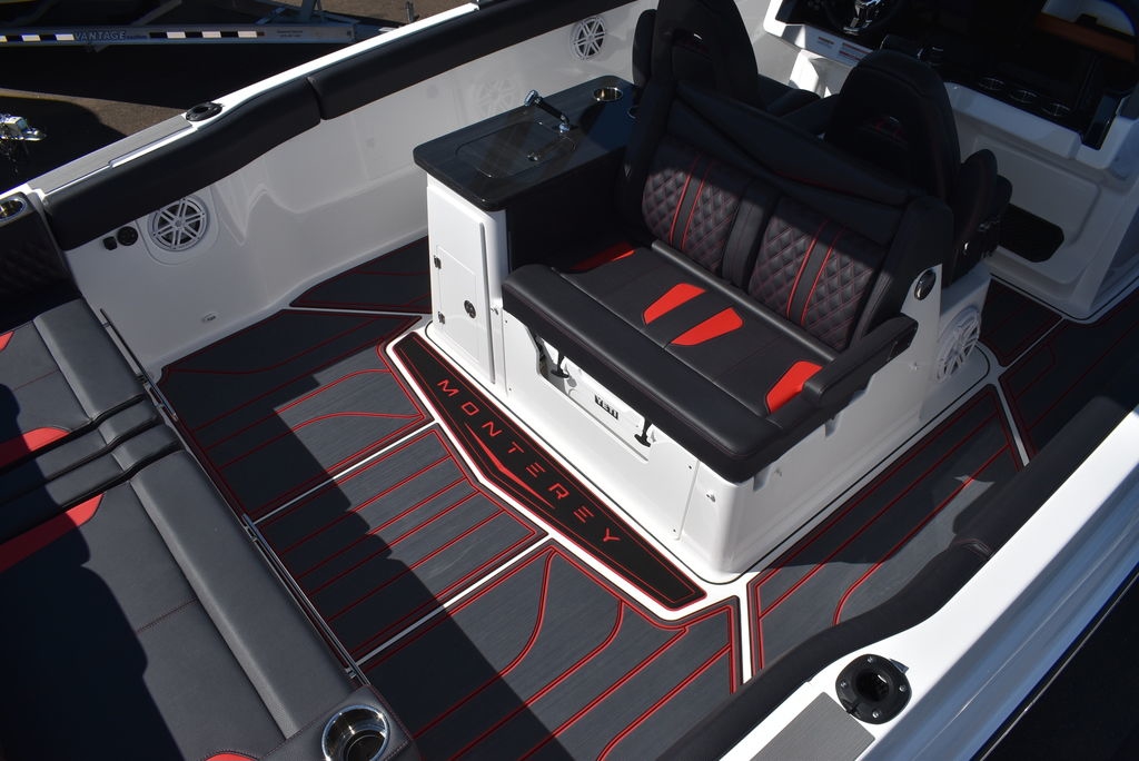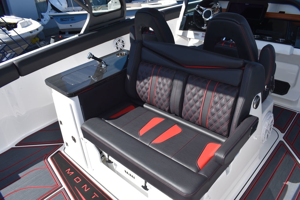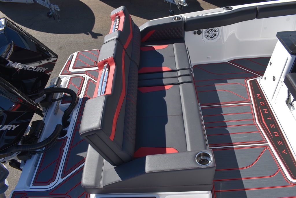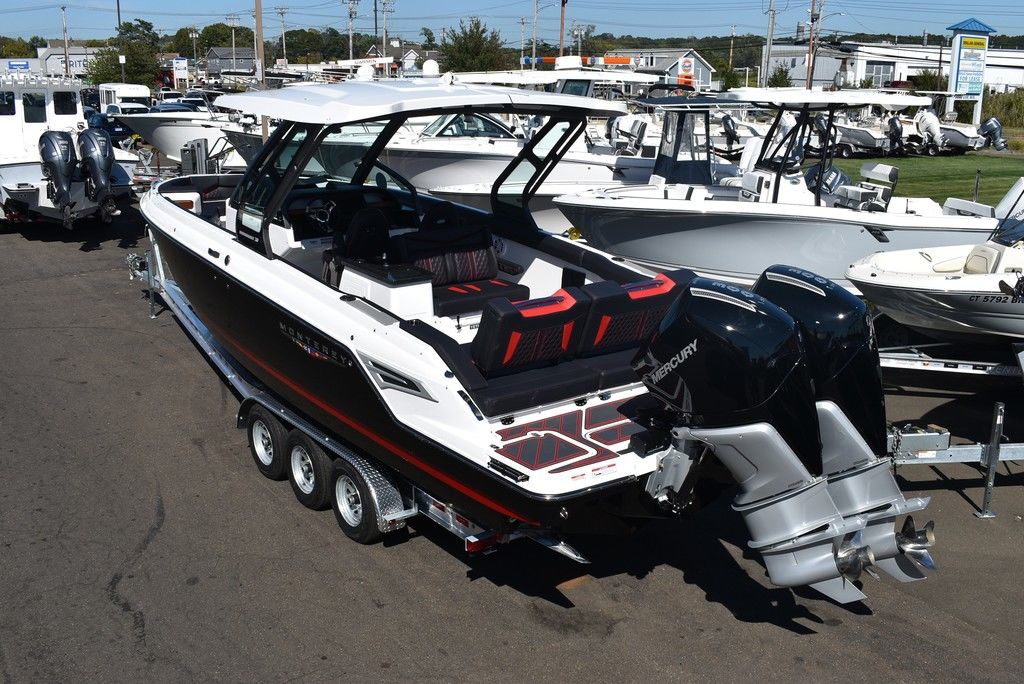 Now available, for sale by Diamond Marine of Connecticut, A Monterey dealer, 2026 Monterey Elite 30 Outboard, powered by Twin Mercury 300hp Verado's w/ Joystick and DTS. This one was ordered with the Onyx hull color and red accents throughout, Fabric interior Onyx w/ red accents, Wndlass anchor w/ stainless steel anchor, Phender Pro easy disconnect fender system, Seadeck in cockpit/swimplatform w/ red accent inlay, Aft shade, Bow cover, Aft seat cover, console cover, helm seat cover, Electric air inflator, Bow filler cushion, Macerator for toilet w/ holding tank and overboard discharge. Local trades welcome, financing available, storage till you're ready to boat. Call us at 203 466-5384 with interest.