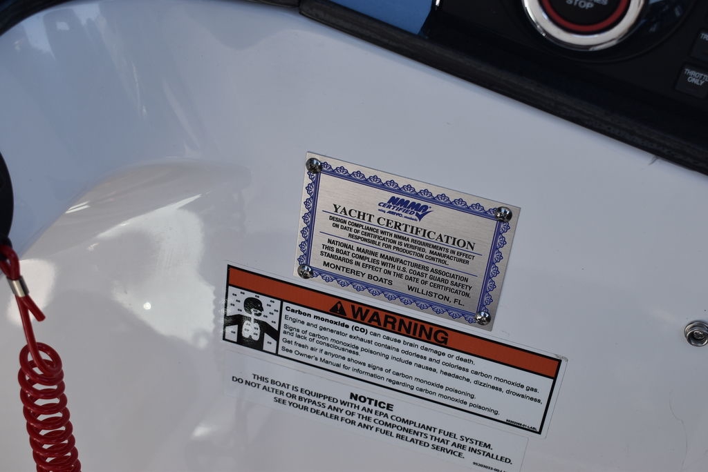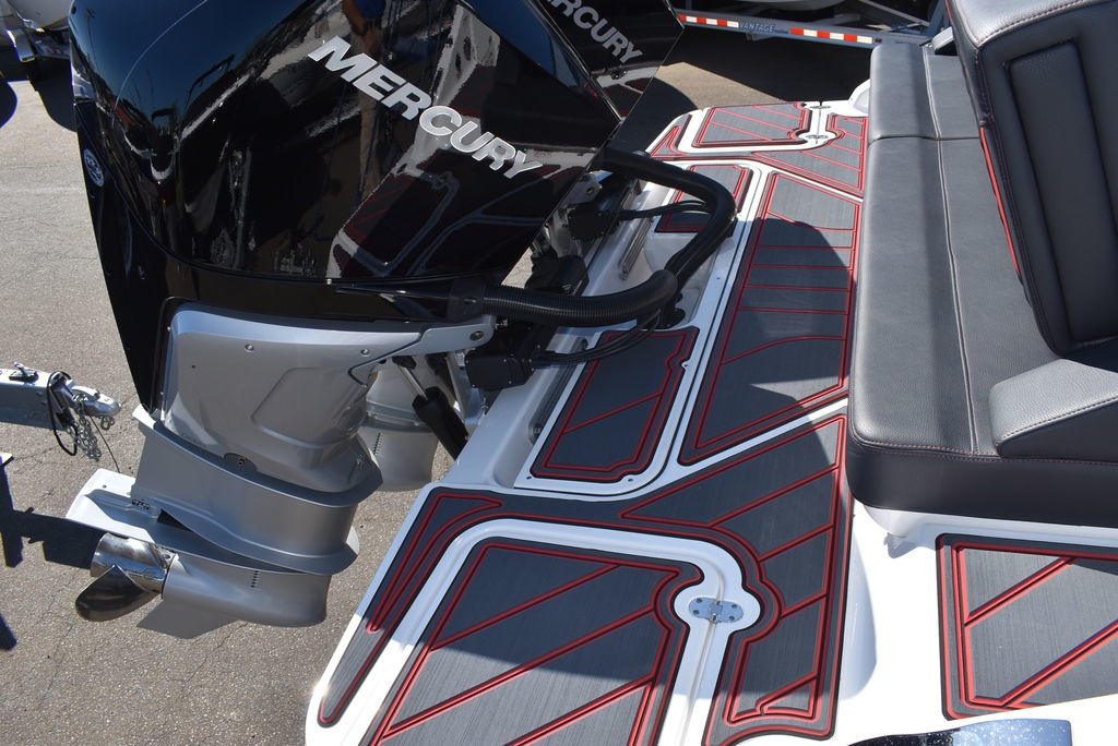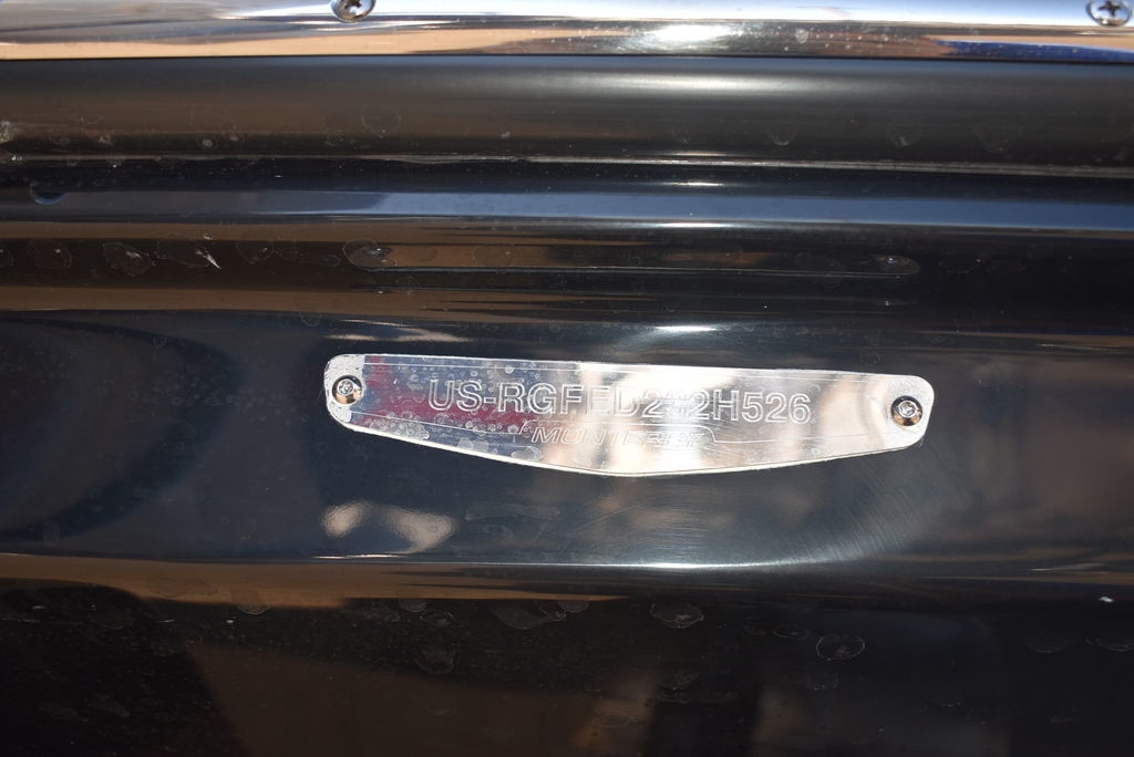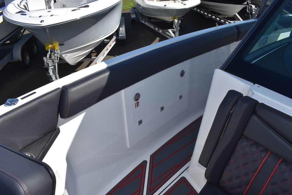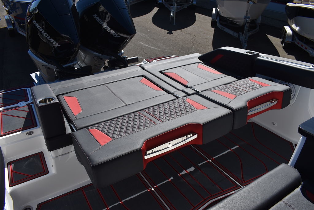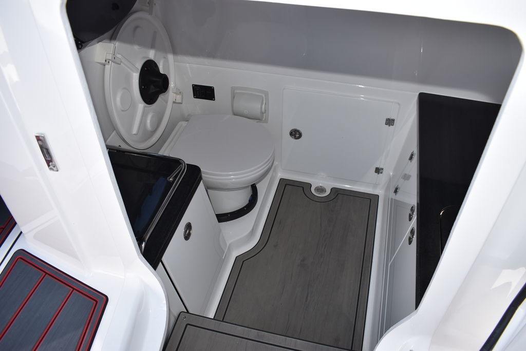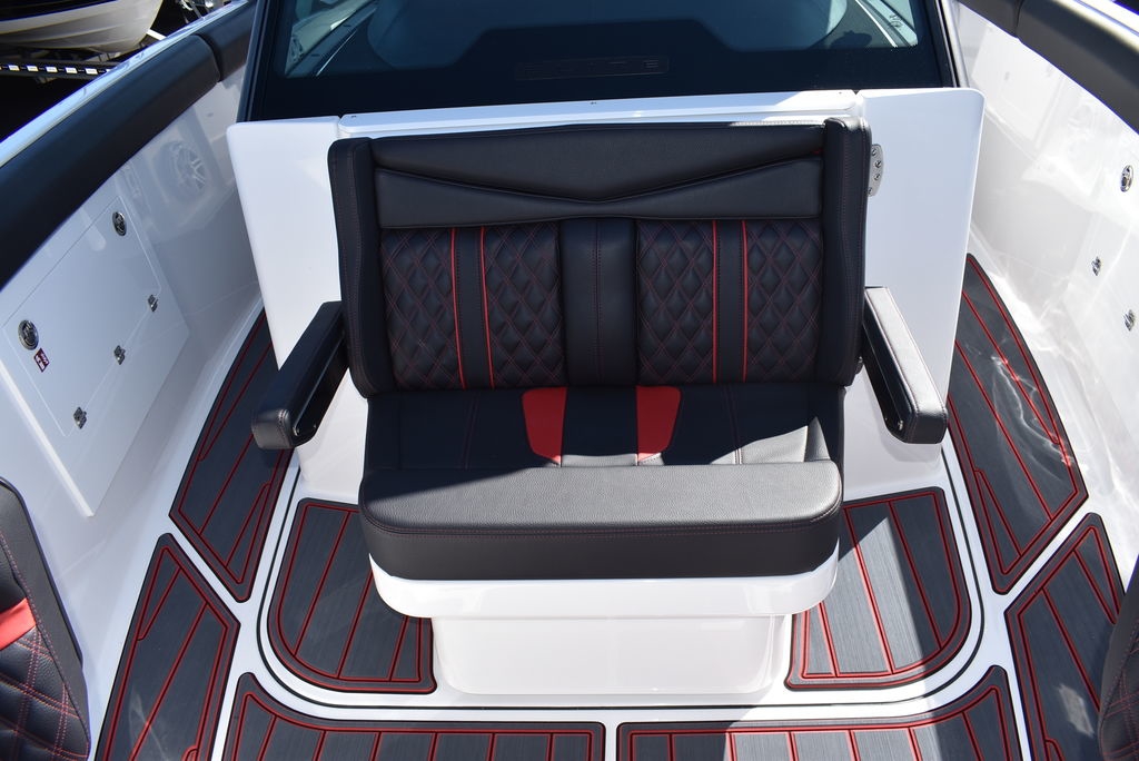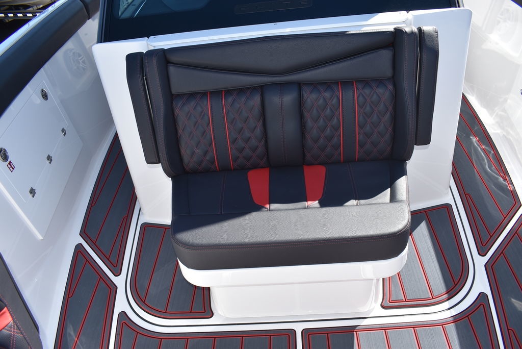 Now available, for sale by Diamond Marine of Connecticut, A Monterey dealer, 2026 Monterey Elite 30 Outboard, powered by Twin Mercury 300hp Verado's w/ Joystick and DTS. This one was ordered with the Onyx hull color and red accents throughout, Fabric interior Onyx w/ red accents, Wndlass anchor w/ stainless steel anchor, Phender Pro easy disconnect fender system, Seadeck in cockpit/swimplatform w/ red accent inlay, Aft shade, Bow cover, Aft seat cover, console cover, helm seat cover, Electric air inflator, Bow filler cushion, Macerator for toilet w/ holding tank and overboard discharge. Local trades welcome, financing available, storage till you're ready to boat. Call us at 203 466-5384 with interest.