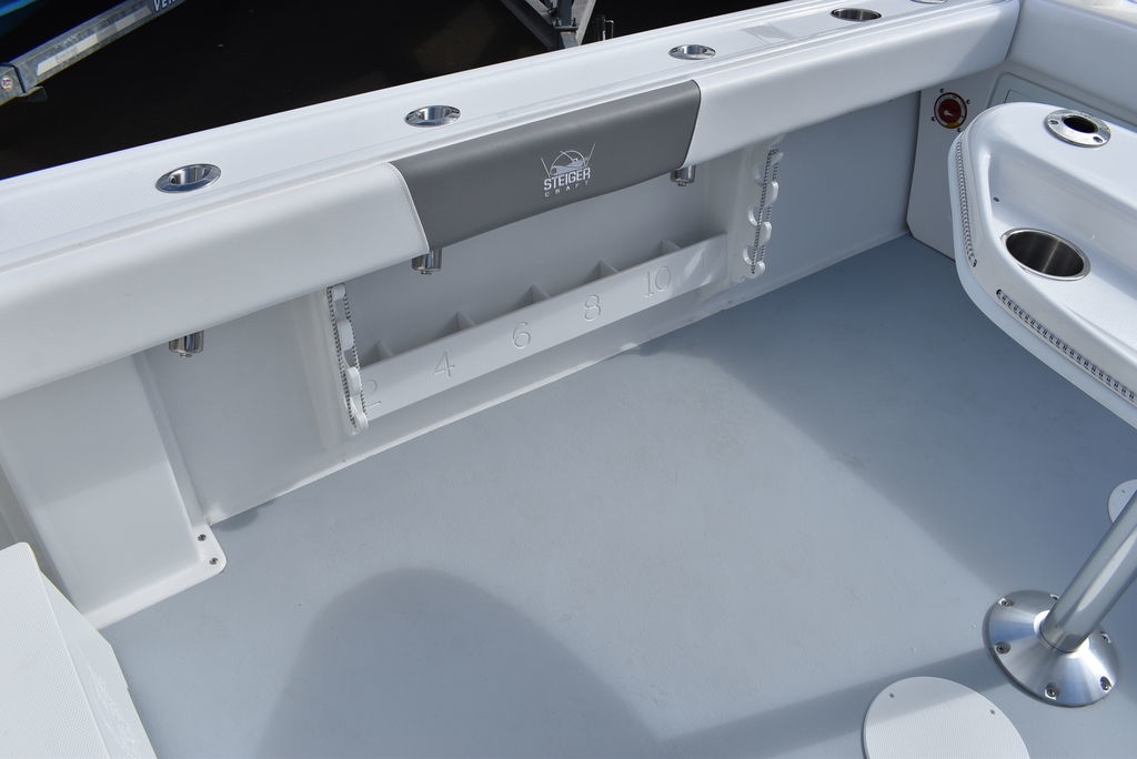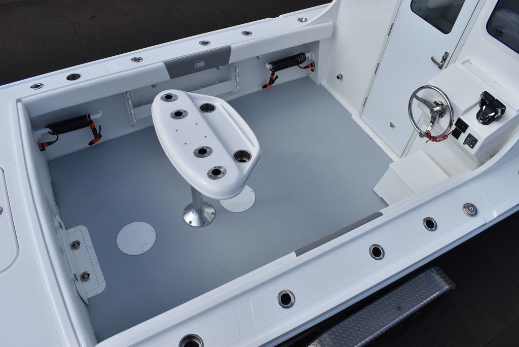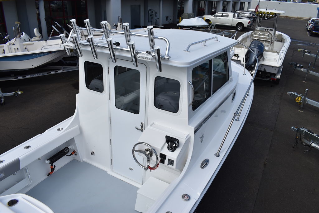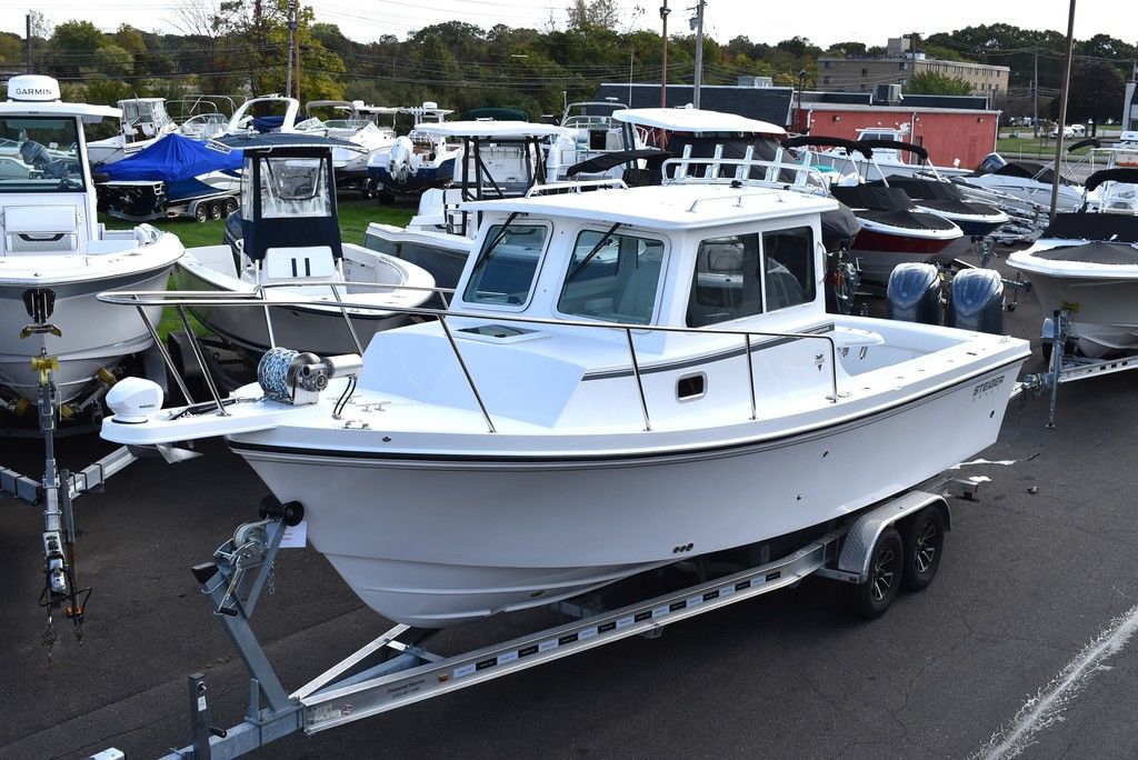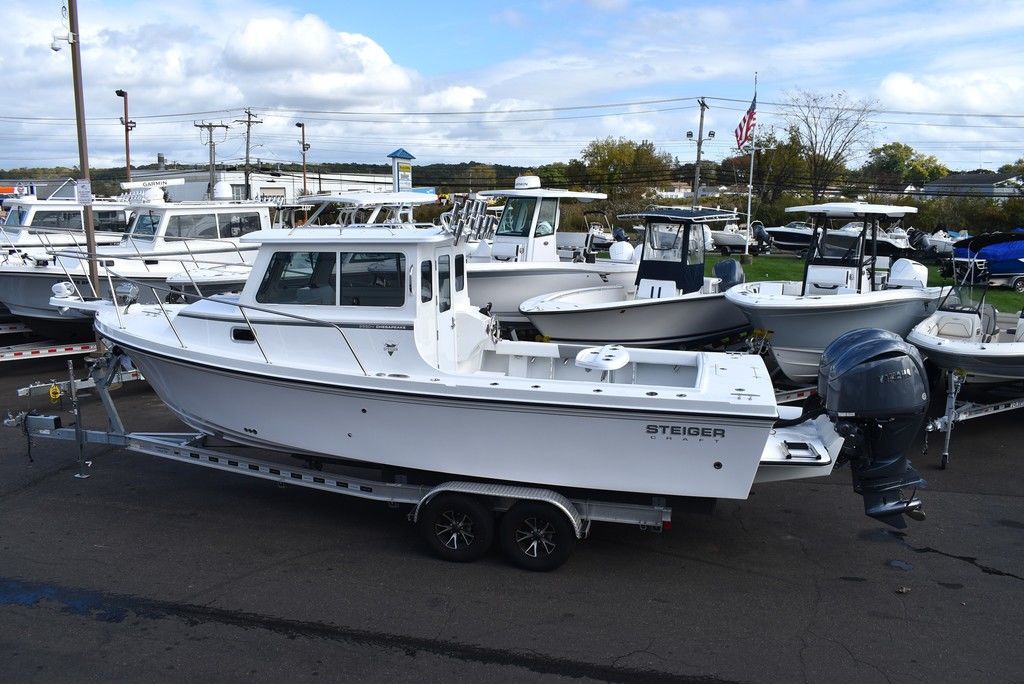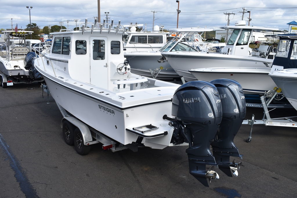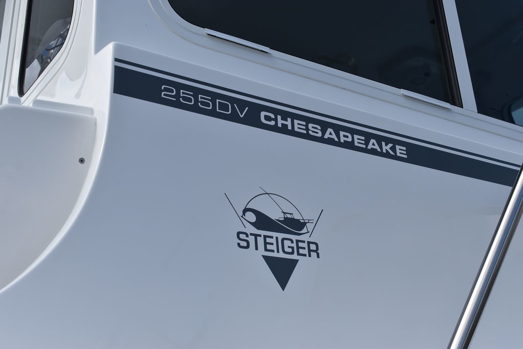 Steiger Craft, the ultimate fishing machine. 2026 Steiger Craft 255 Chesapeake pilothouse. PROVEN ROUGH WATER DESIGN. This boat is the perfect day-trip fishing boat. The Steiger 255 is also affordable to buy when compared to other boats its size. Its 8' 6" beam offers a lot of cockpit space, in a boat that will still nicely fit on a trailer. Perfect for in-shore day trips, the Miami 255 is also a real competitor 30 miles offshore. Classic styling combined with hand-laid fiberglass and a ridged I-Beam stringer system make for a true rough water performer. This one was ordered with the following optional equipment- Twin Yamaha F200's w/ Digital steering and controls, Full Chesapeake wall, Anchor drum roller, Bow thruster, Cockpit and transom bolsters, Cockpit rocket launcher fishing station, Double Rocket launcher arch on hardtop, Cockpit under gunnel lighting, Portside Pedestal seat in lieu of couch, Portside tackle cabinet, 4 Additional rodholders, Second steering station w/bow thruster control, Spotlight and gray v-berth cushions.