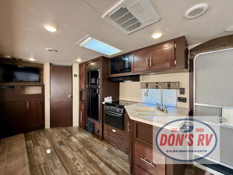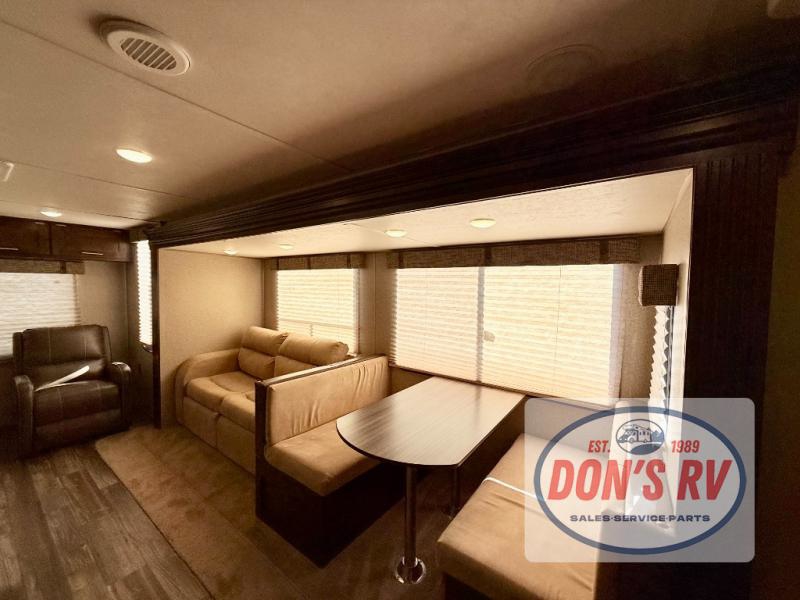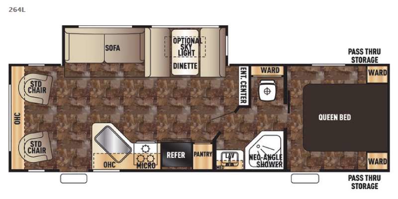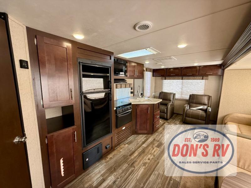 As you enter the rear entrance, along the rear wall there are two lounge chairs. The slide offers a sofa and a dinette. You will find an optional skylight above the dinette. Next to the slide there is a nice size entertainment center. The opposite side of the trailer has a large kitchen sink, three burner range, microwave, refrigerator, and pantry.