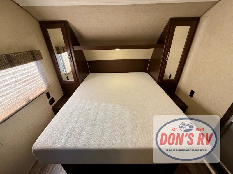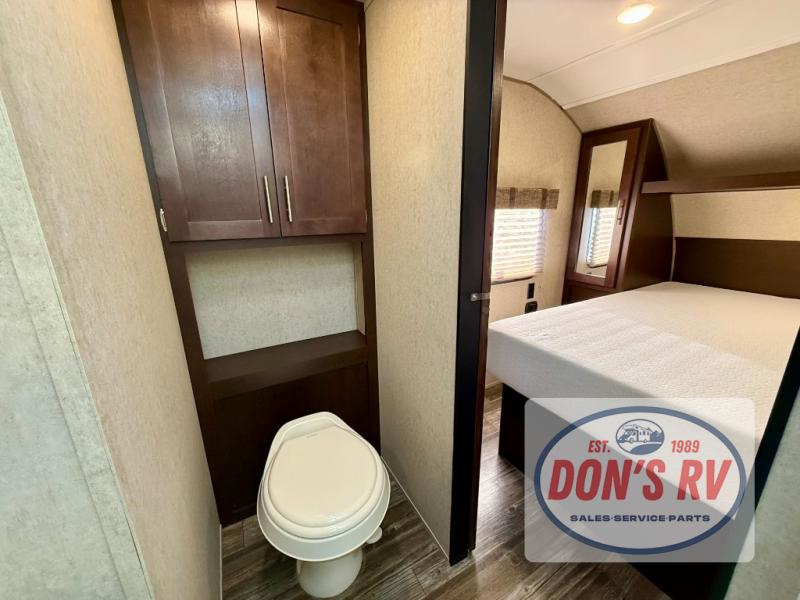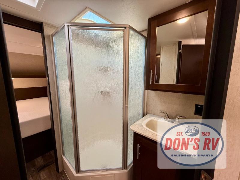 You will find that the bathroom is a walk-thru with a sink, medicine cabinet, and neo-angle shower on one side of the trailer and a toilet and wardrobe on the other side.