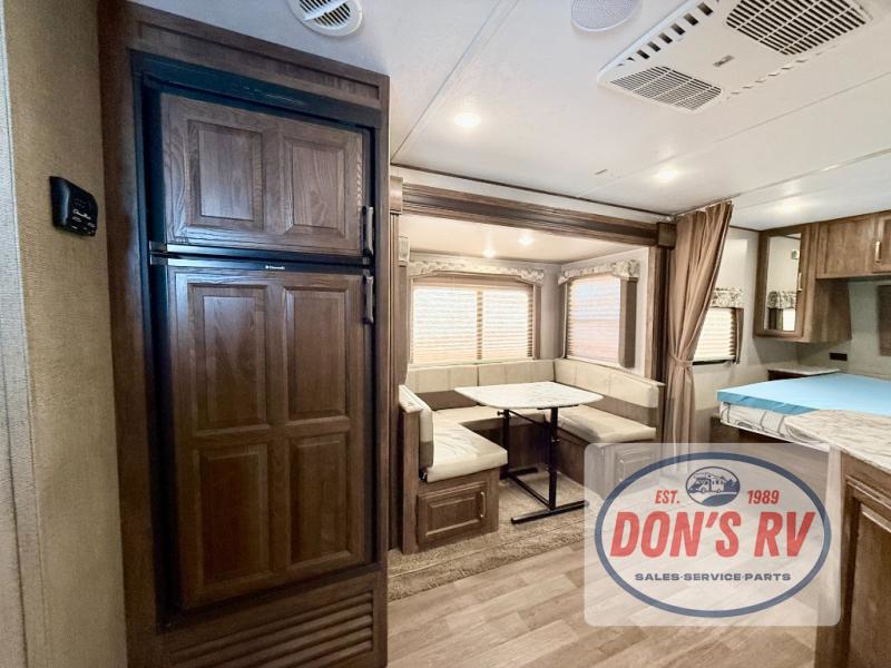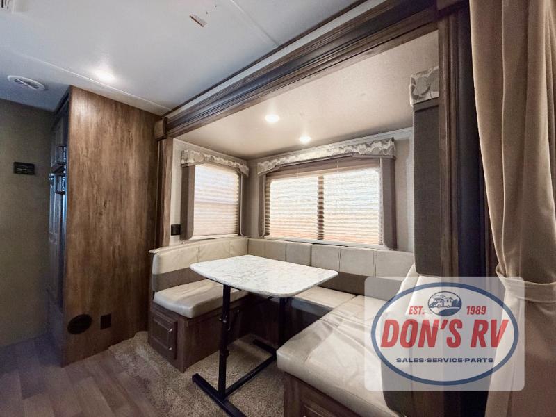 The u-shaped dinette slide offers seating for everyone during mealtime besides opening up the foot traffic space from the back to the front while the slide is fully extended. It can also be quickly transformed into sleeping space for two at night if needed. You can choose optional theater seating for two in place of the dinette if you like.