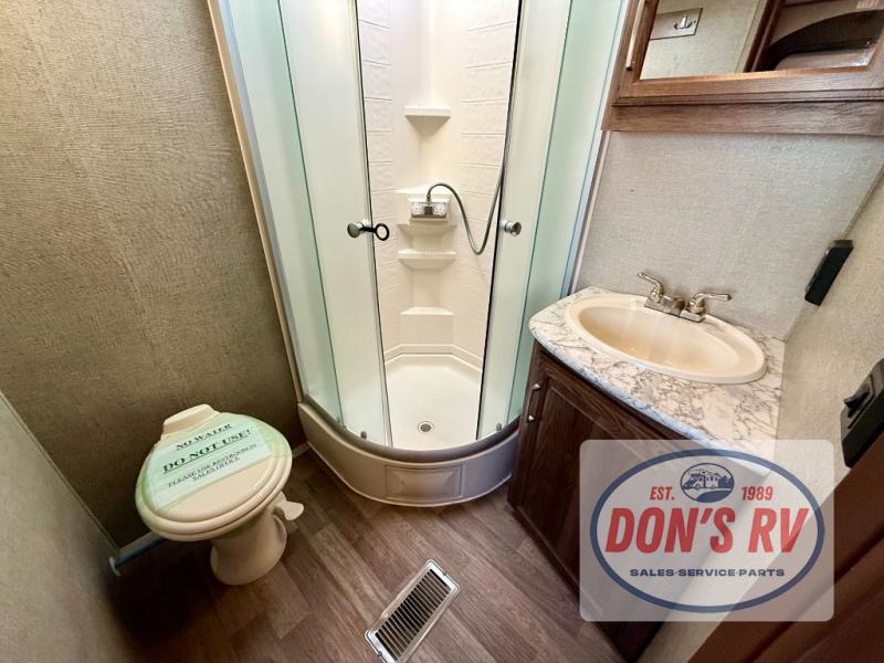 As you enter model 21RBSWE you will find a closet/pantry to the left of the door for convenient storage. Straight ahead there is a rear corner bath which provides a neo-angled shower, toilet, and sink.