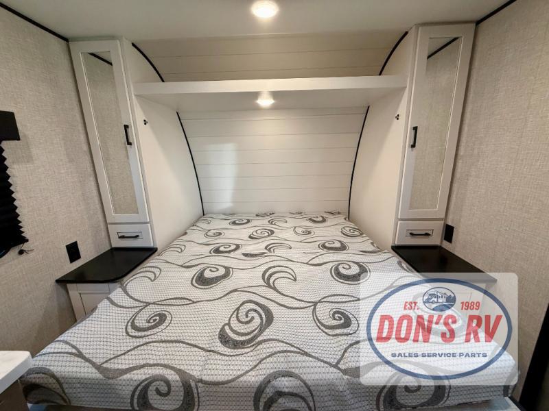 Easy to tow, setup and enjoy, this dual axle trailer offers lots of sleeping space, a booth dinette for two, and a versatile front living area and bedroom combination. You can relax on a jack-knife sofa during the daytime, and easily prepare the Murphy bed at night. You will also have two wardrobes to hang your clothes and an overhead shelf for more storage. The galley kitchen offers a 17" oven, a microwave and a refrigerator. The bathroom sink is just outside the private toilet and tub/shower room so two people can get ready at one time. And the double-size bunks will be a favorite sleeping space. There are options you might like to add such as a 15,000 BTU A/C and/or a Smart TV.