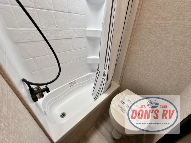 Easy to tow, setup and enjoy, this dual axle trailer offers lots of sleeping space, a booth dinette for two, and a versatile front living area and bedroom combination. You can relax on a jack-knife sofa during the daytime, and easily prepare the Murphy bed at night. You will also have two wardrobes to hang your clothes and an overhead shelf for more storage. The galley kitchen offers a 17" oven, a microwave and a refrigerator. The bathroom sink is just outside the private toilet and tub/shower room so two people can get ready at one time. And the double-size bunks will be a favorite sleeping space. There are options you might like to add such as a 15,000 BTU A/C and/or a Smart TV.
