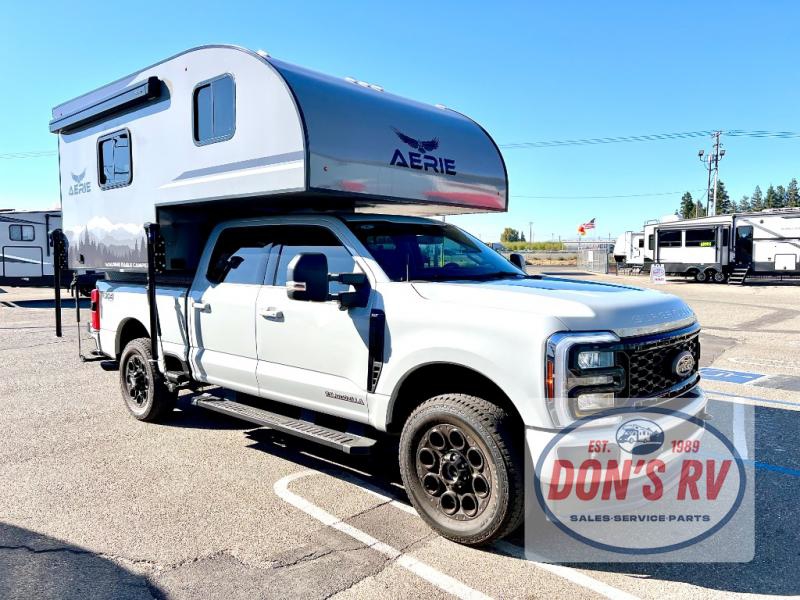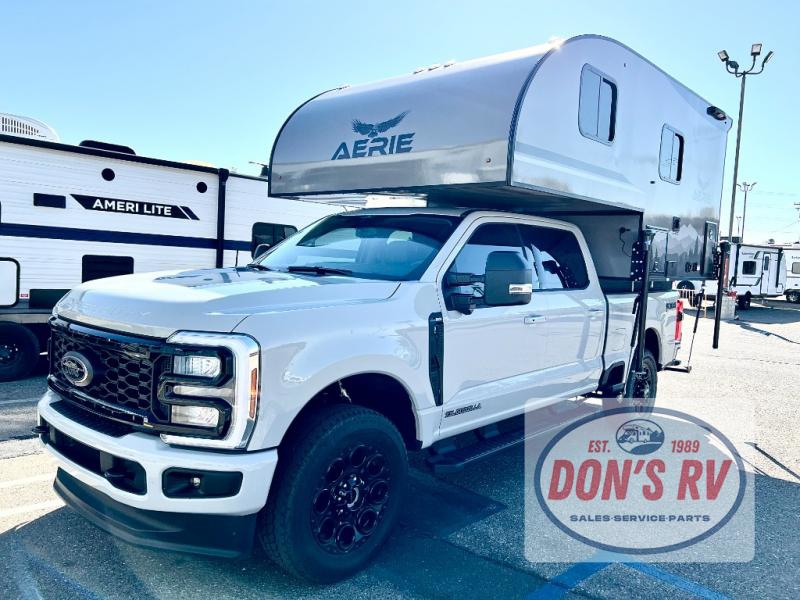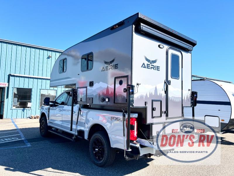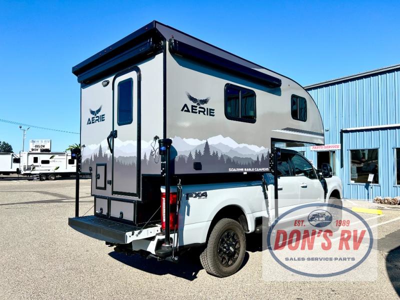 The AERIE truck camper by Soaring Eagle is engineered and constructed to stand the test of time with its welded, tubular aluminum and composites and no wood throughout! This truck camper is designed for 3/4 ton and one-ton trucks and can fit an 8' bed with the tailgate closed. This allows you to use your own rear-view camera/sensors plus built-in steps that your truck may have. You'll also appreciate the fully enclosed and heated basement design for the best installation in its class, electric jacks for easy set-up, and a 20 lb. LP tank with a gauge. The interior of the AERIE will have you feeling right at home with its open floorplan, spacious bath, functional kitchen, and generous storage spaces!