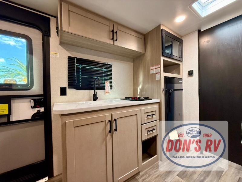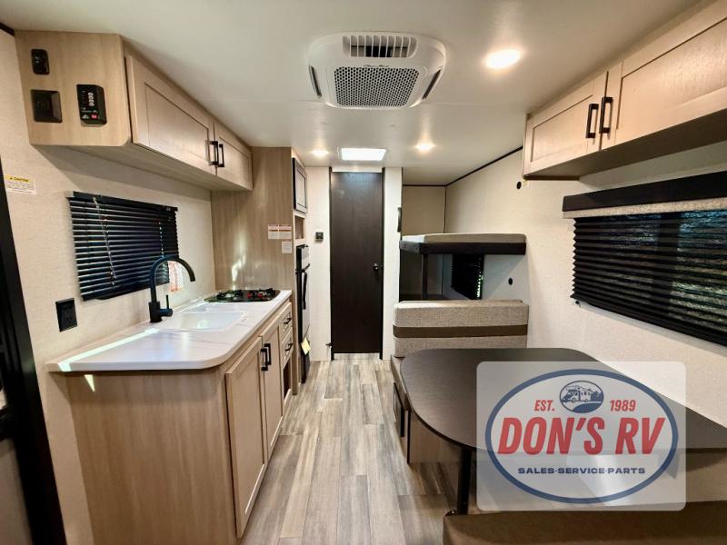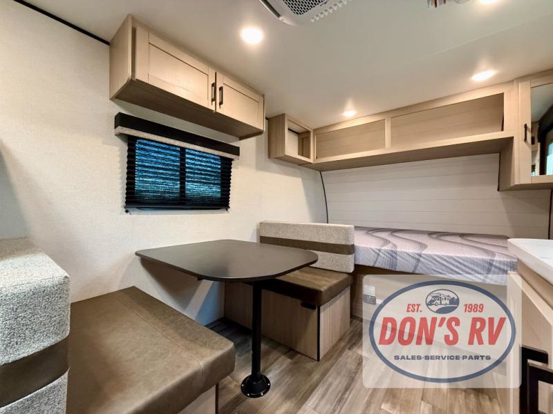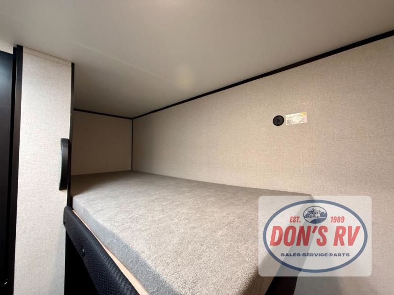 This easy to tow travel trailer features compact sleeping spaces thanks to the bunk beds in the rear corner, and the private bath is right next to the bunks for easy nighttime use! You'll have the front queen bed to yourselves, while another guest or two little ones convert the booth dinette to sleeping space. A two-burner cooktop and microwave oven will let you make meals each day, and there is a 12V refrigerator to keep your cold items fresh. Outside, you'll enjoy the 10' power awning for added shade, and there is exterior storage to keep fishing poles, hiking gear and more!
