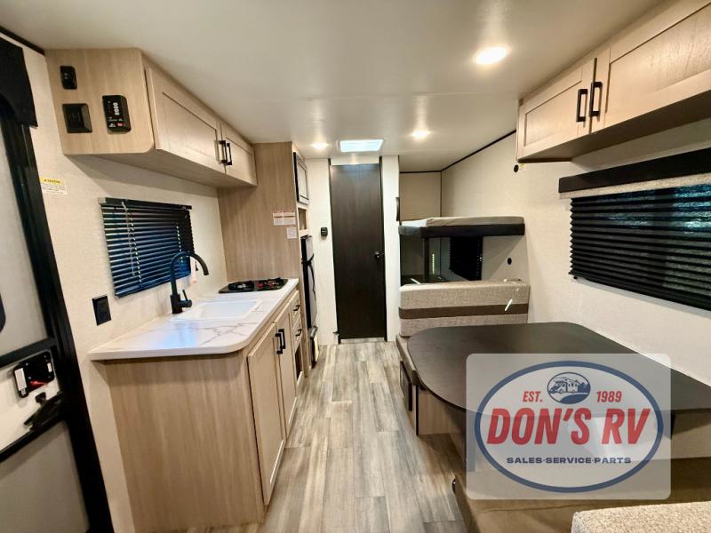 This easy to tow travel trailer features compact sleeping spaces thanks to the bunk beds in the rear corner, and the private bath is right next to the bunks for easy nighttime use! You'll have the front queen bed to yourselves, while another guest or two little ones convert the booth dinette to sleeping space. A two-burner cooktop and microwave oven will let you make meals each day, and there is a 12V refrigerator to keep your cold items fresh. Outside, you'll enjoy the 10' power awning for added shade, and there is exterior storage to keep fishing poles, hiking gear and more!