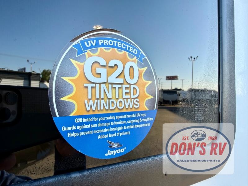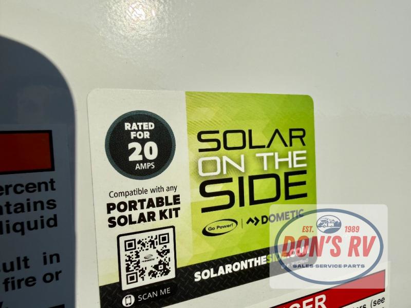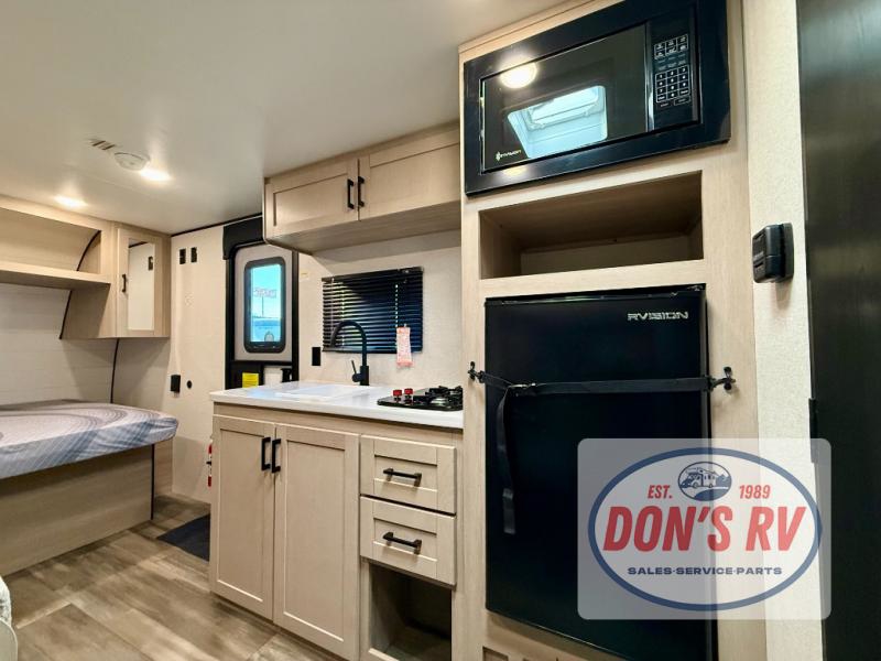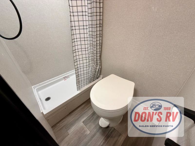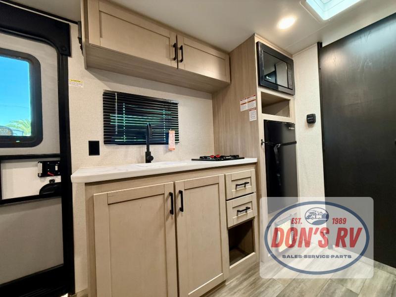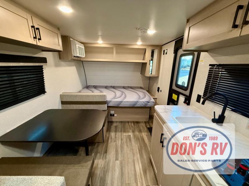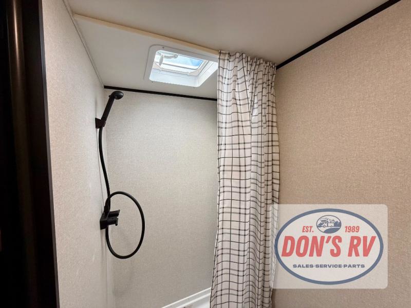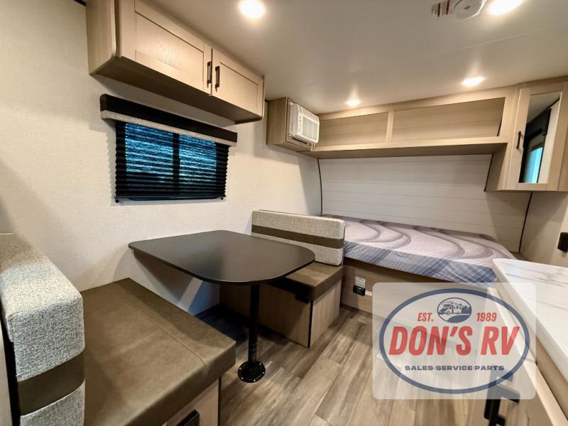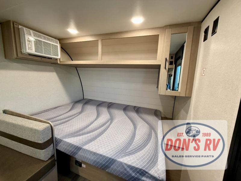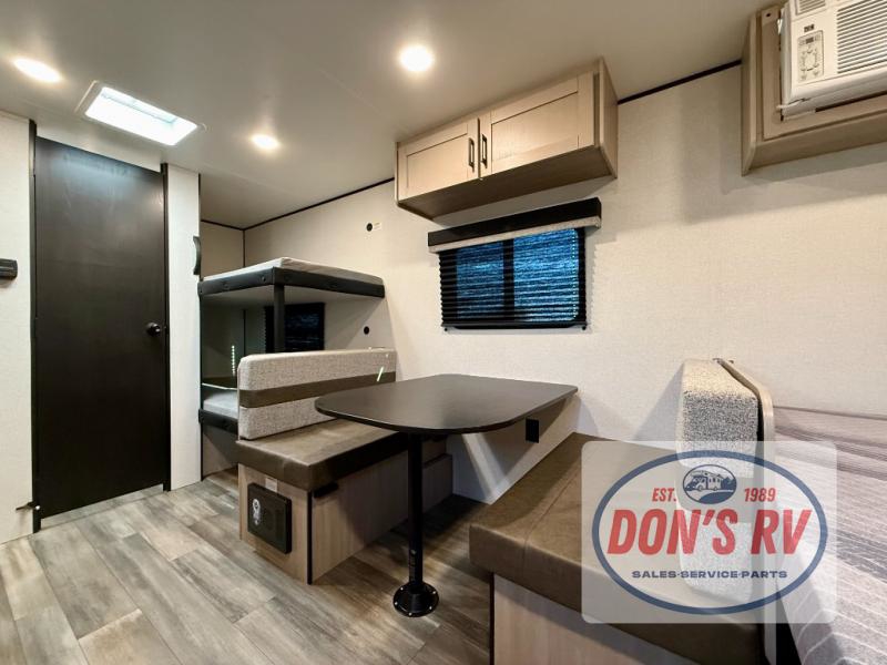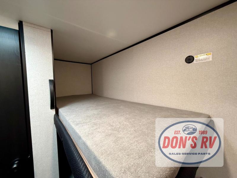 This easy to tow travel trailer features compact sleeping spaces thanks to the bunk beds in the rear corner, and the private bath is right next to the bunks for easy nighttime use! You'll have the front queen bed to yourselves, while another guest or two little ones convert the booth dinette to sleeping space. A two-burner cooktop and microwave oven will let you make meals each day, and there is a 12V refrigerator to keep your cold items fresh. Outside, you'll enjoy the 10' power awning for added shade, and there is exterior storage to keep fishing poles, hiking gear and more!