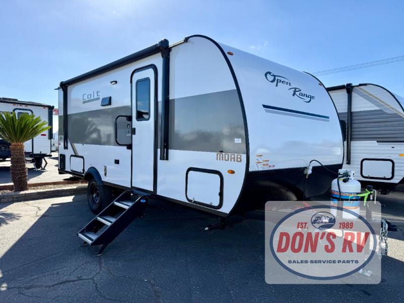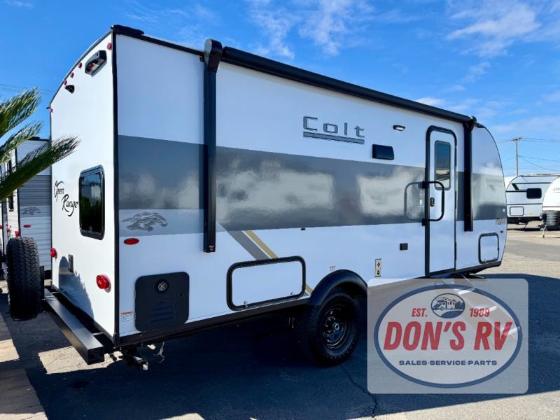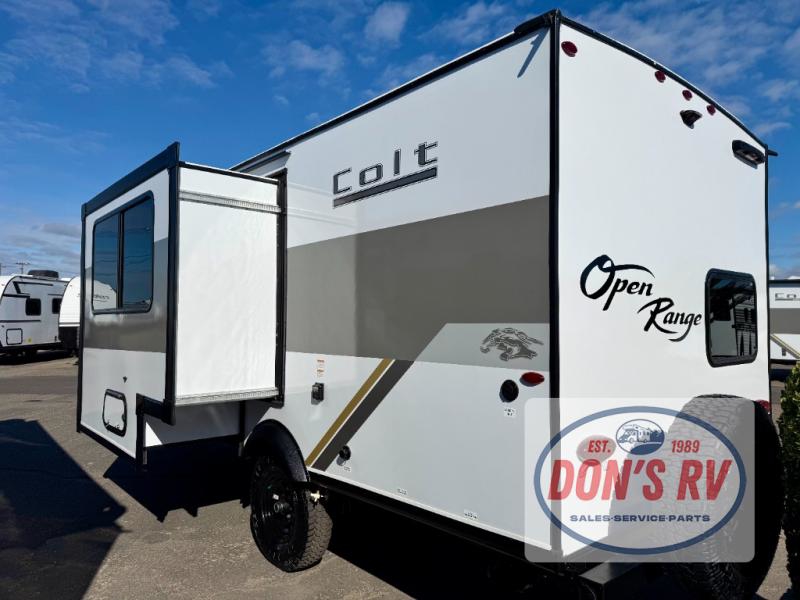 With any Colt travel trailer by Open Range RV, you can be sure you're getting a budget-friendly unit designed to fit your lifestyle! Each one is built to last with a PVC roofing membrane and built-in A-frame, plus there are nitrogen-filled radial tires and self-adjusting electric brakes for easy towing. You will appreciate the utilities that include 30-amp service, an A/C unit, and an on-demand tankless water heater. A few interior comforts include vinyl flooring throughout, solid hardwood cabinet doors, and residential grade kitchen countertops to make your space feel more like home. There are additional features available, depending on the edition you choose, along with available options to further customize your Colt travel trailer!