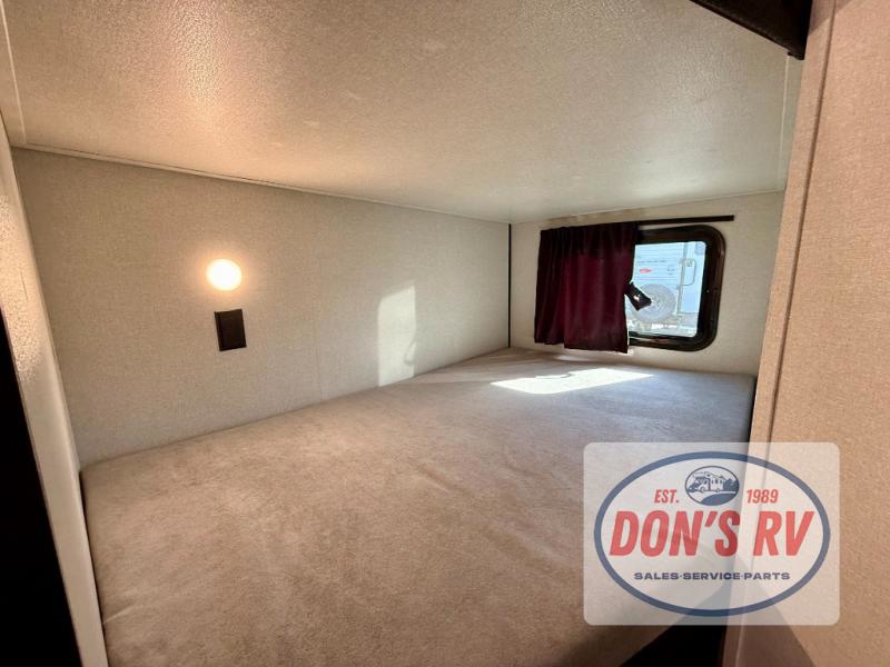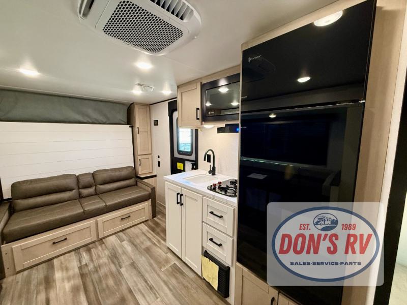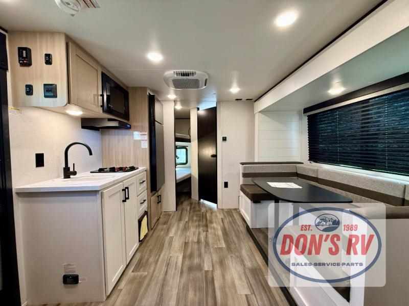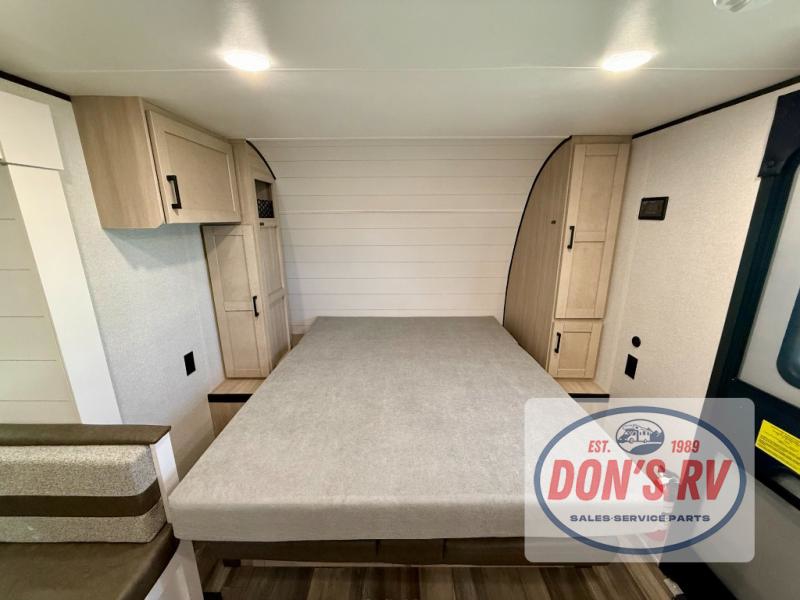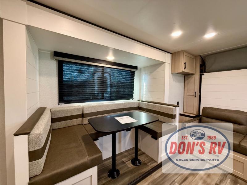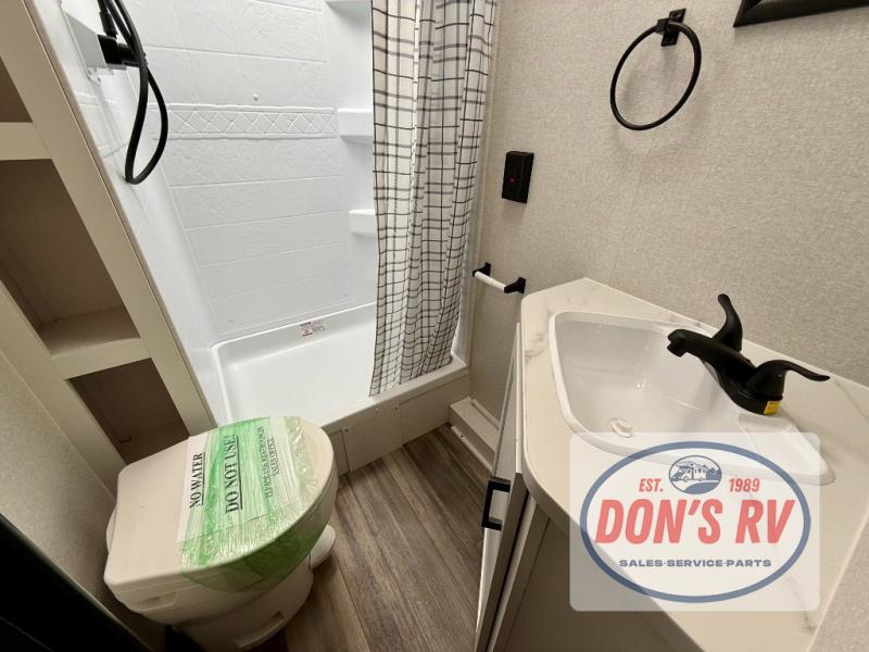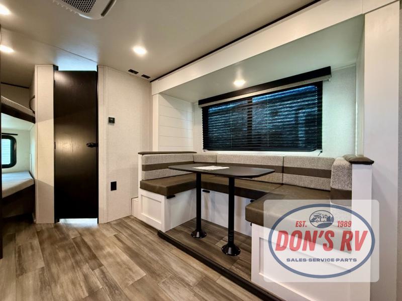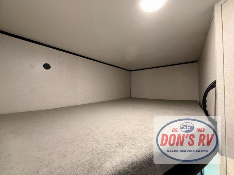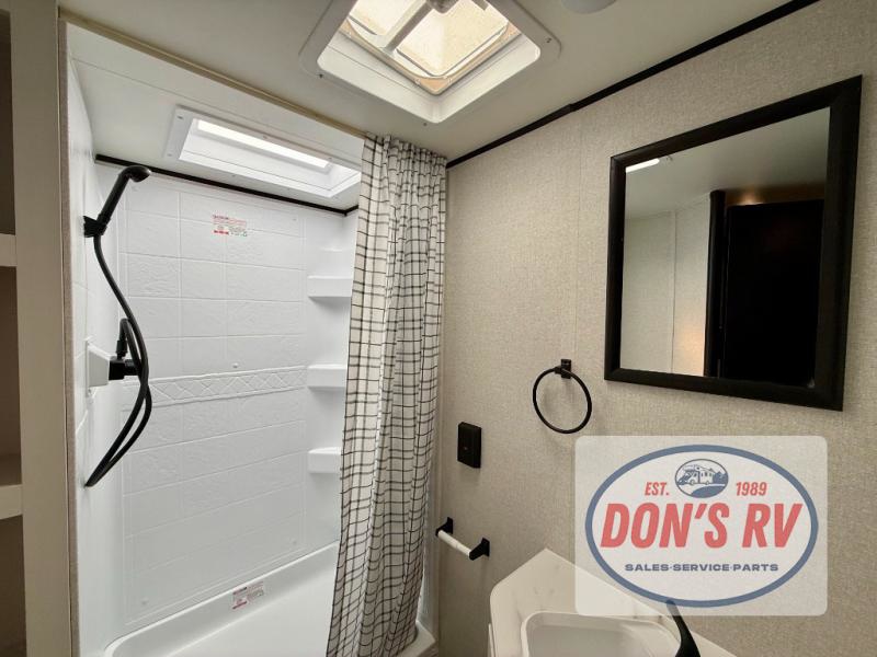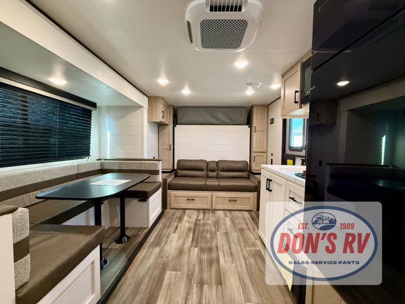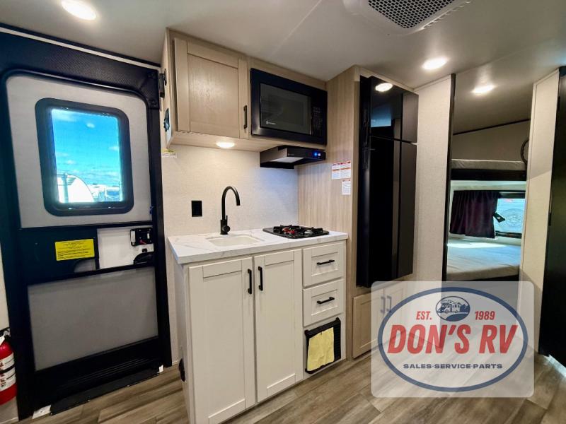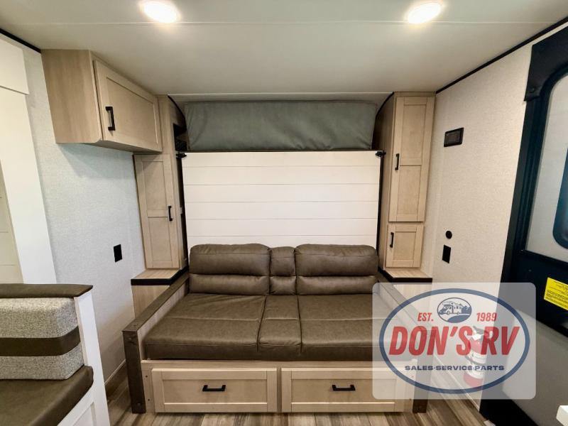This travel trailer features compact sleeping spaces thanks to the double-size bunk beds in the rear corner, and the private full bath is right next to the bunks for easy nighttime use! You'll have the front Murphy bed all to yourselves, and in the morning, you can fold it away to sit on the jack-knife sofa. A cooktop and microwave oven will let you make meals each day, and there is a 12V refrigerator to keep your cold items fresh. Outside, you'll enjoy the 13' power awning for added shade, and there are two exterior storage compartments to keep fishing poles, hiking gear and more!