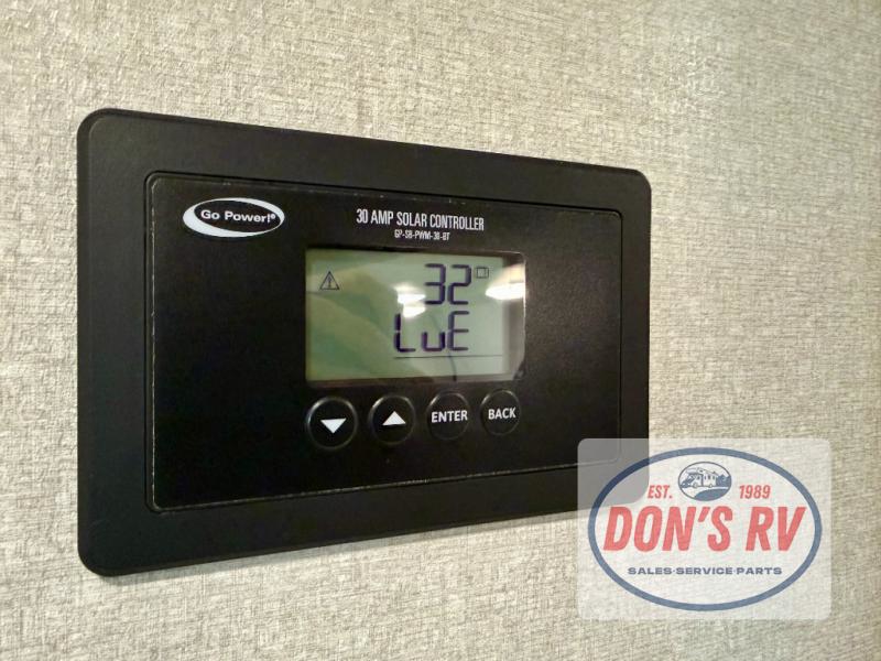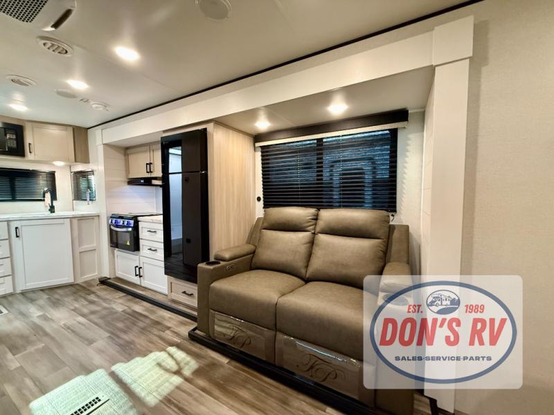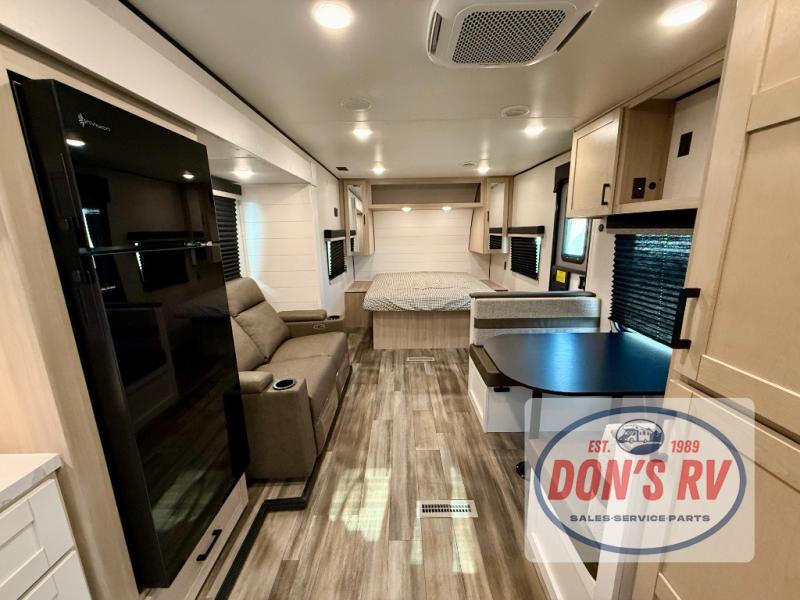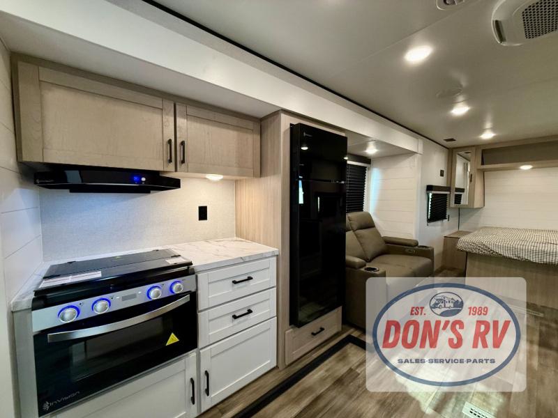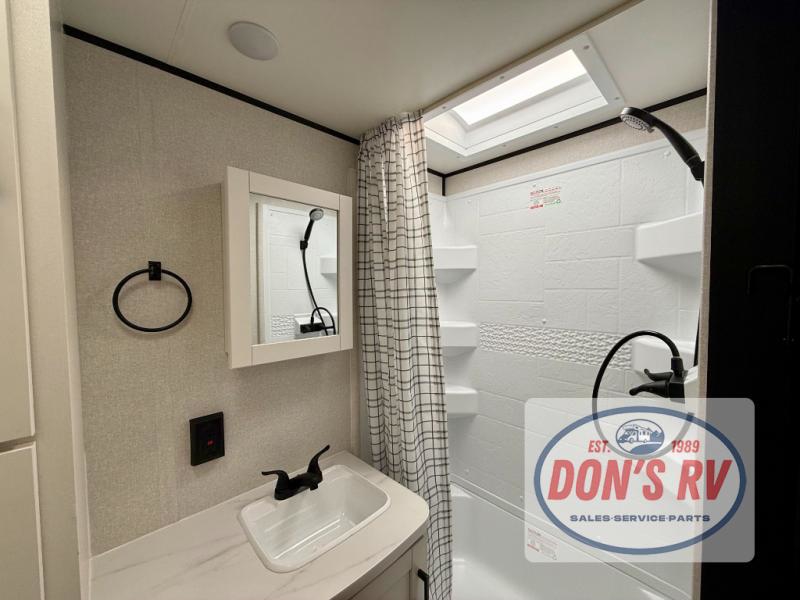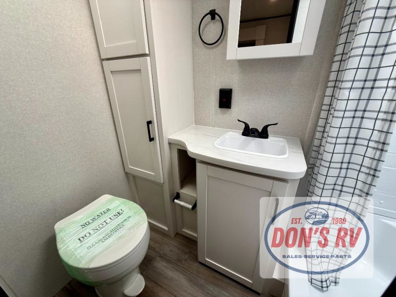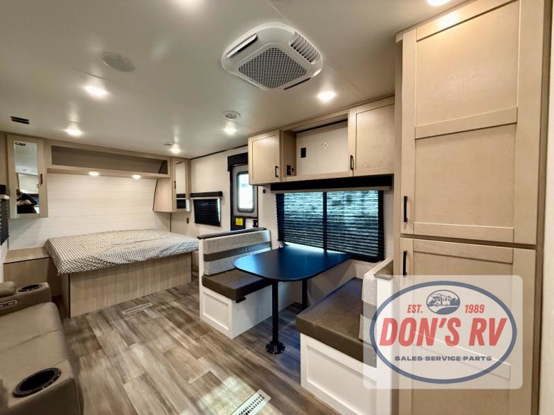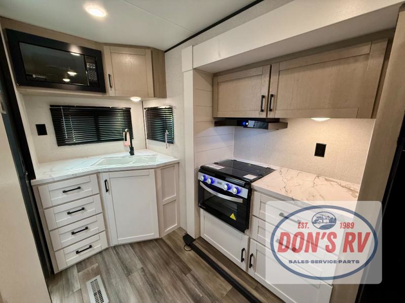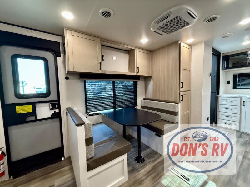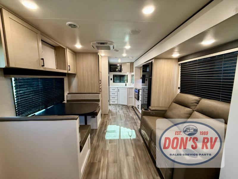 This travel trailer is perfect for weekend trips to the lake! Once you arrive at the campground, you can unload the exterior storage, put out the 18' power awning with LED lights, then relax in your camp chairs. Head inside to make lunch on the three-burner cooktop in the rear corner kitchen, and you'll find the full bath in the other rear corner for quick access. A booth dinette provides a place to dine together, and a theater seat within the large slide out is sure to bring comfort. This unit includes a queen bed in the front semi-private bedroom with a privacy curtain and dual wardrobes for your things!