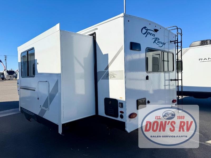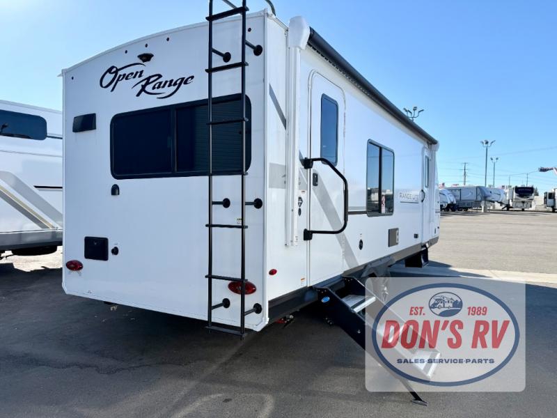 With any Range Lite travel trailer by Open Range RV, you will enjoy comfort and convenience at every turn! Each one is built with vacuum bonded sidewalls with interior and exterior Azdel, a 2" TuffShell floor, and front diamond plating to help protect against rock and debris on the way to the campground. The Xtend l Solar Package includes a 200-watt solar panel with a 30-amp solar controller for off-grid capabilities, and you're sure to appreciate the tankless water heater onboard for endless hot showers. Head inside to enjoy residential cabinetry with large doors and drawers, roller shades with radiant barrier backer, Invision kitchen appliance package, and many more comforts! Choose the optional Legacy Package for a molded front cap, 5-point power stabilization system, solid surface countertops, and more optional features to further customize your travel trailer!