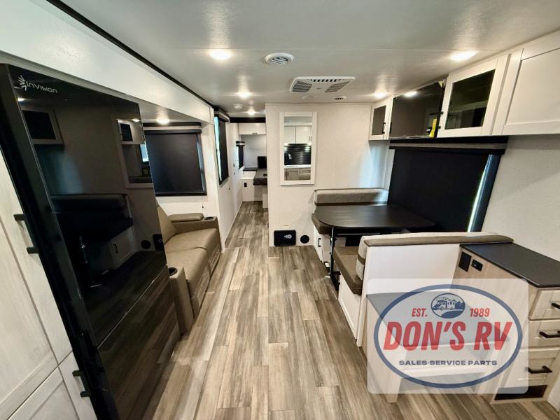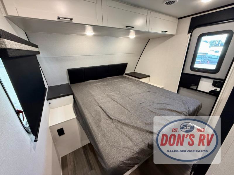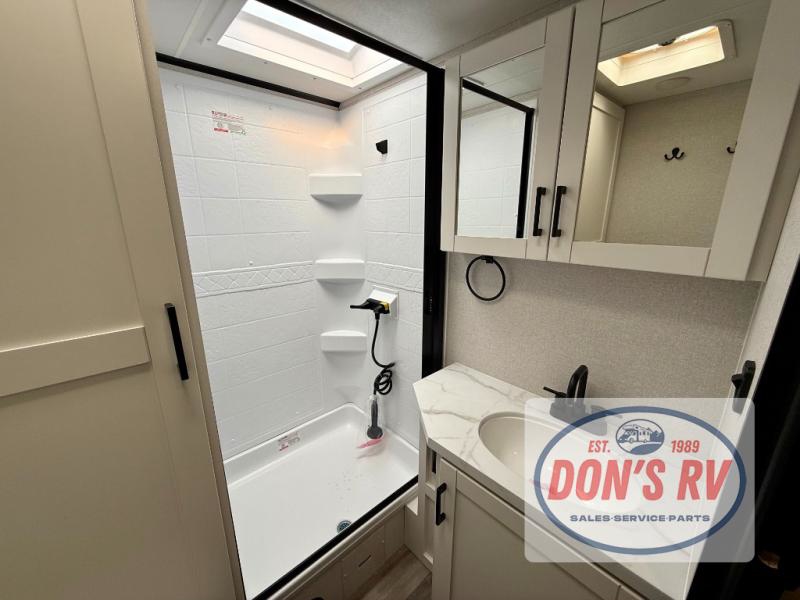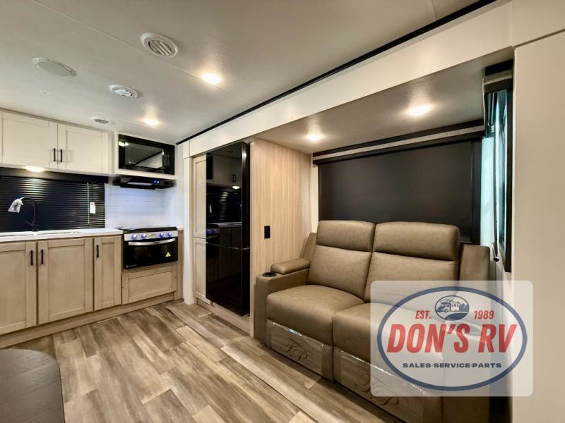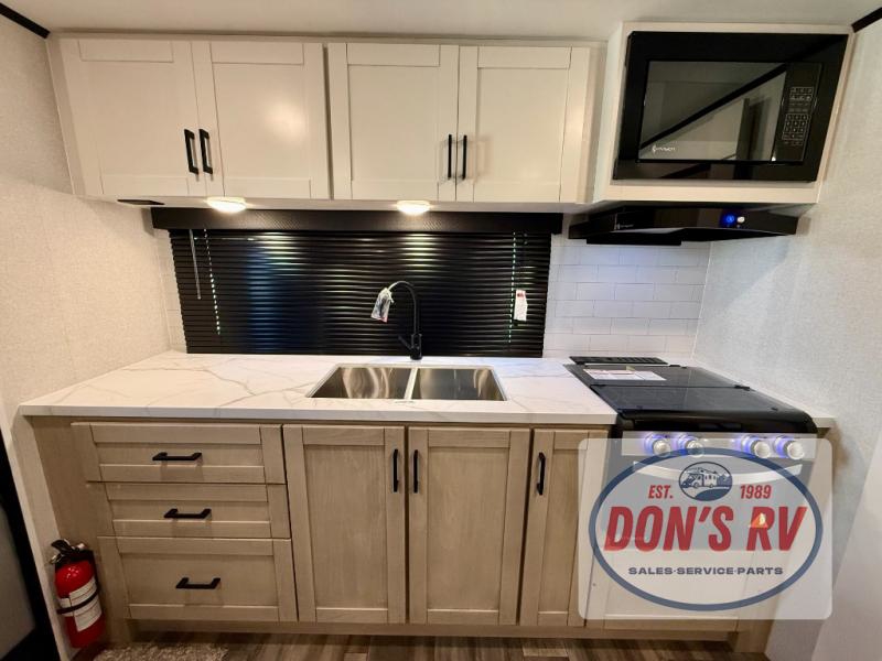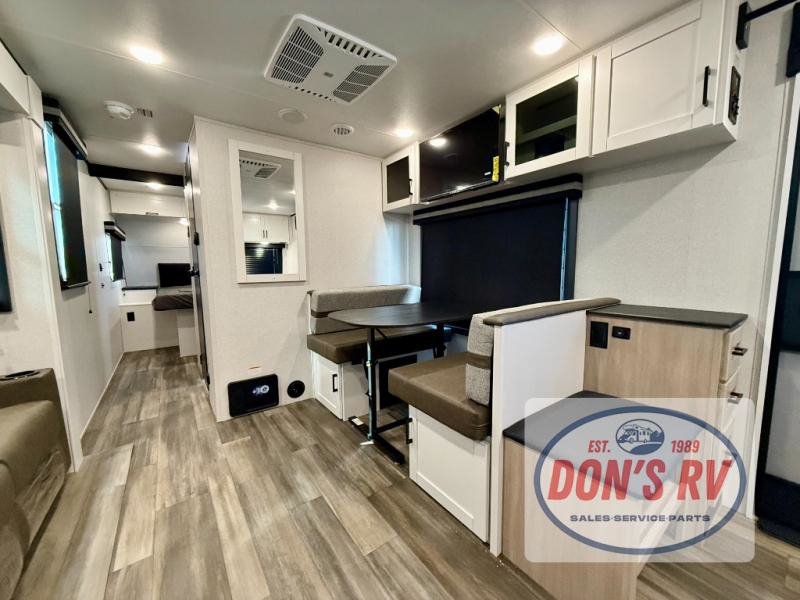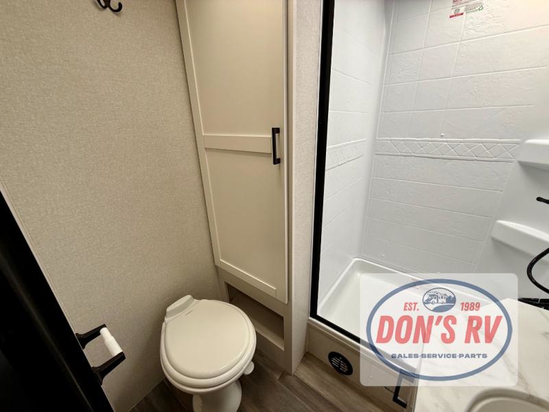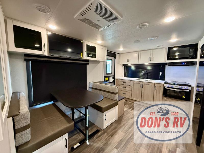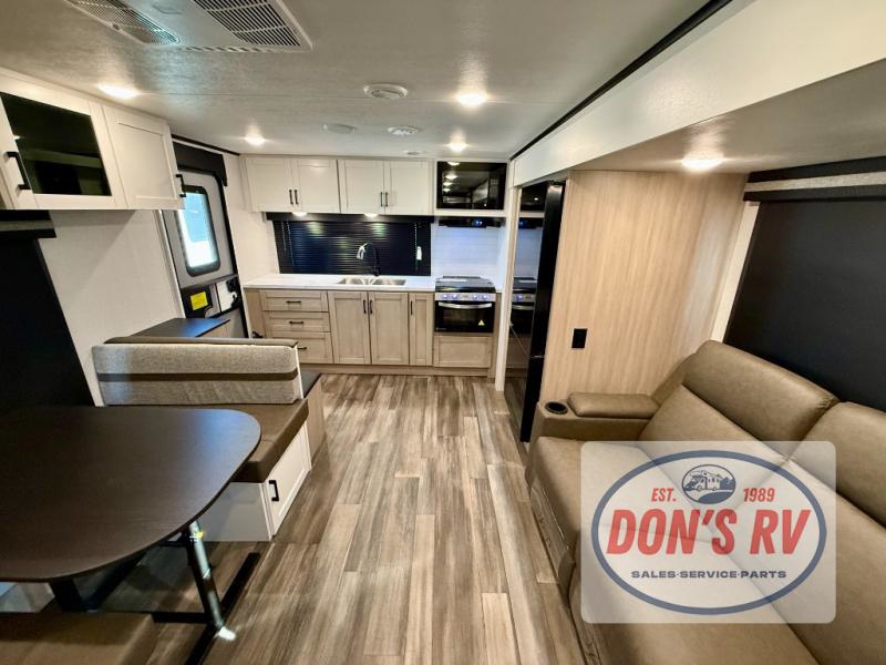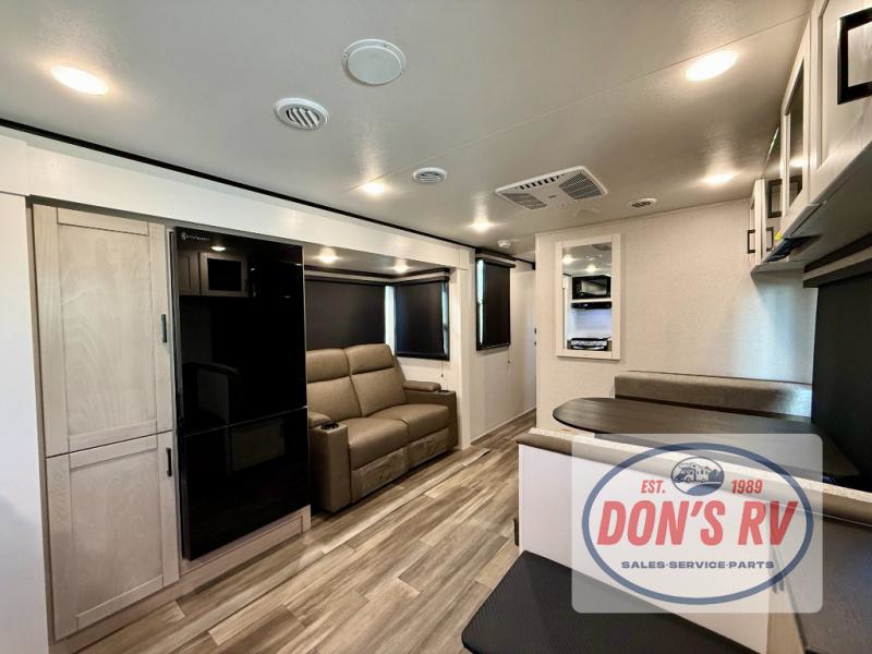 It won't be hard to find comfort in this dual entry travel trailer! The front private bedroom includes one of those entry doors, along with a queen bed, dual nightstands, and overhead storage. A full bath is centrally located for easy use day and night, and you'll appreciate linen storage here to keep towels organized. Head to the rear kitchen where you'll find ample counter space to prep meals, plus a pantry and 12V refrigerator within the large slide out. There is a booth dinette and theater seat for comfortable seating spaces when you don't want to sit outdoors under the 20' power awning!