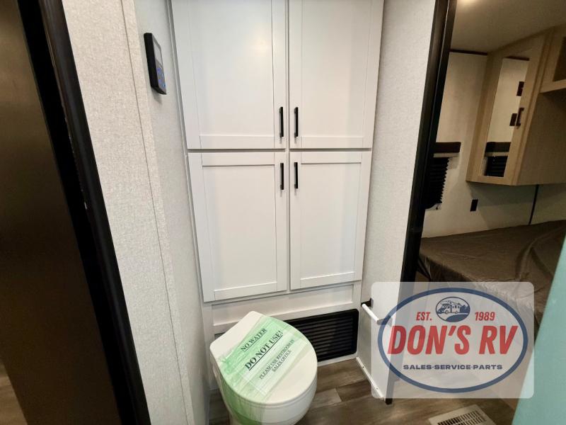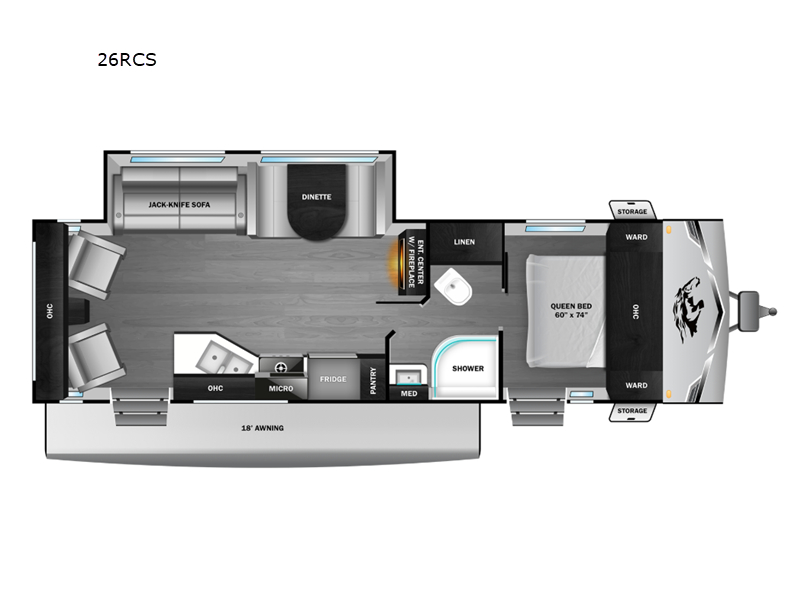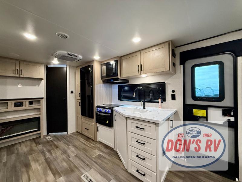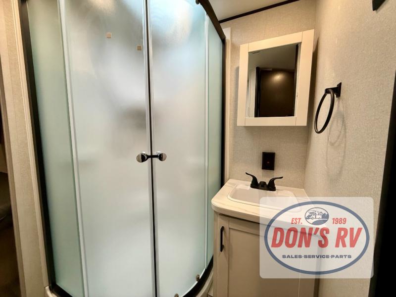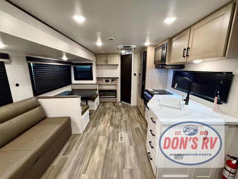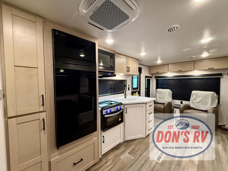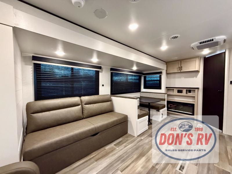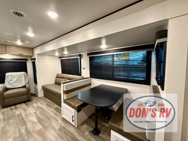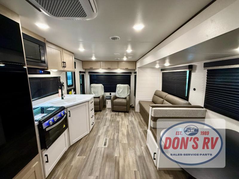 With dual entry doors in this unit, you can enter in through the front master bedroom or the rear living room! The dual lounge chairs in the back will let you relax with a book and your coffee, and there is a large slide out with a jack-knife sofa and booth dinette for additional seating spaces. The chef of your group can make meals on the three-burner cooktop or in the microwave oven, and there is a pantry for dry goods or snacks. The walk-thru bath is easily accessible for everyone to use, and the front master bedroom with a 60" x 74" RV queen bed will make you feel right at home!