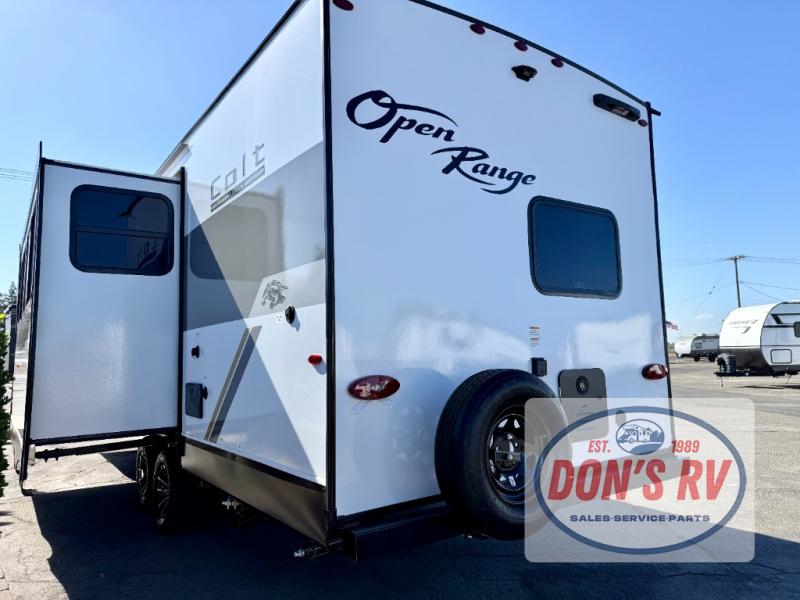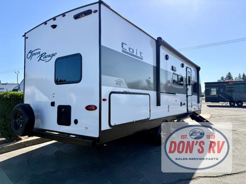 With any Colt travel trailer by Open Range RV, you can be sure you're getting a budget-friendly unit designed to fit your lifestyle! Each one is built to last with a PVC roofing membrane and built-in A-frame, plus there are nitrogen-filled radial tires and self-adjusting electric brakes for easy towing. You will appreciate the utilities that include 30-amp service, an A/C unit, and an on-demand tankless water heater. A few interior comforts include vinyl flooring throughout, solid hardwood cabinet doors, and residential grade kitchen countertops to make your space feel more like home. There are additional features available, depending on the edition you choose, along with available options to further customize your Colt travel trailer!