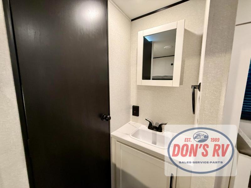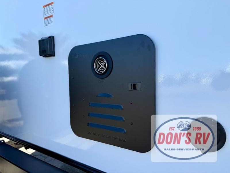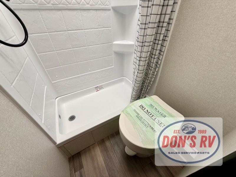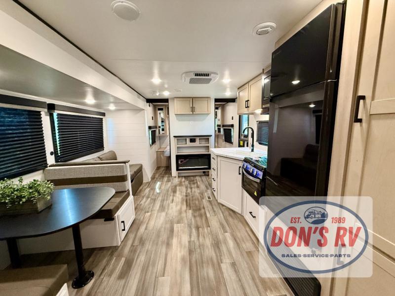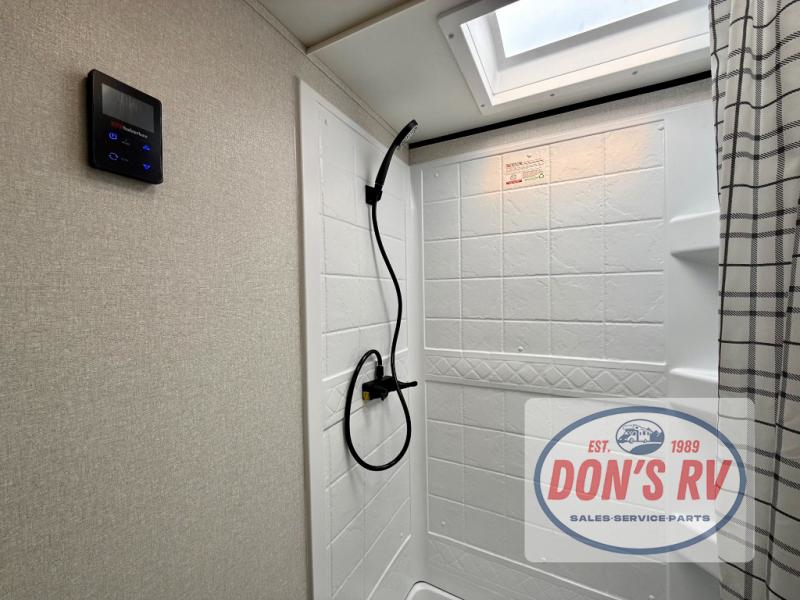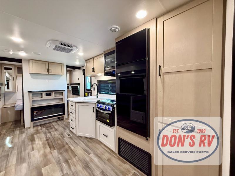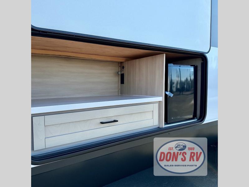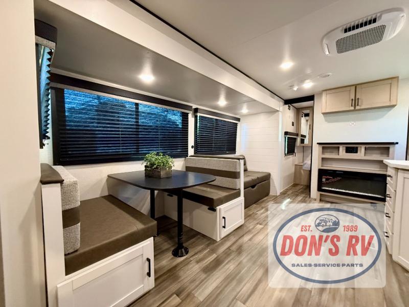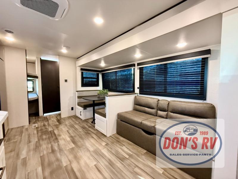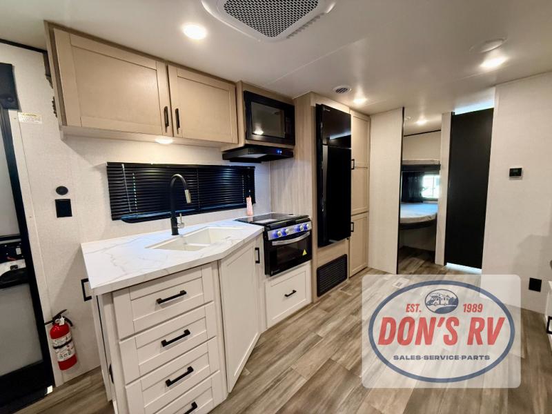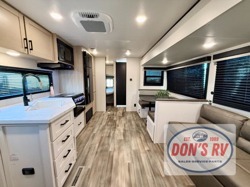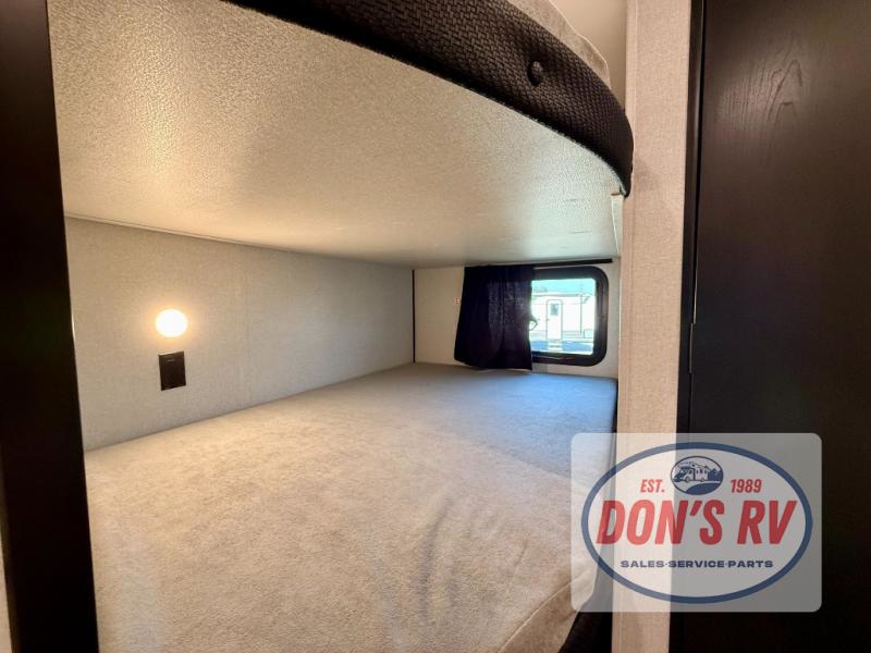 This travel trailer with double-size bunks is spacious and cozy! Once you've unloaded the exterior storage, your crew can put out the 16' power awning with LED lights, then start lunch on the outside kitchen. If the weather isn't cooperating, there is a three-burner cooktop and microwave oven inside, plus comfortable seating on the jack-knife sofa and booth dinette. You're sure to appreciate the front private bedroom with an RV queen bed, dual wardrobes, plus an overhead shelf for books, and the rear corner full bath will let everyone freshen up each day!