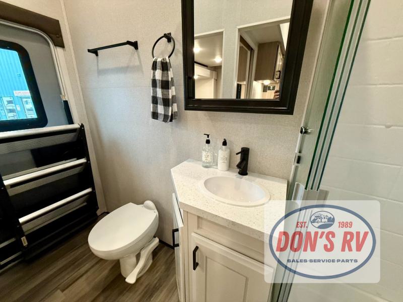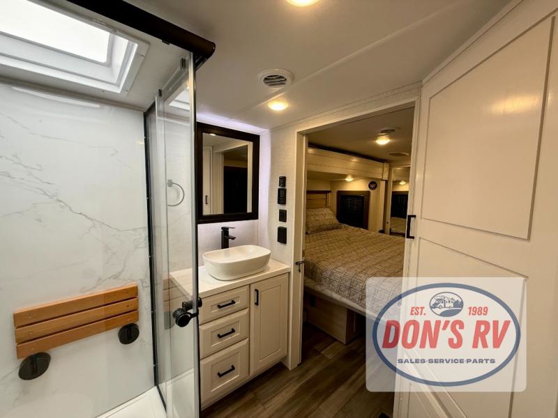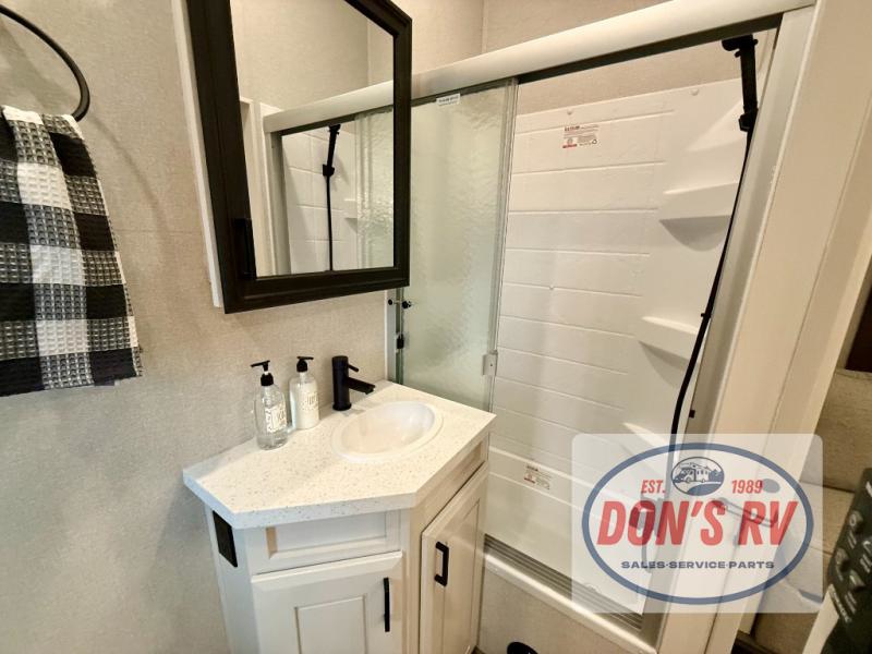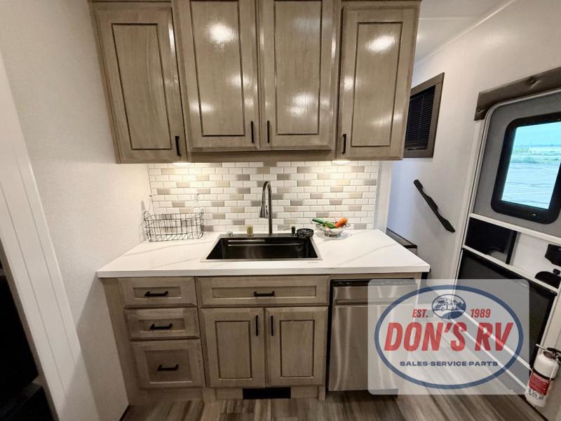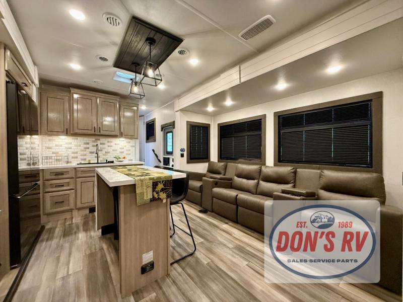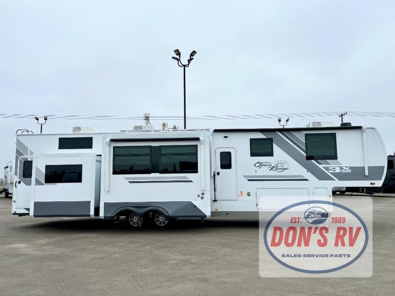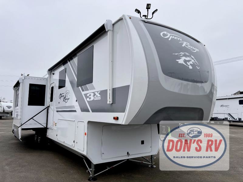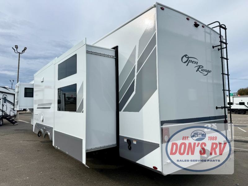 With any Open Range 3X fifth wheel by Open Range RV, you will enjoy residential luxuries and an exceptional build. The TuffShell construction includes vacuum bonded laminated fiberglass and welded aluminum frames for added strength, and the PVC roofing membrane is ultra durable. You can plan to camp year around or go full-time since there is a mandatory Four Season Package that includes a heated and enclosed underbelly, a 40K BTU high-performance furnace, double insulated baggage doors, and more. The residential features continue on with the mandatory Executive Package with the TravelLINK Smart RV system, Keyed-Alike entry and baggage doors, painted fiberglass front cap with LED lighting, and three 15,000 BTU A/C units with quiet residential return air. Inside, you'll enjoy GE kitchen appliances, sleek square windows with integrated blinds, ceramic subway tile backsplash, a glass shower door, and the list of amenities goes on!