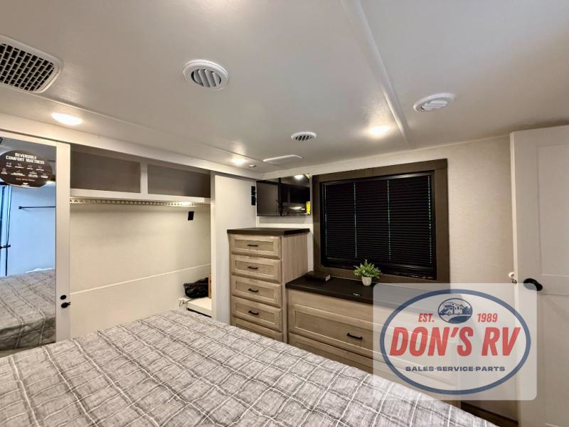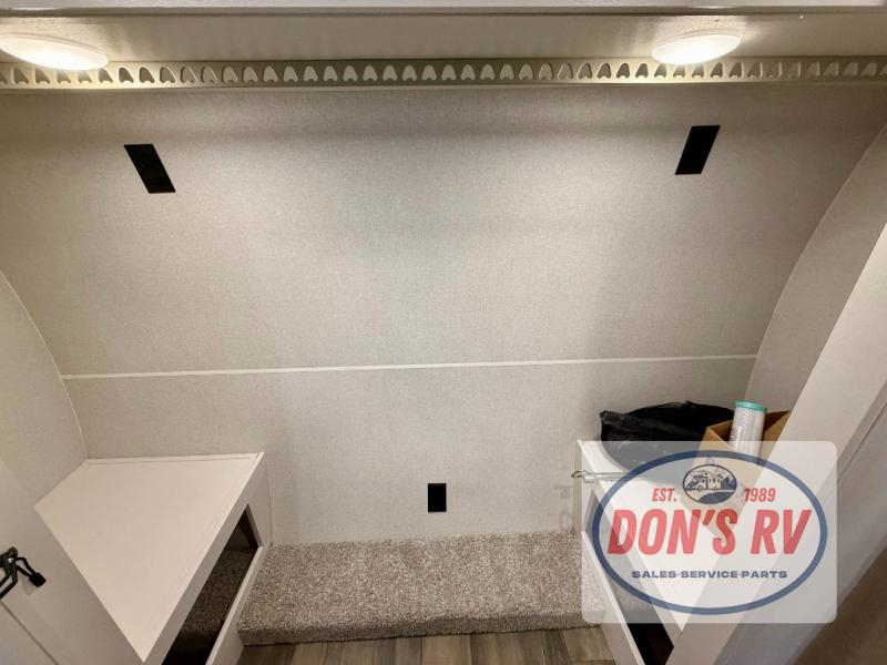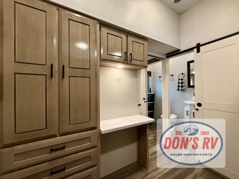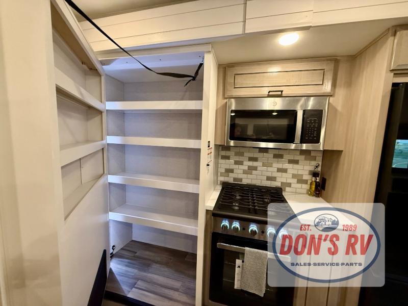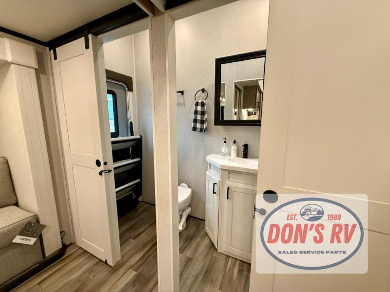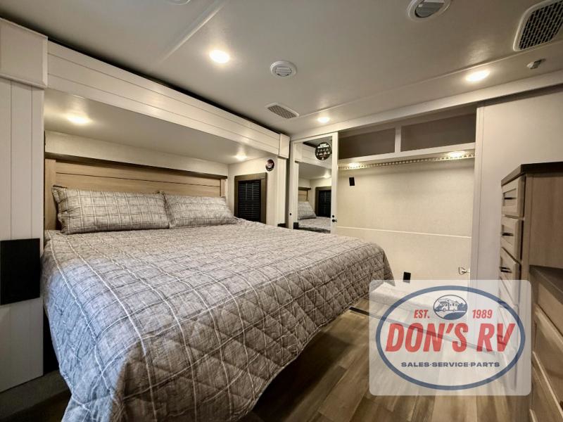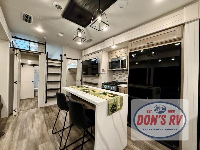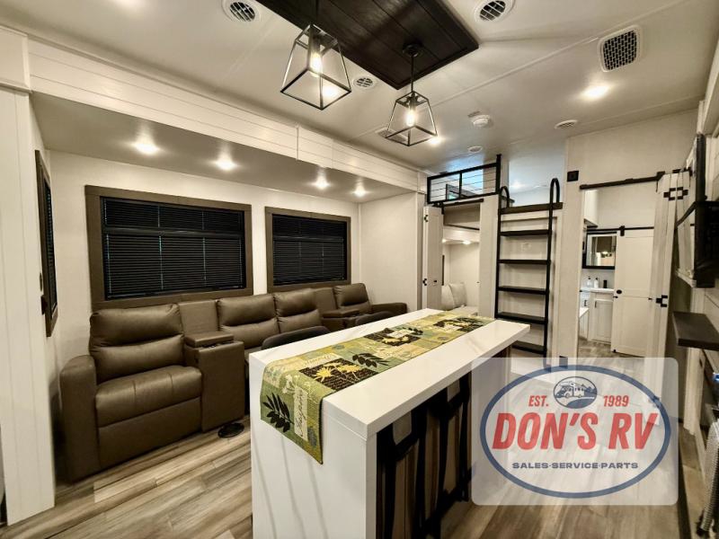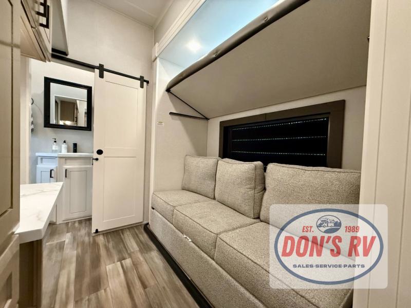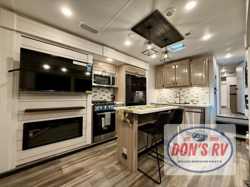 If you enjoy luxury camping or you're looking for a residential fifth wheel to go full-time in, this Open Range 3X is the one! The middle kitchen and living room is made open by the dual opposing slides, and your crew can get comfortable on the mega lounge with two tables. The chef of your group will love cooking on GE free-standing four burner range, or they can use the GE residential microwave to heat up leftovers. The standard dishwasher and central vacuum make cleanup a breeze. A waterfall island with four chairs will provide a place to dine and the hidden pantry behind the swing-out entertainment center can hold snacks galore. There is also a fireplace and smart HDTV to make movie nights cozy. The front master bedroom includes a slide out 72" x 78" king bed, two dressers, a large front closet, and a 32" TV to watch shows in bed. You even have your own entrance into the full bath, plus washer and dryer prep if you choose to add those appliances. The rear bunkhouse suite includes two separate sides that can be shut off from one another, perfect if you have older kids or more than one guest. Each side includes a bi-fold sofa, a desk with overhead storage, and a wardrobe with drawers. And one side even includes a flip-up bunk above the sofa for more sleeping space! The shared full rear bath includes a tub/shower to make bath time easier than ever, plus you'll find one of the dual entry doors here for added convenience!