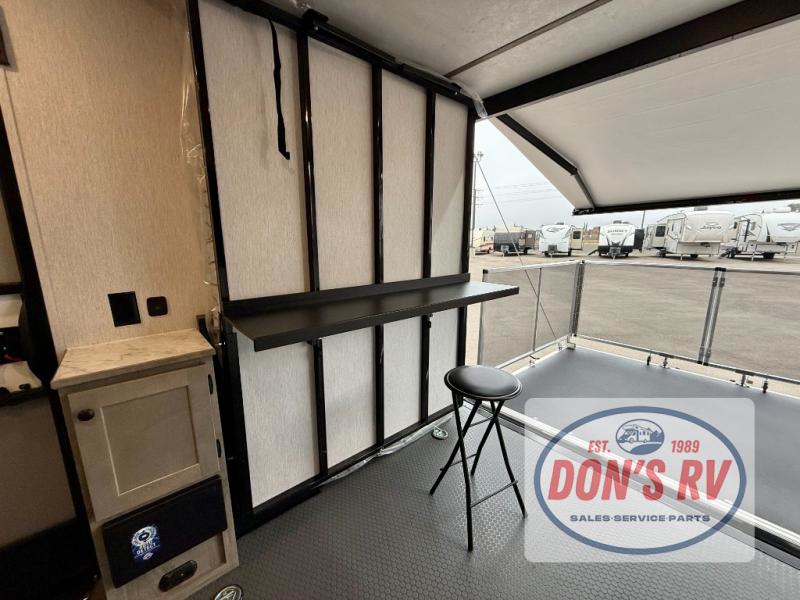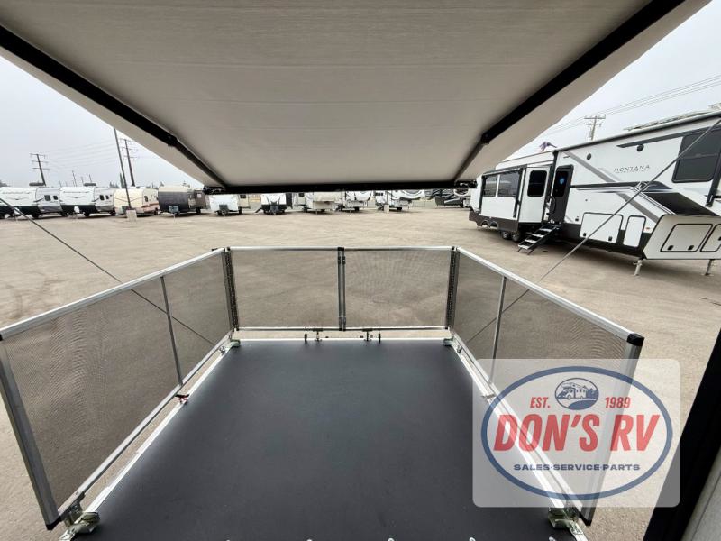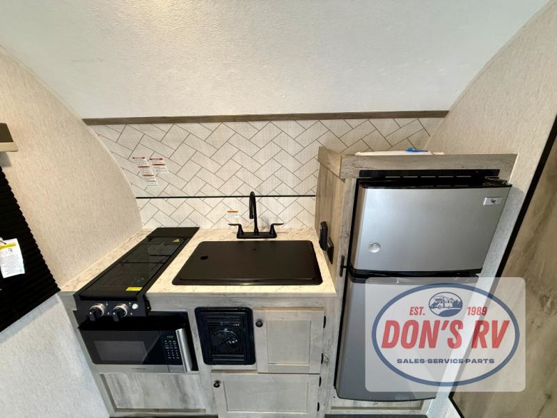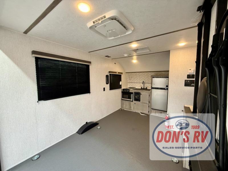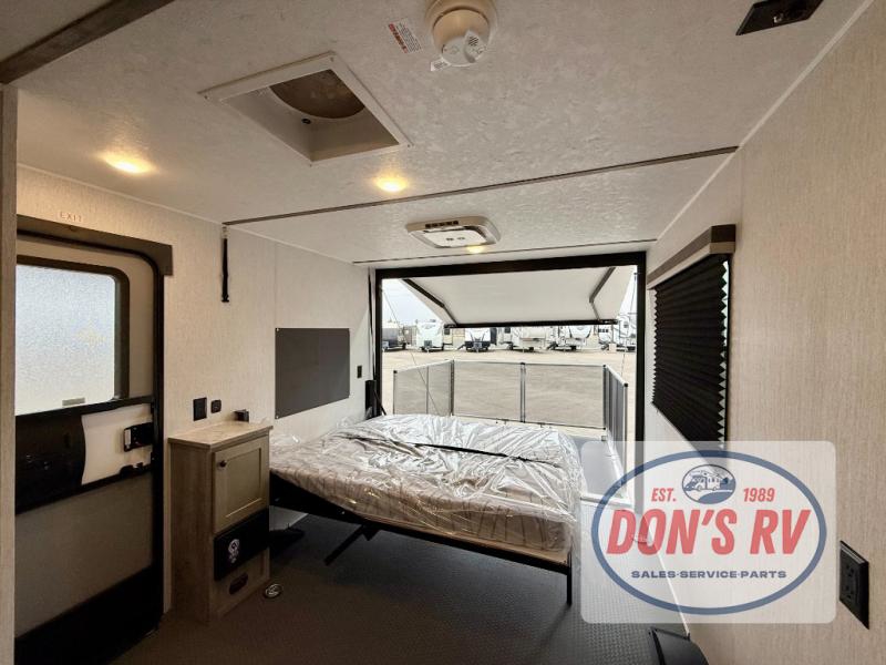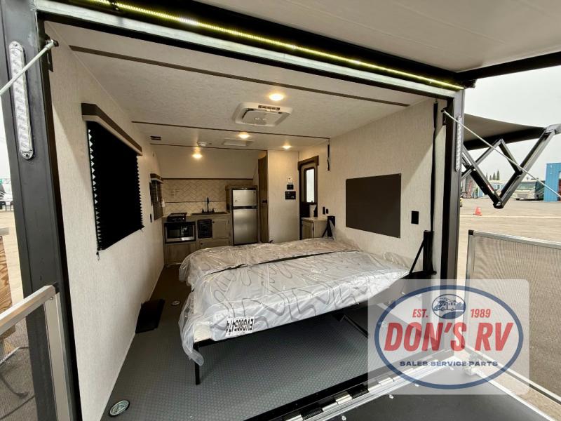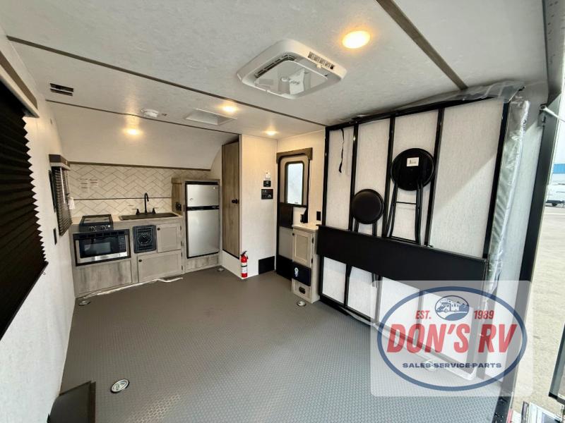 Get ready for a great camping experience where you can take along your favorite ride-on toys, kayaks, or other items that you may not normally have room to load as this toy hauler features a 6' 9" cargo width and 10' 11" cargo length. Once unloaded, set up with the rear bed that will make for a great night's rest. The front of this unit is shared with the wet bath and kitchen. Here, you can make meals on the two burner stove or in the microwave oven, and there is a refrigerator for perishables. And when the optional tent bed is added on this model, you can sleep more campers!