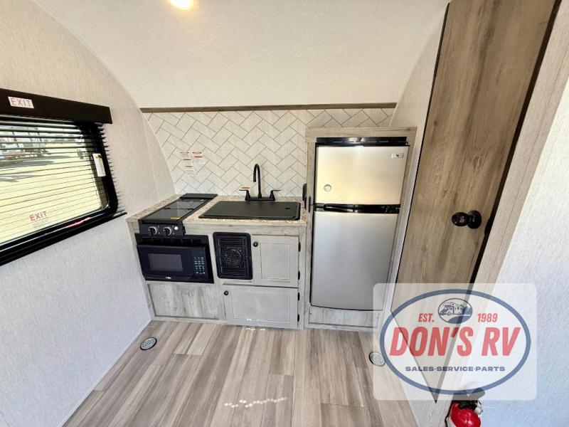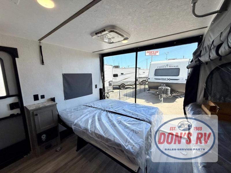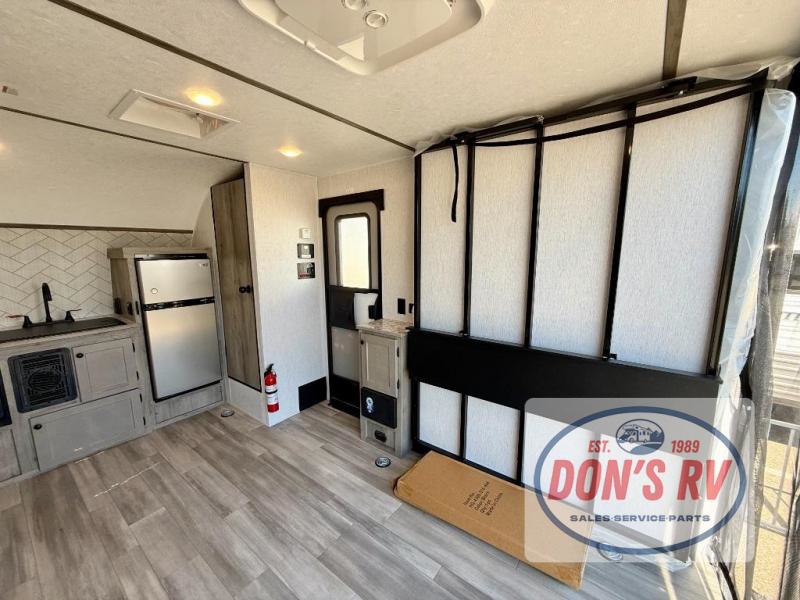 Get ready for a great camping experience where you can take along your favorite ride-on toys, kayaks, or other items that you may not normally have room to load as this toy hauler features a 6' 9" cargo width and 10' 11" cargo length. Once unloaded, set up with the rear bed that will make for a great night's rest. The front of this unit is shared with the wet bath and kitchen. Here, you can make meals on the two burner stove or in the microwave oven, and there is a refrigerator for perishables. And when the optional tent bed is added on this model, you can sleep more campers!