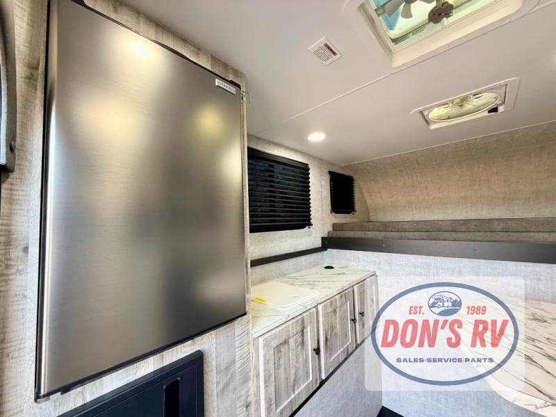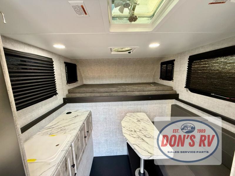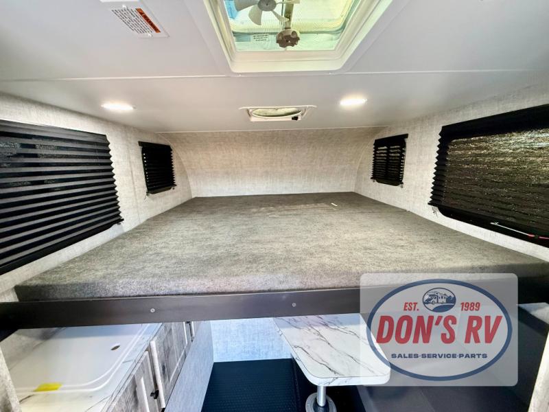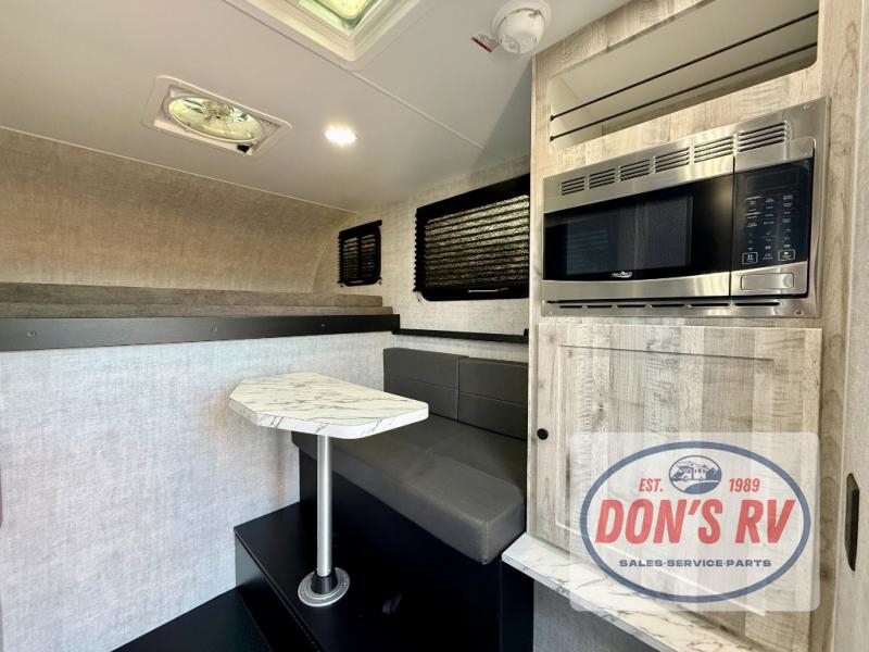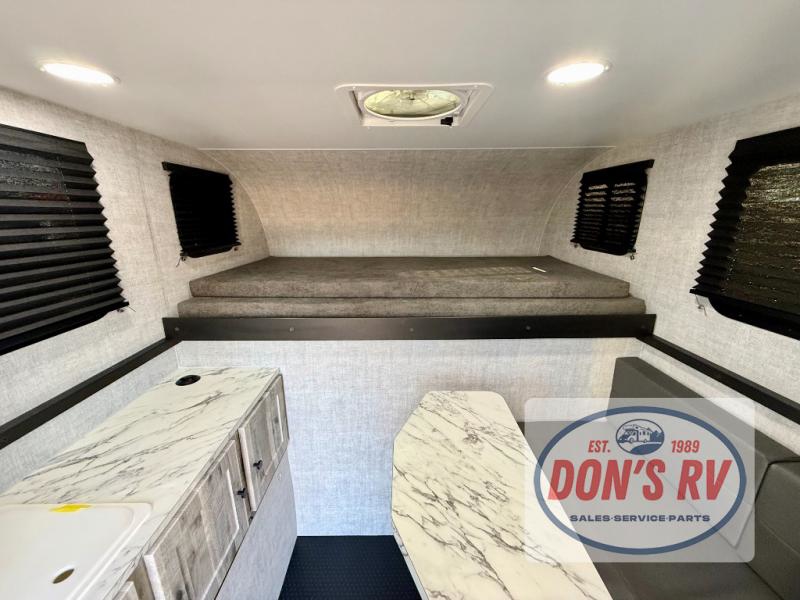 You can explore in complete comfort with this truck camper on your back! There is a comfortable 45" x 80" bunk up front to sleep on, or you can choose the optional 80" x 81" pull-out North/South bed. A two person dinette with a bench seat and fold-away table provides a place to enjoy your meal after it's been prepared on the two burner electric cooktop. There is also a 12V refrigerator that comes standard and an optional microwave oven if you want meals on the go. The portable cooktop can also be taken outside for added convenience, and the dinette can be converted for additional sleeping space for a guest. You can even add an optional commode to make camping trips that much easier!