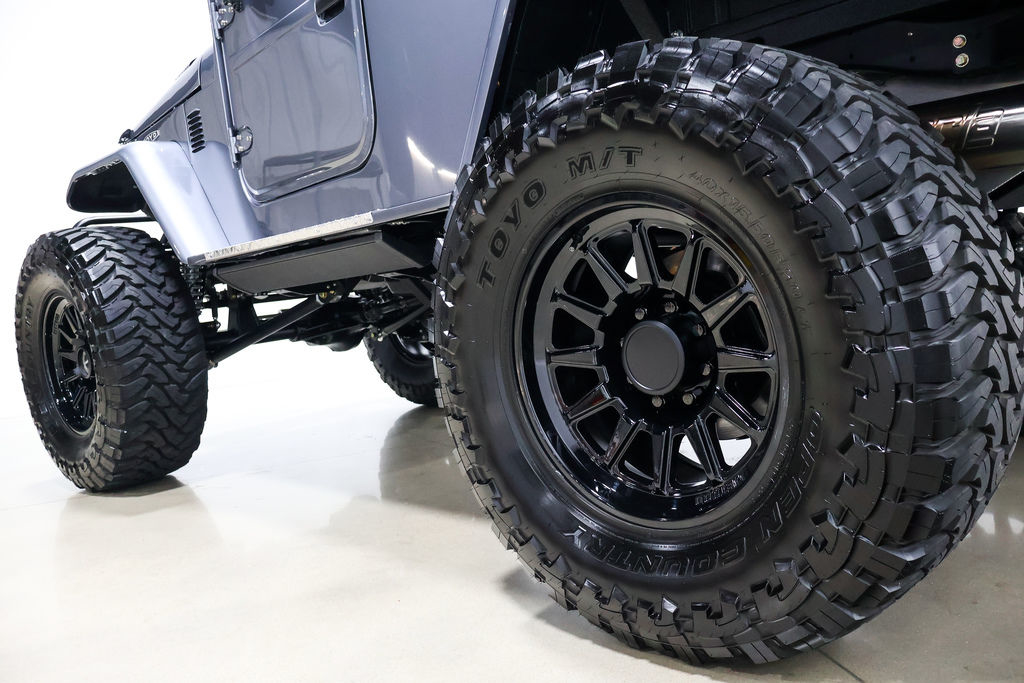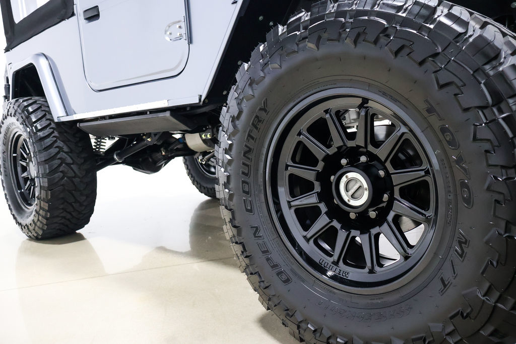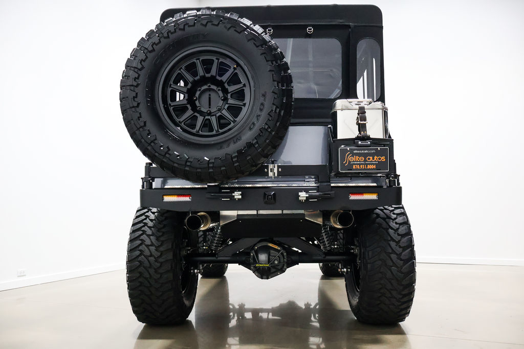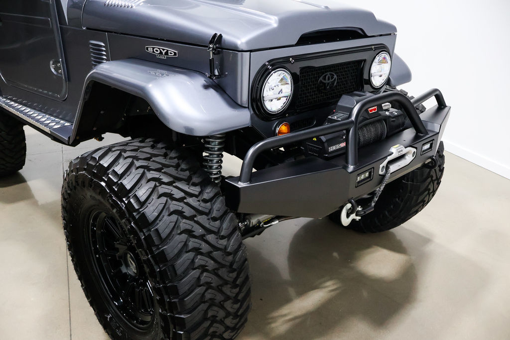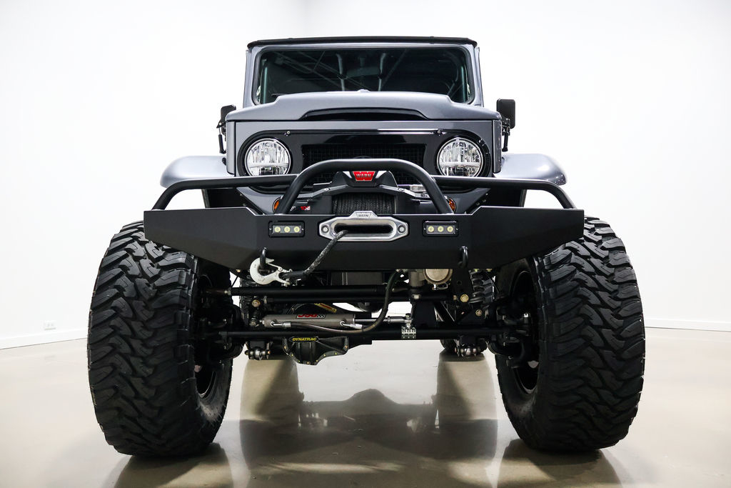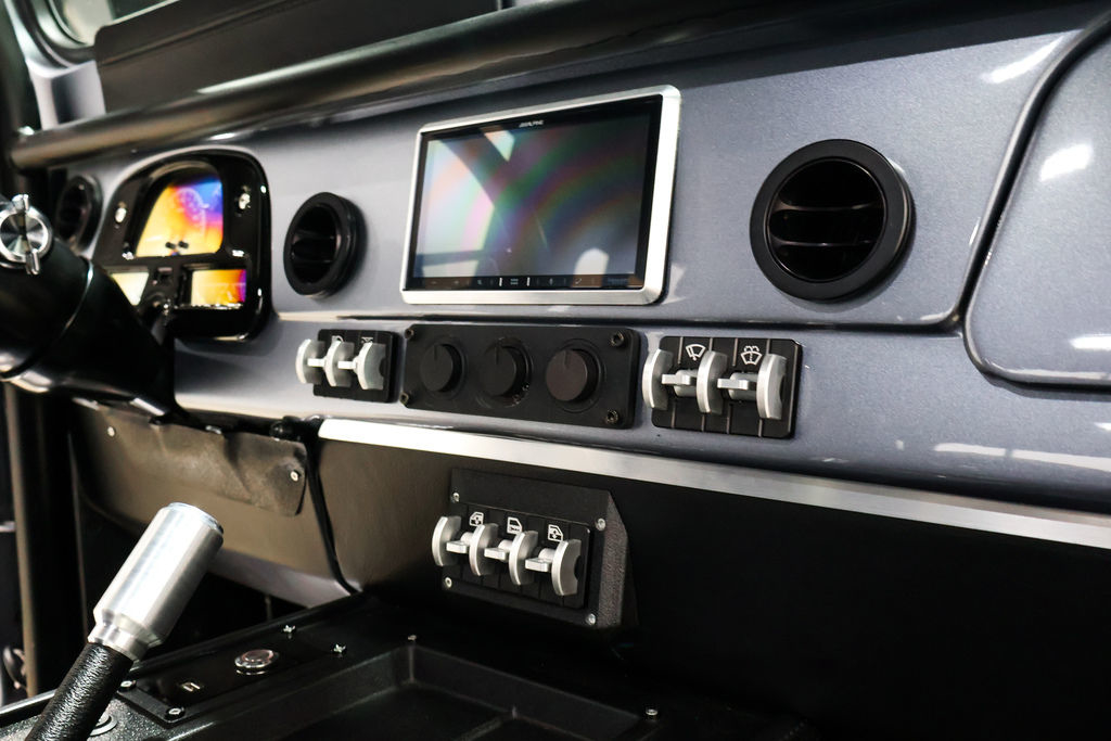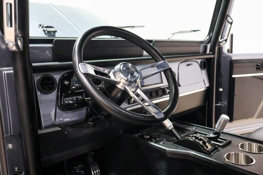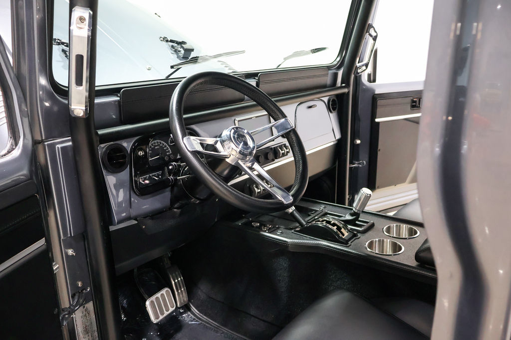 Completed as a ground-up build and is powered by a 650hp supercharged LT4 engine paired with an automatic transmission. The drivetrain is supported by a powder-coated chassis fitted with Dynatrac axles and Fox adjustable shocks, while Wilwood power disc brakes provide stopping performance and the vehicle is equipped with power steering. It rides on 40x15.50R20 Toyo Open Country tires mounted on 20-inch wheels. The exterior retains the classic FJ40 profile while incorporating modernized components consistent with the Resto-Mod build. The interior is trimmed in leather and features heated seats, a hand-stitched Sparco billet steering wheel, billet switchgear, air conditioning and an Alpine touchscreen infotainment system.