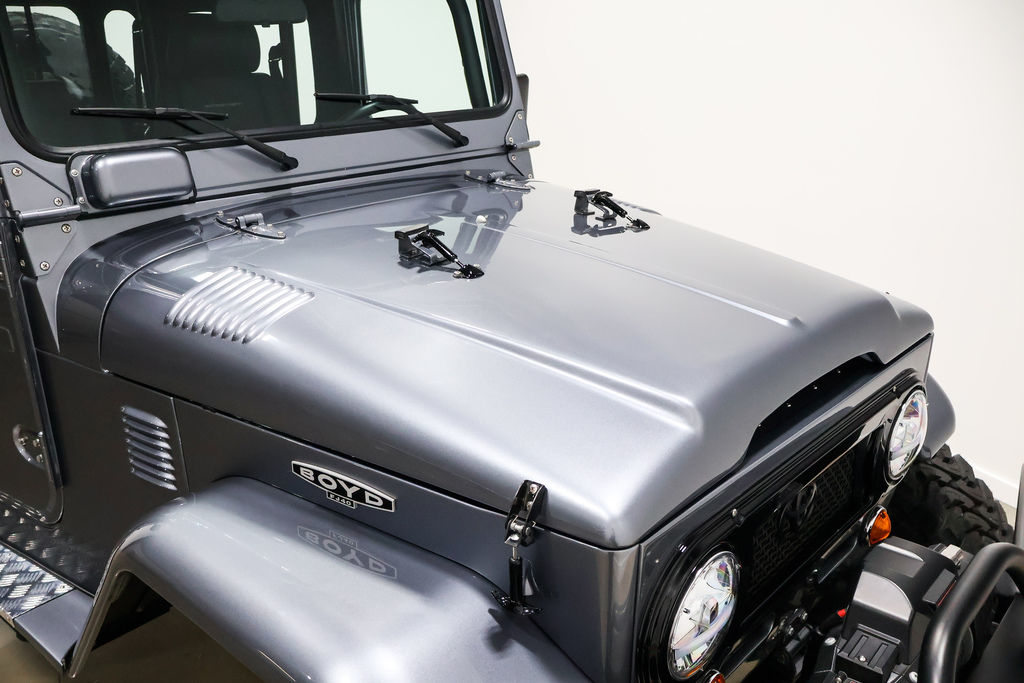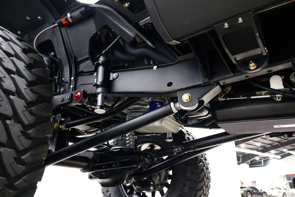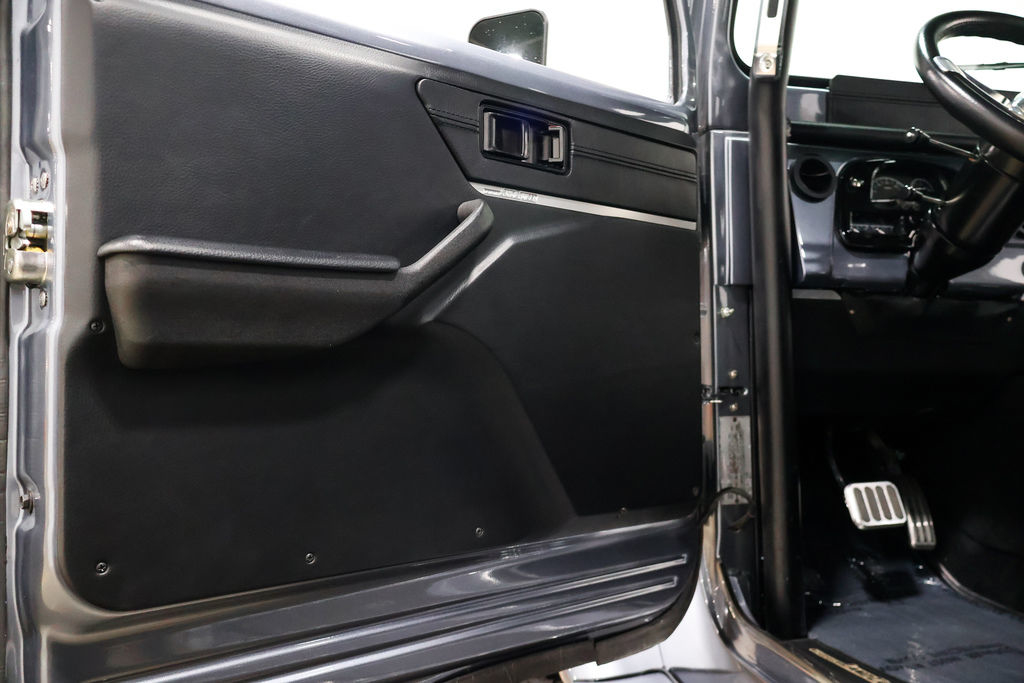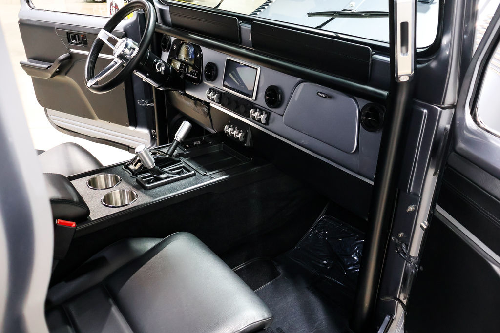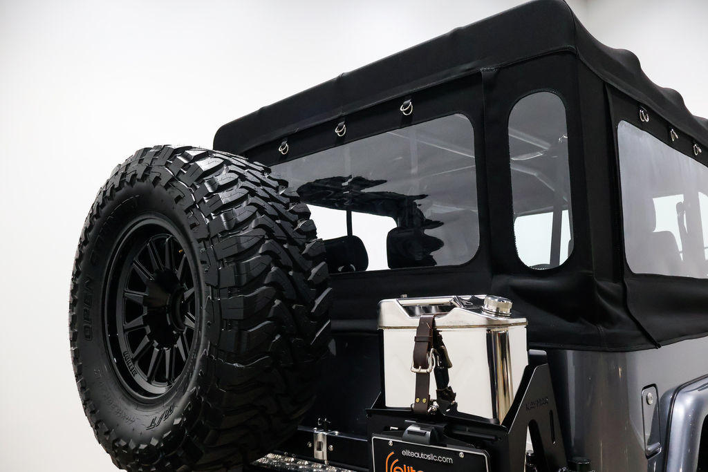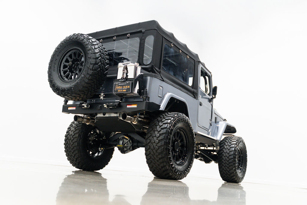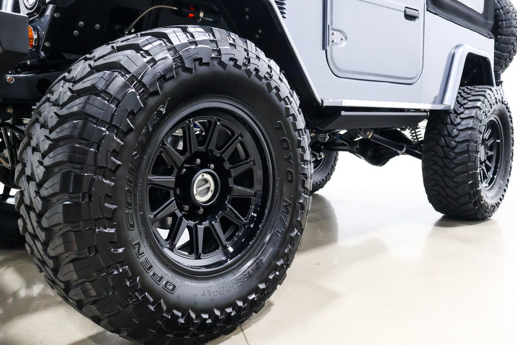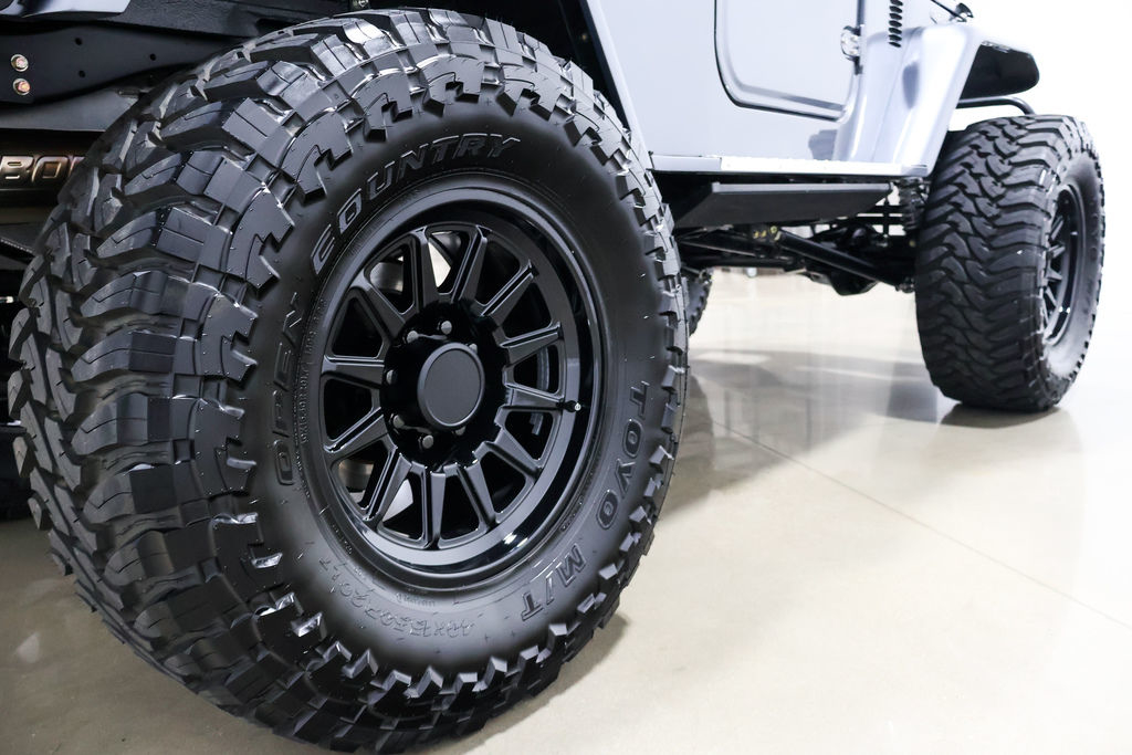 Completed as a ground-up build and is powered by a 650hp supercharged LT4 engine paired with an automatic transmission. The drivetrain is supported by a powder-coated chassis fitted with Dynatrac axles and Fox adjustable shocks, while Wilwood power disc brakes provide stopping performance and the vehicle is equipped with power steering. It rides on 40x15.50R20 Toyo Open Country tires mounted on 20-inch wheels. The exterior retains the classic FJ40 profile while incorporating modernized components consistent with the Resto-Mod build. The interior is trimmed in leather and features heated seats, a hand-stitched Sparco billet steering wheel, billet switchgear, air conditioning and an Alpine touchscreen infotainment system.