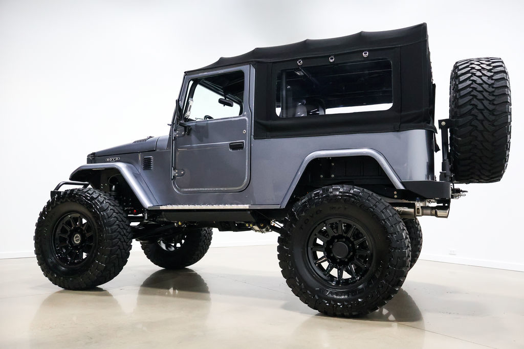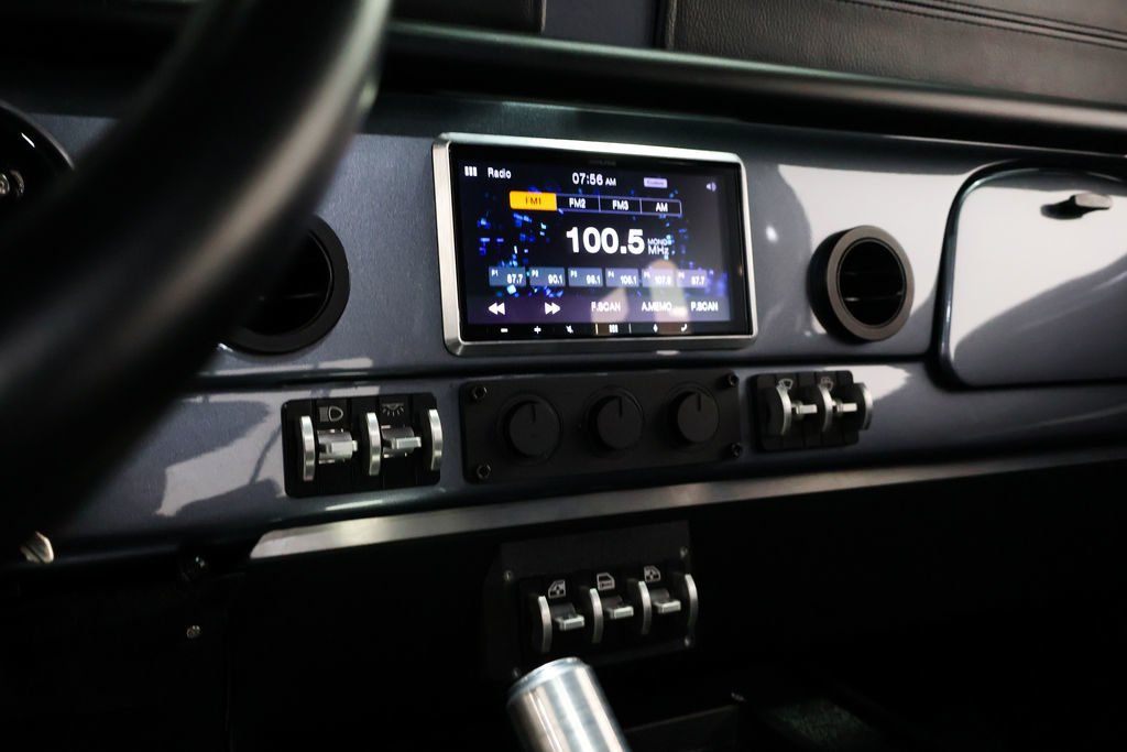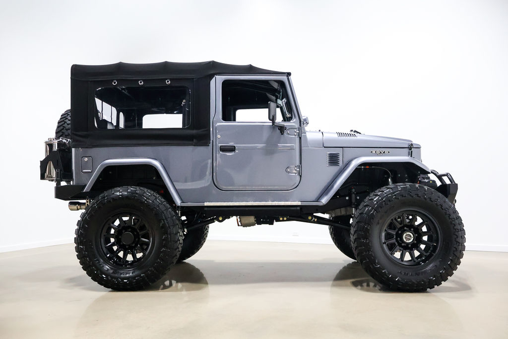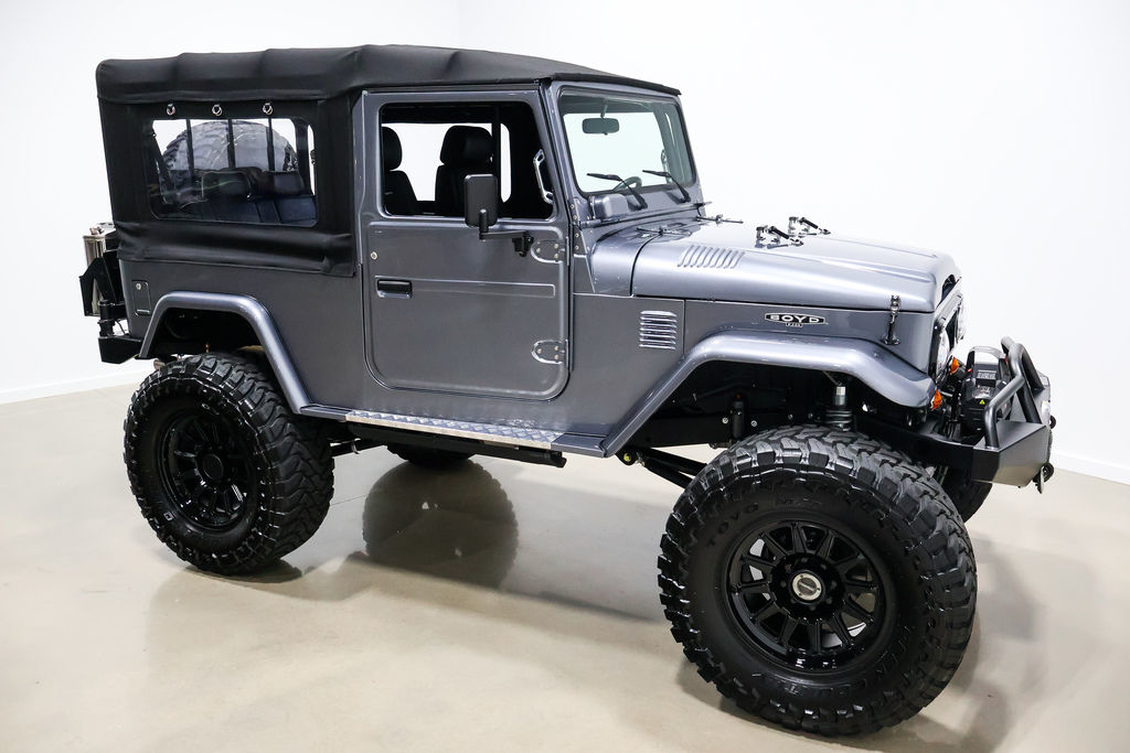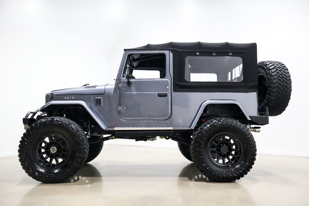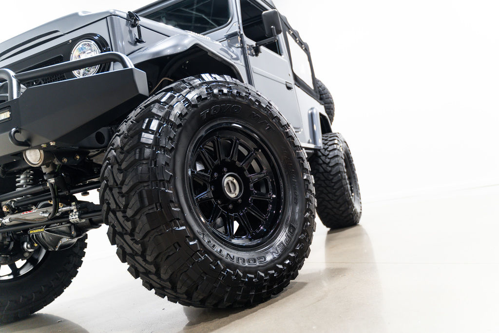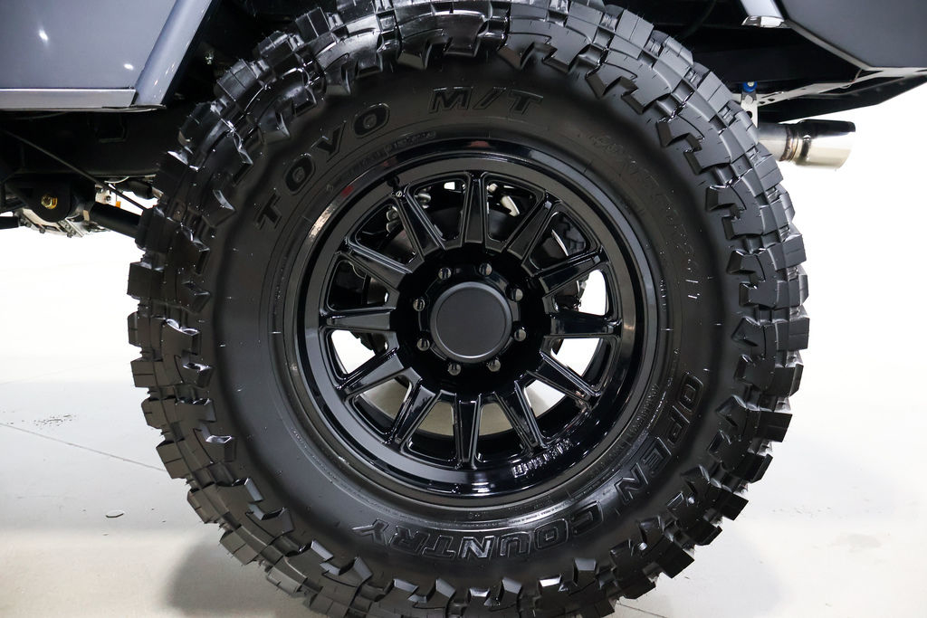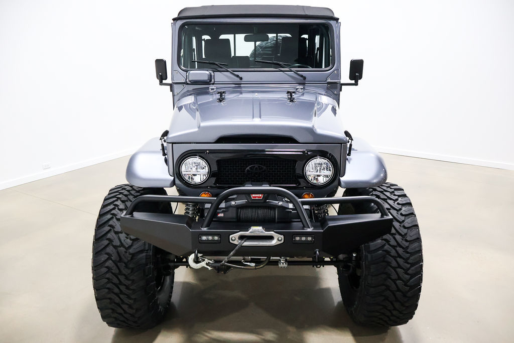 Completed as a ground-up build and is powered by a 650hp supercharged LT4 engine paired with an automatic transmission. The drivetrain is supported by a powder-coated chassis fitted with Dynatrac axles and Fox adjustable shocks, while Wilwood power disc brakes provide stopping performance and the vehicle is equipped with power steering. It rides on 40x15.50R20 Toyo Open Country tires mounted on 20-inch wheels. The exterior retains the classic FJ40 profile while incorporating modernized components consistent with the Resto-Mod build. The interior is trimmed in leather and features heated seats, a hand-stitched Sparco billet steering wheel, billet switchgear, air conditioning and an Alpine touchscreen infotainment system.