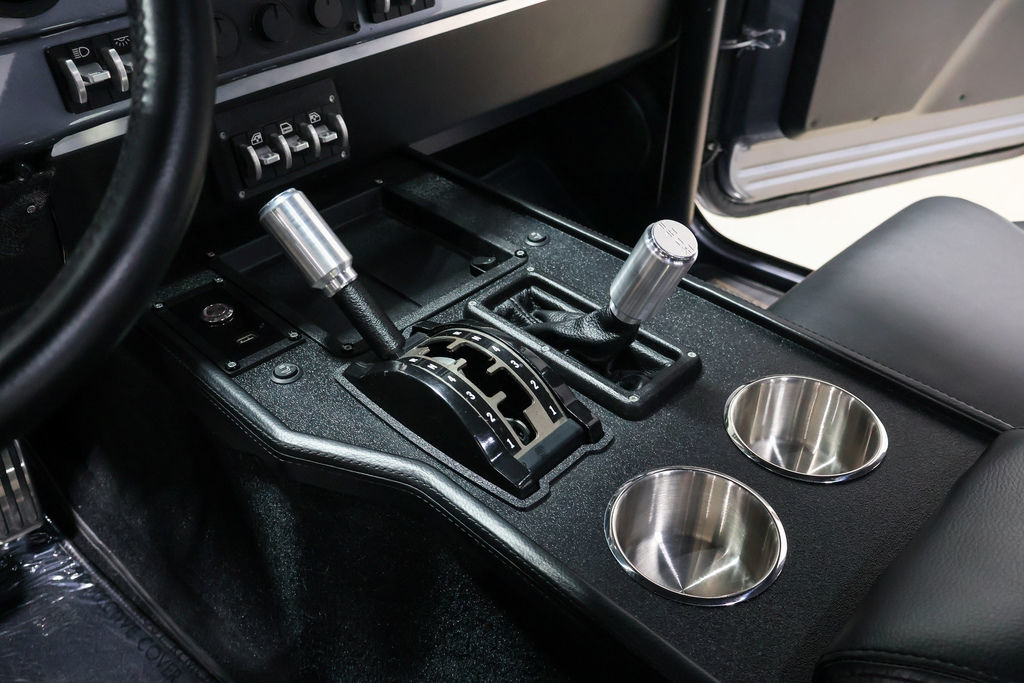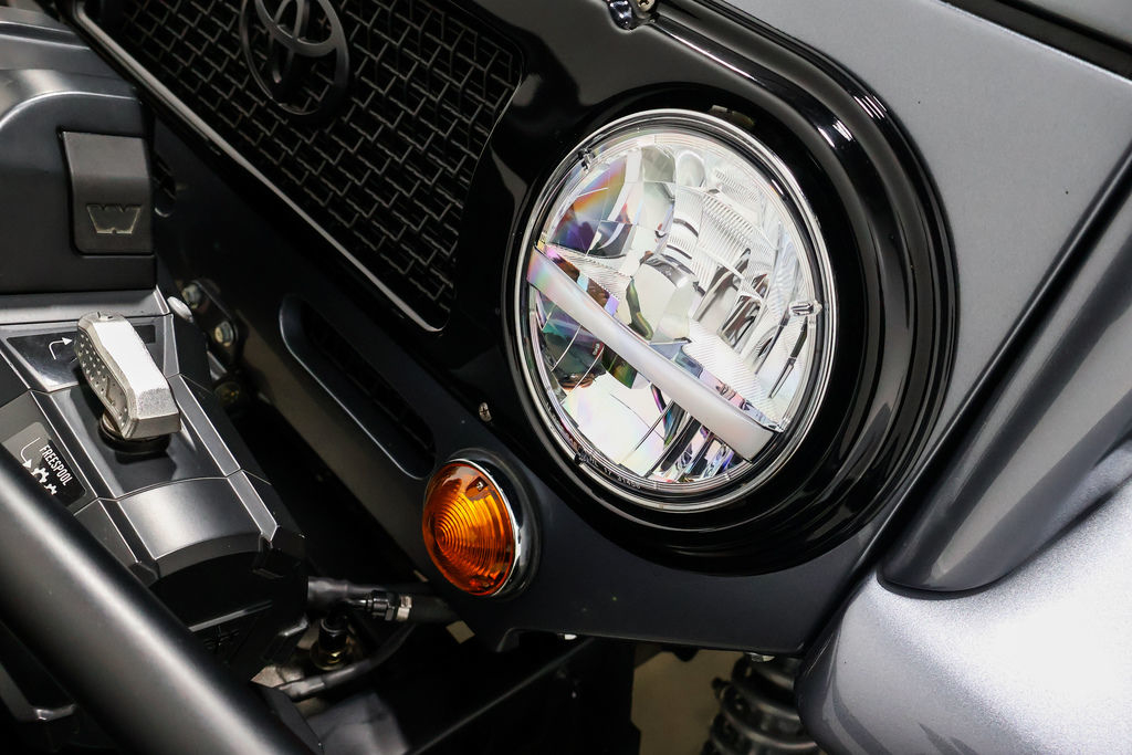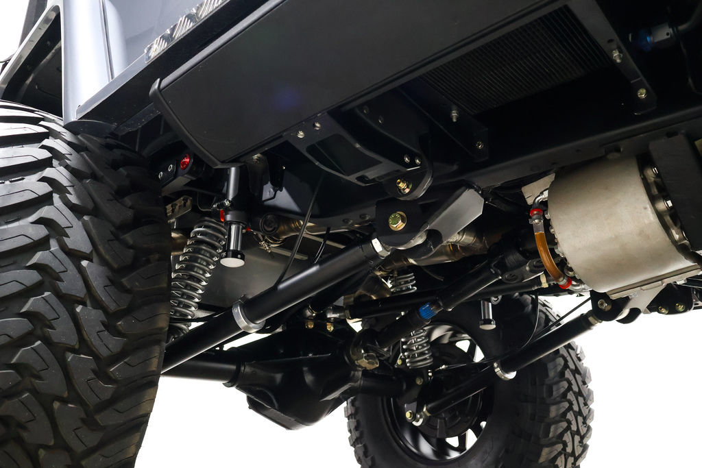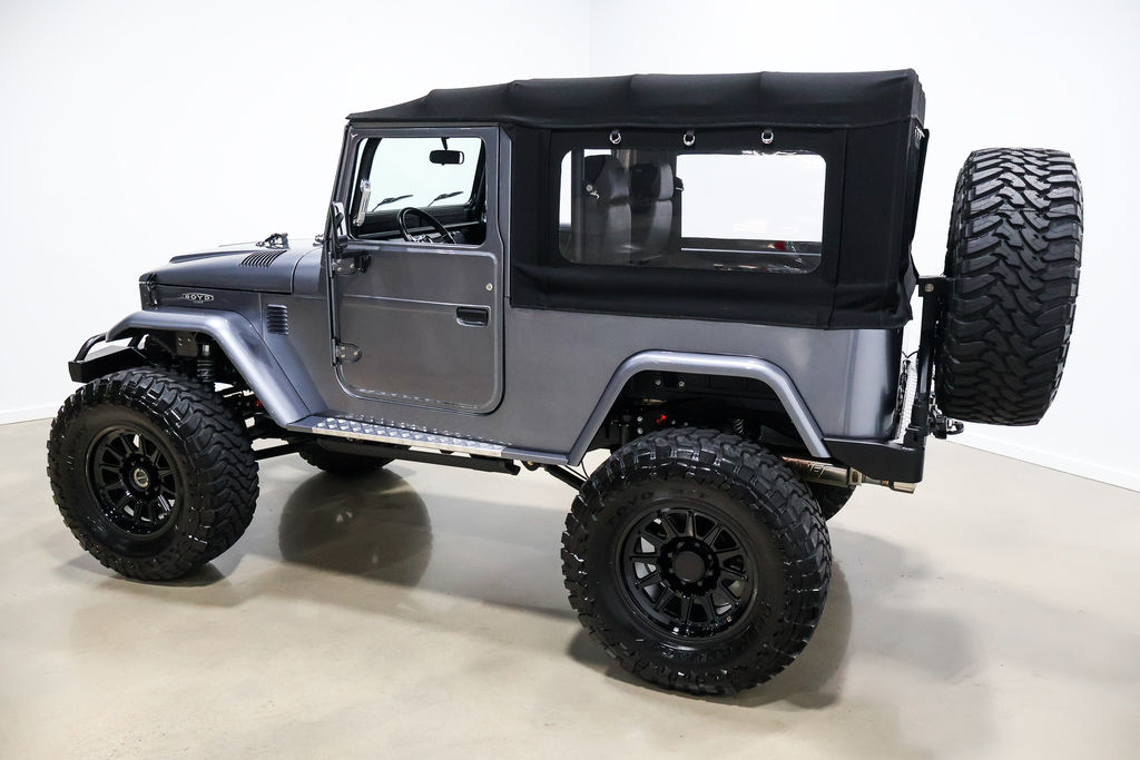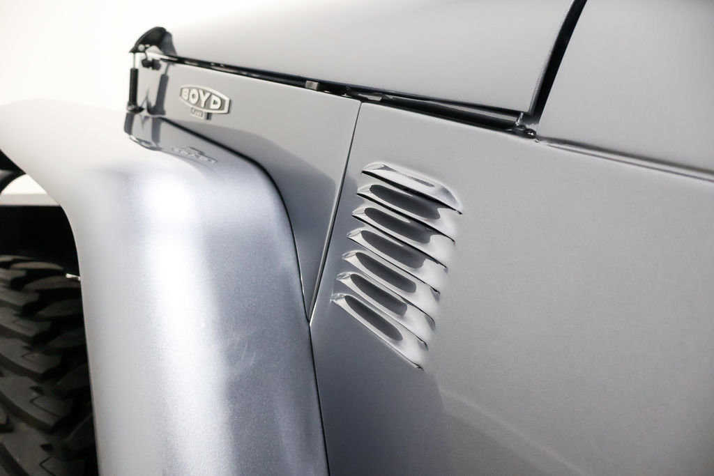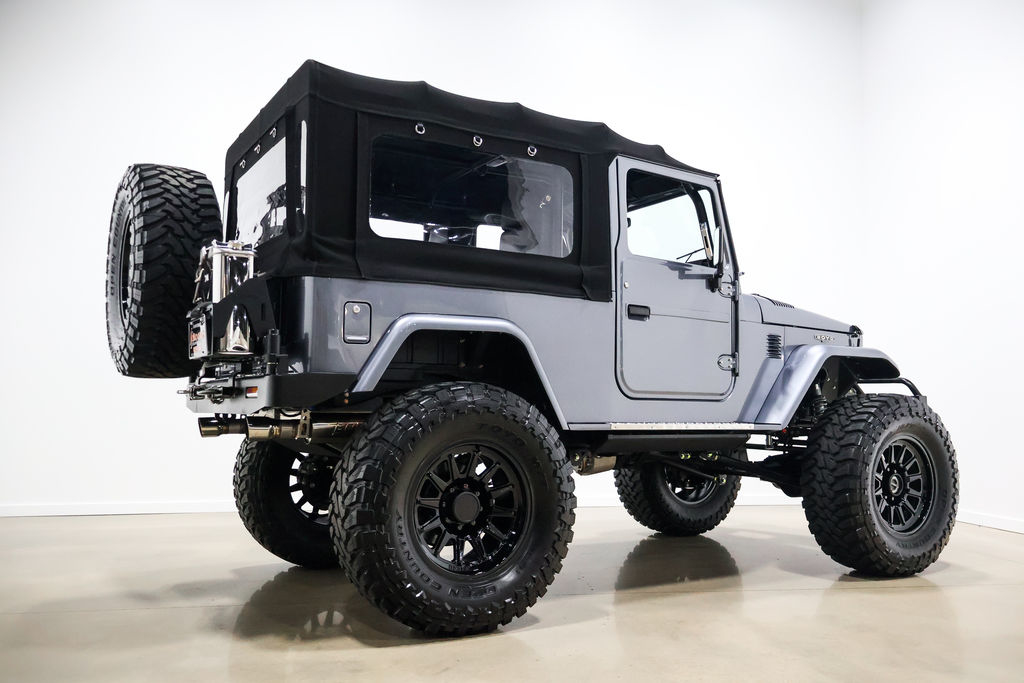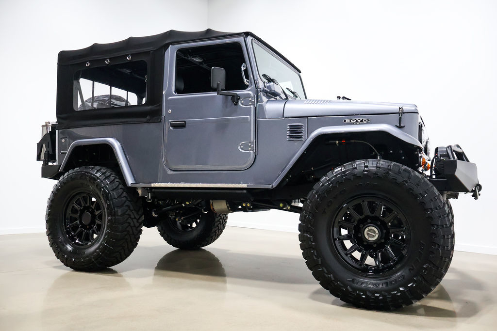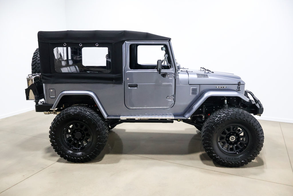 Completed as a ground-up build and is powered by a 650hp supercharged LT4 engine paired with an automatic transmission. The drivetrain is supported by a powder-coated chassis fitted with Dynatrac axles and Fox adjustable shocks, while Wilwood power disc brakes provide stopping performance and the vehicle is equipped with power steering. It rides on 40x15.50R20 Toyo Open Country tires mounted on 20-inch wheels. The exterior retains the classic FJ40 profile while incorporating modernized components consistent with the Resto-Mod build. The interior is trimmed in leather and features heated seats, a hand-stitched Sparco billet steering wheel, billet switchgear, air conditioning and an Alpine touchscreen infotainment system.