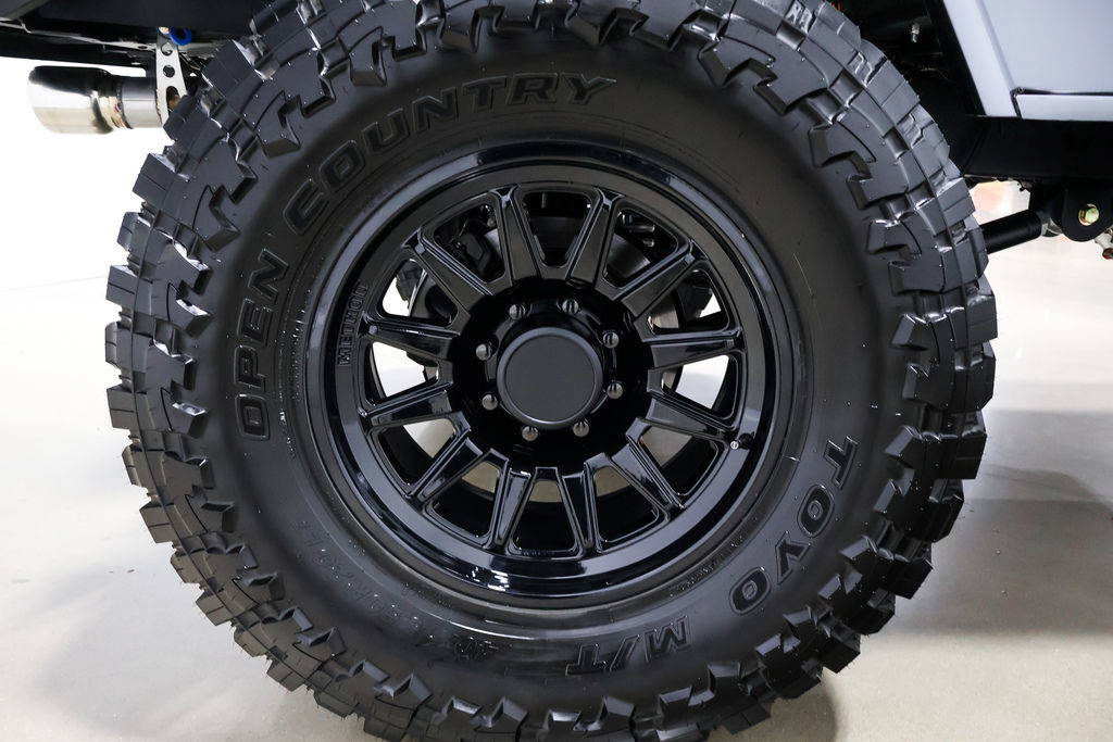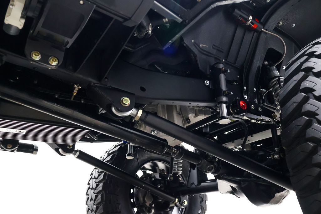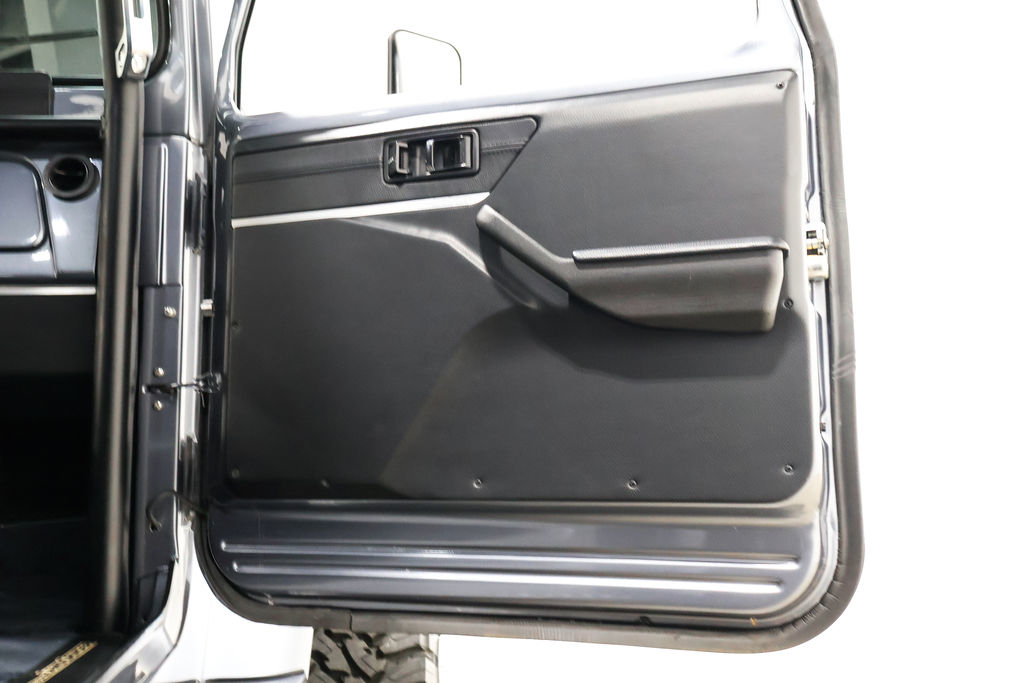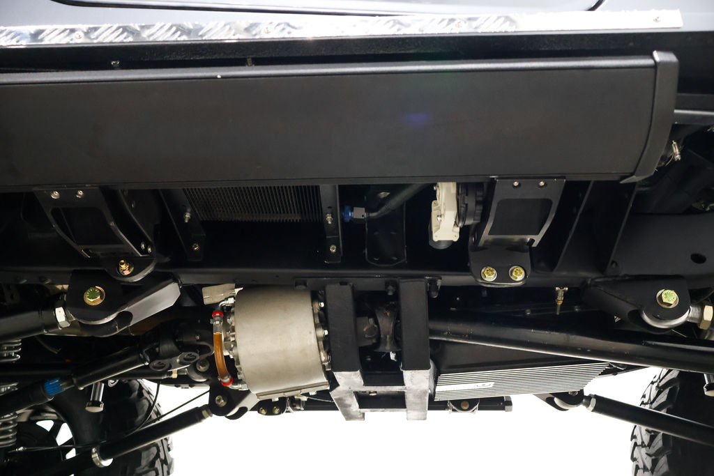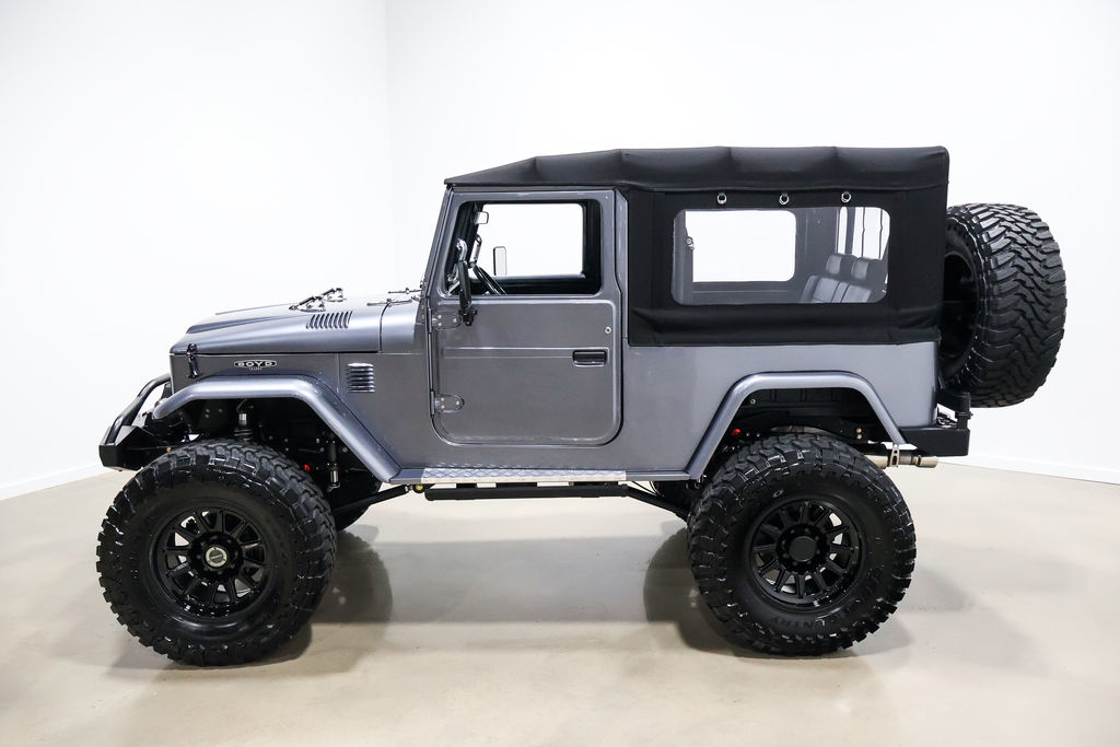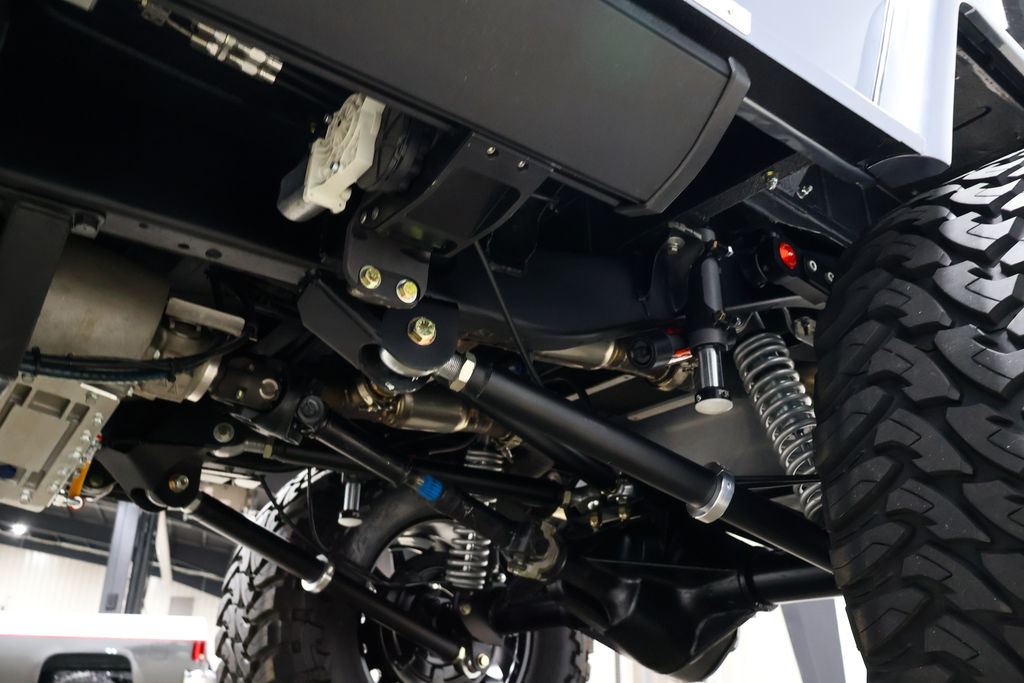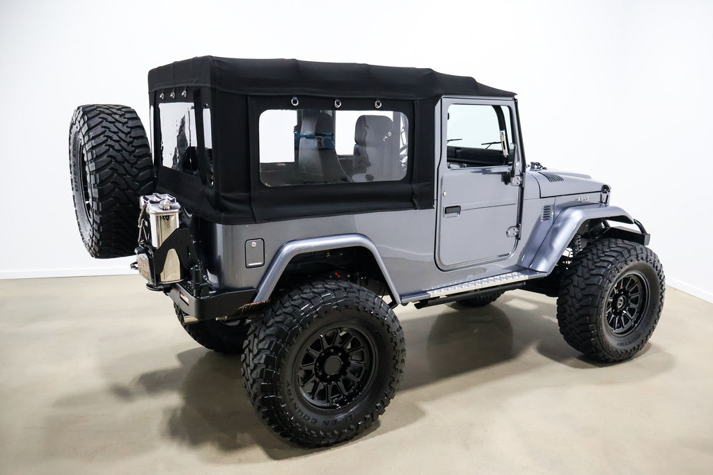 Completed as a ground-up build and is powered by a 650hp supercharged LT4 engine paired with an automatic transmission. The drivetrain is supported by a powder-coated chassis fitted with Dynatrac axles and Fox adjustable shocks, while Wilwood power disc brakes provide stopping performance and the vehicle is equipped with power steering. It rides on 40x15.50R20 Toyo Open Country tires mounted on 20-inch wheels. The exterior retains the classic FJ40 profile while incorporating modernized components consistent with the Resto-Mod build. The interior is trimmed in leather and features heated seats, a hand-stitched Sparco billet steering wheel, billet switchgear, air conditioning and an Alpine touchscreen infotainment system.