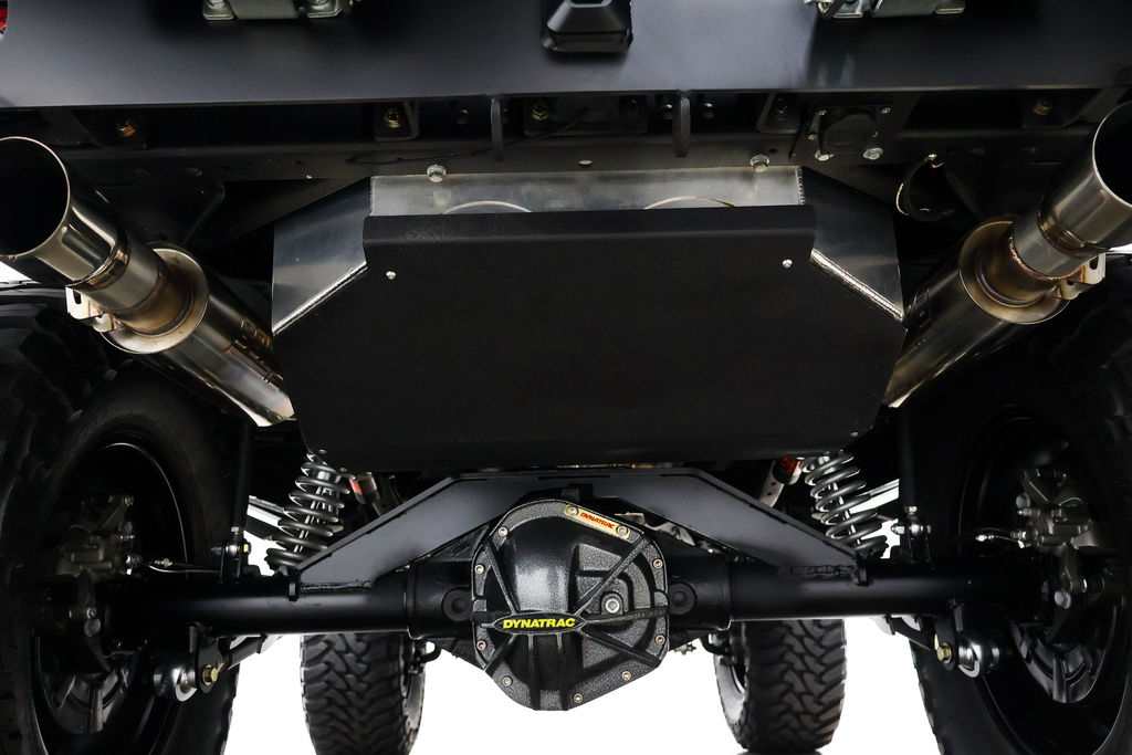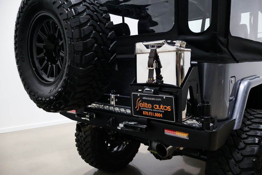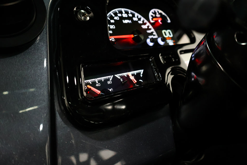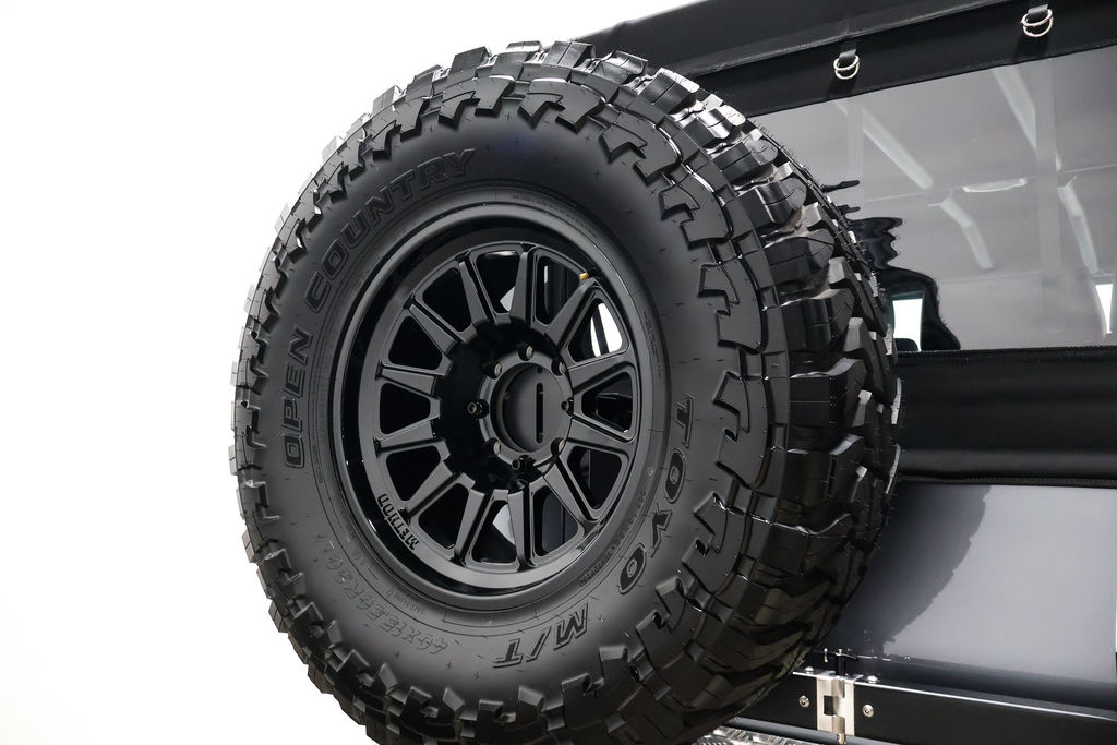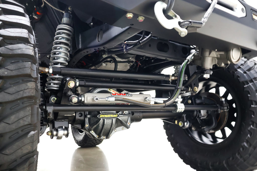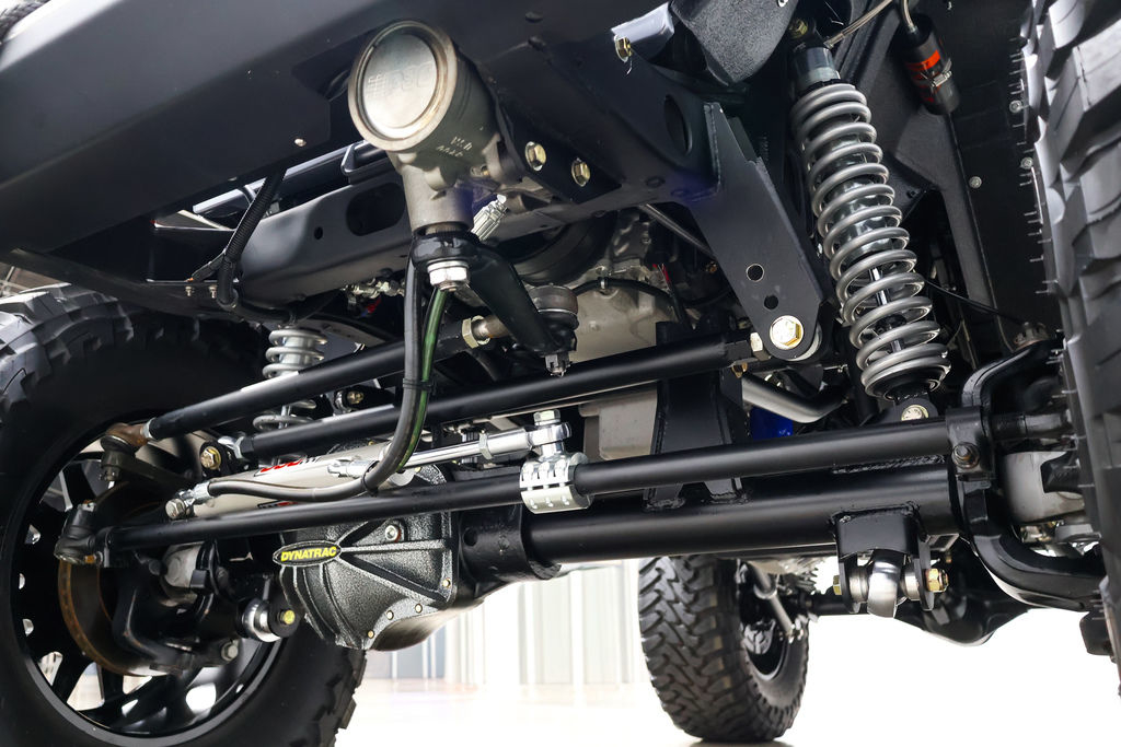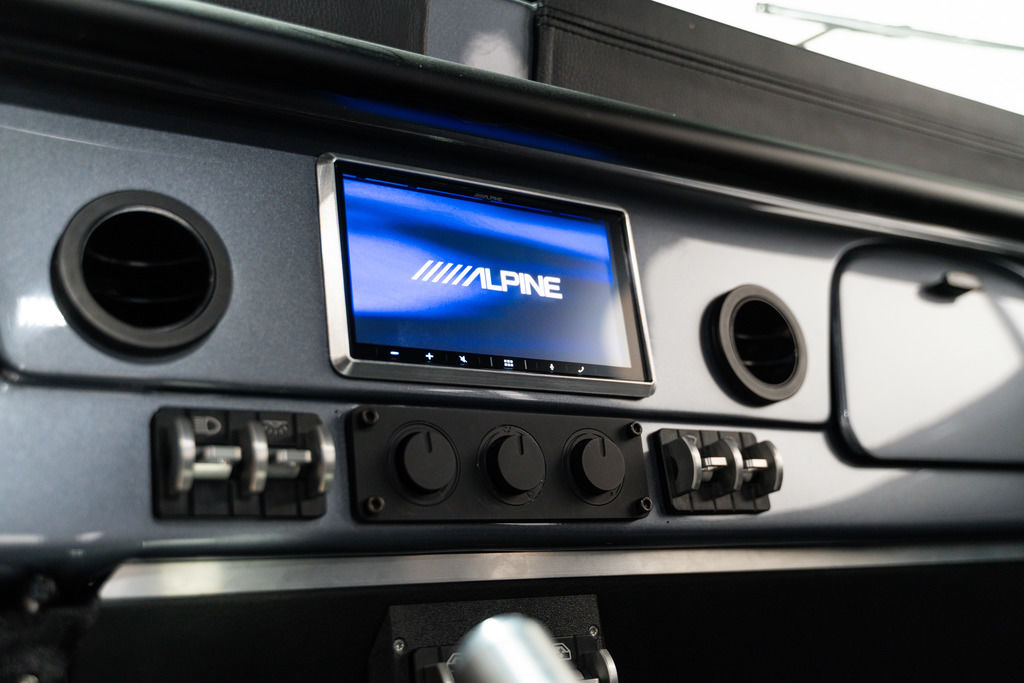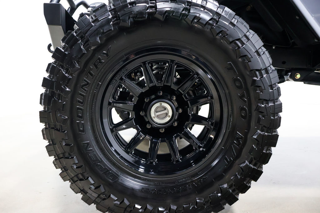 Completed as a ground-up build and is powered by a 650hp supercharged LT4 engine paired with an automatic transmission. The drivetrain is supported by a powder-coated chassis fitted with Dynatrac axles and Fox adjustable shocks, while Wilwood power disc brakes provide stopping performance and the vehicle is equipped with power steering. It rides on 40x15.50R20 Toyo Open Country tires mounted on 20-inch wheels. The exterior retains the classic FJ40 profile while incorporating modernized components consistent with the Resto-Mod build. The interior is trimmed in leather and features heated seats, a hand-stitched Sparco billet steering wheel, billet switchgear, air conditioning and an Alpine touchscreen infotainment system.