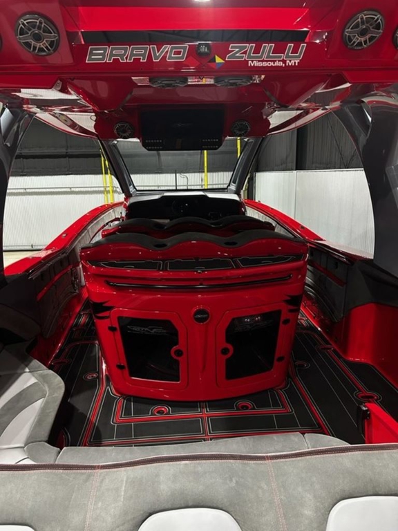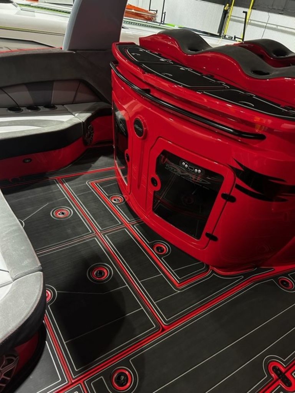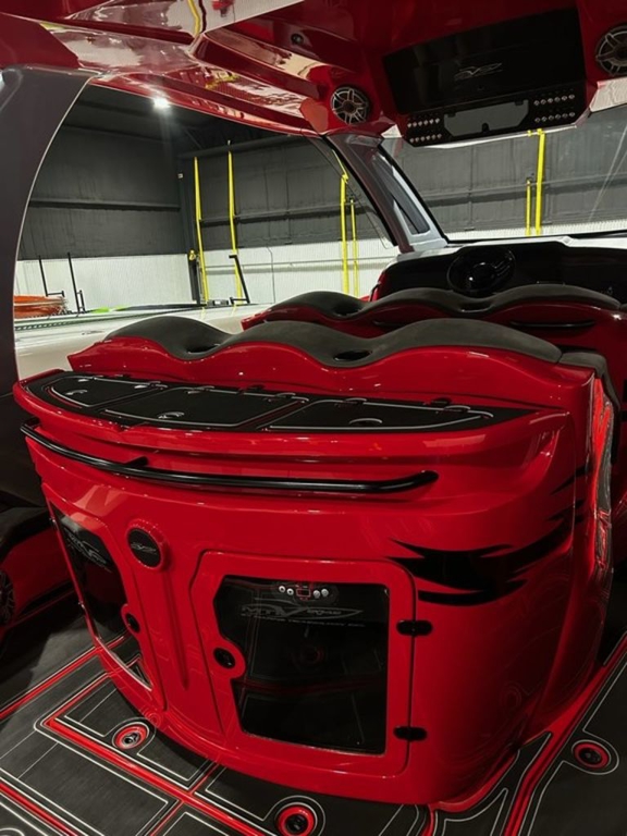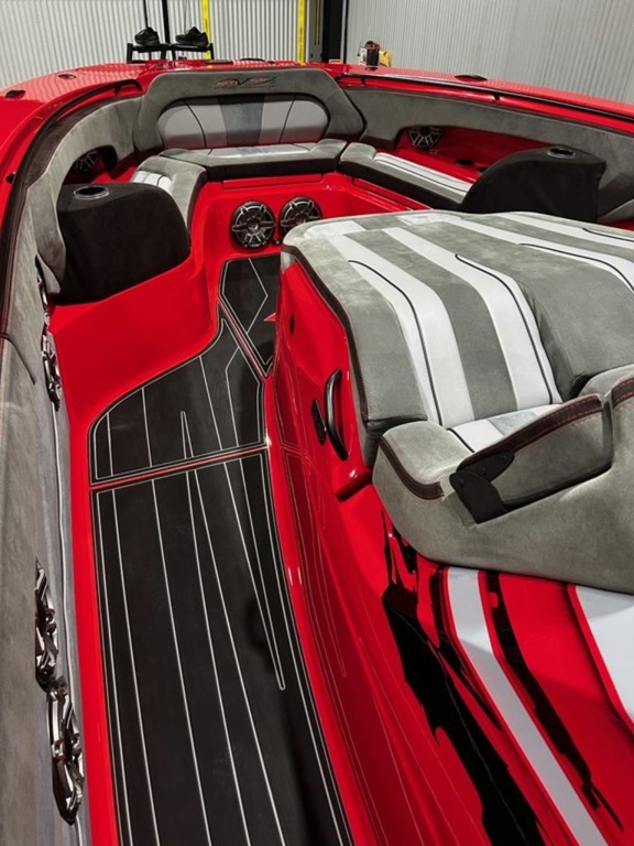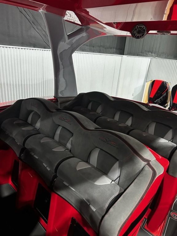 Behind the helm you’ll find two rows of 3 person stand up or sit downs bolsters while the unique hard top is large enough to cover both rows of seats. Going aft there’s a large rear bench.