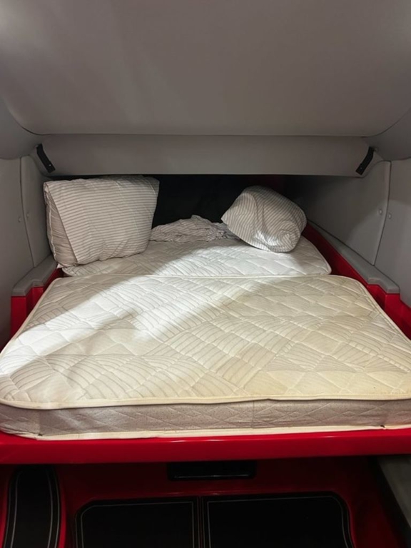 The cabin features a large forward berth with a comfortable mattress. When not in use the rear of the bed folds up to create a limo style seat for riding or to escape the out of doors. There’s a galley area and an electric flush head concealed below an additional seating area.