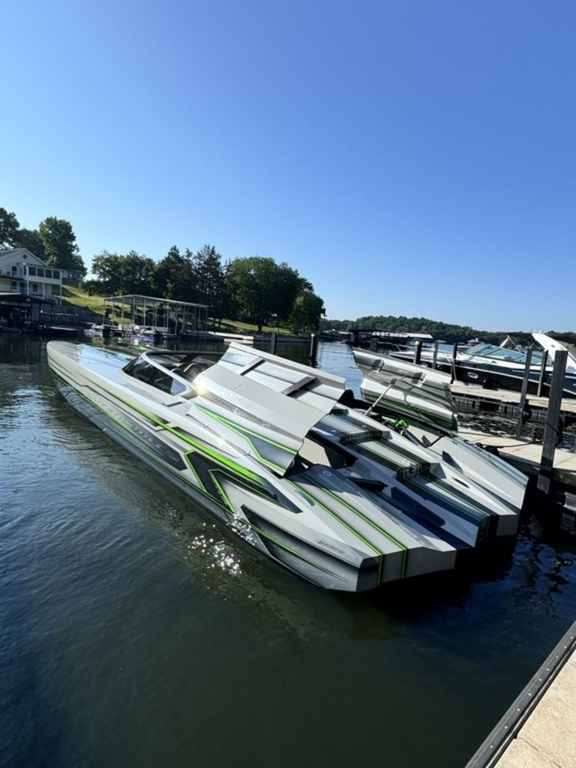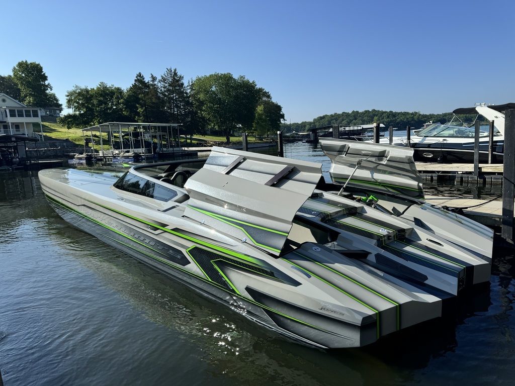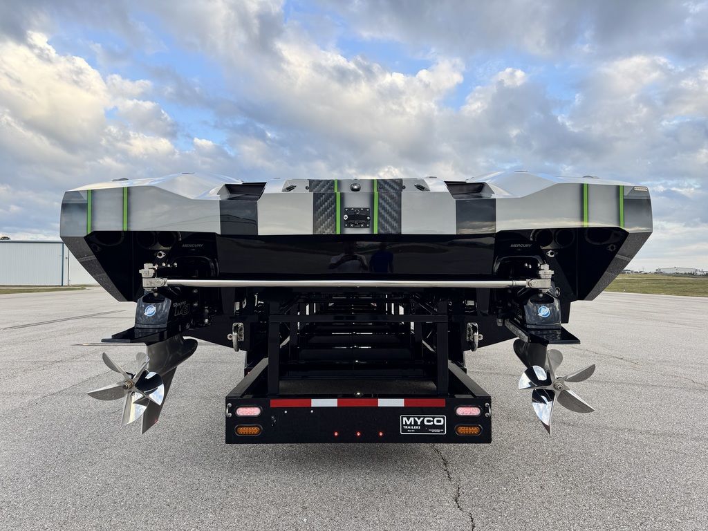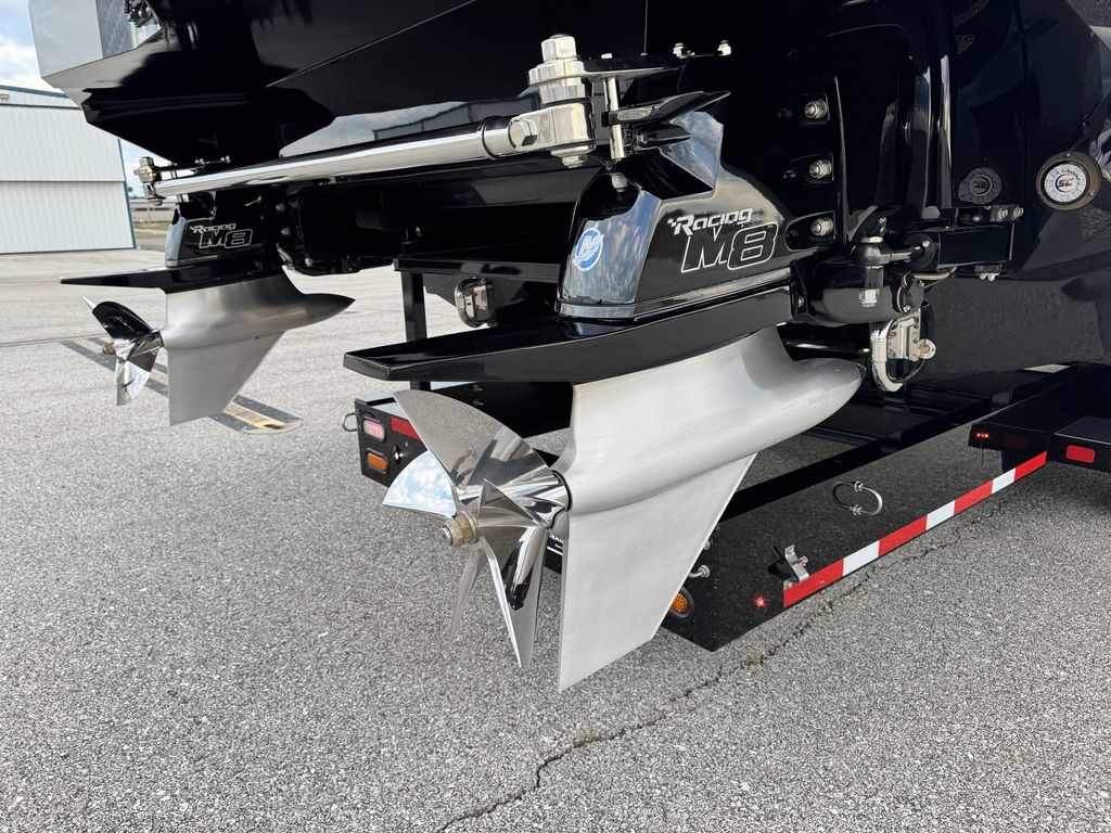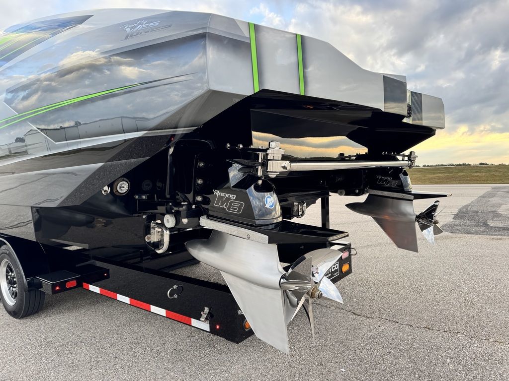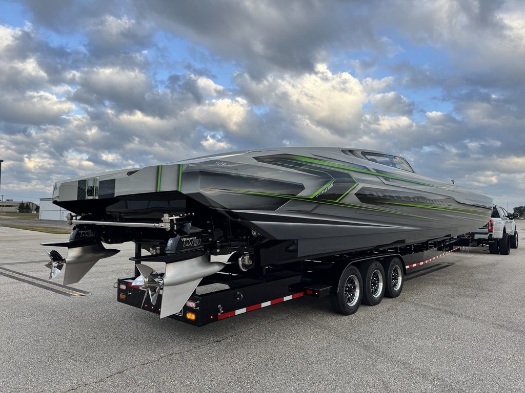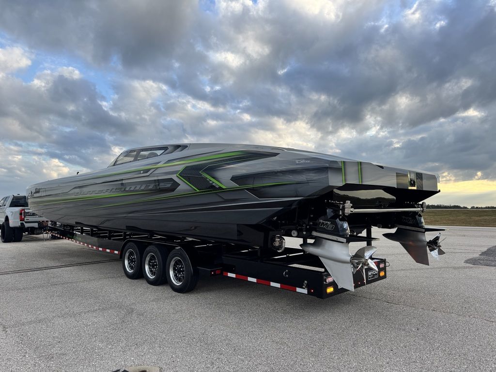 Offered by Elite Autos LLC in conjunction with Performance Boat Center of Osage Beach, Mo., this 2026 model-year Outerlimits Offshore Powerboats SC 46 catamaran is powered by dual-calibration Mercury Racing 1550/1350 with M8 drives. The turbocharged quad-cam four-valve engines have five operating hours, and the skegs for the drives were blueprinted by Wilson Custom Marine.