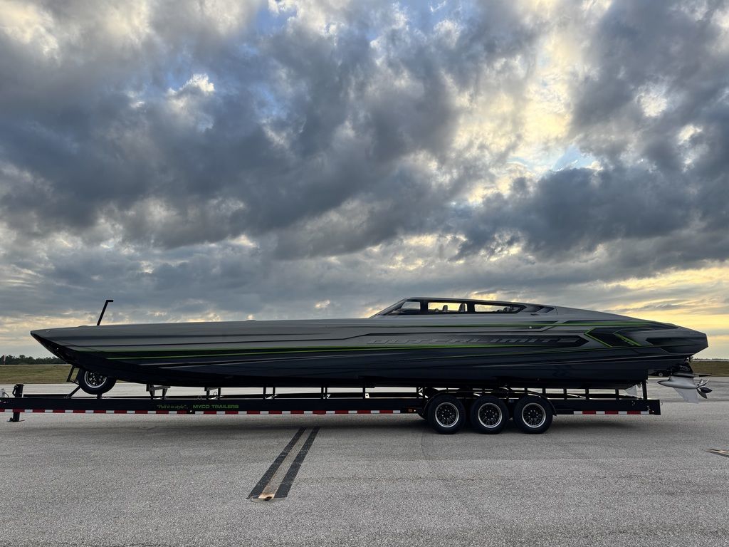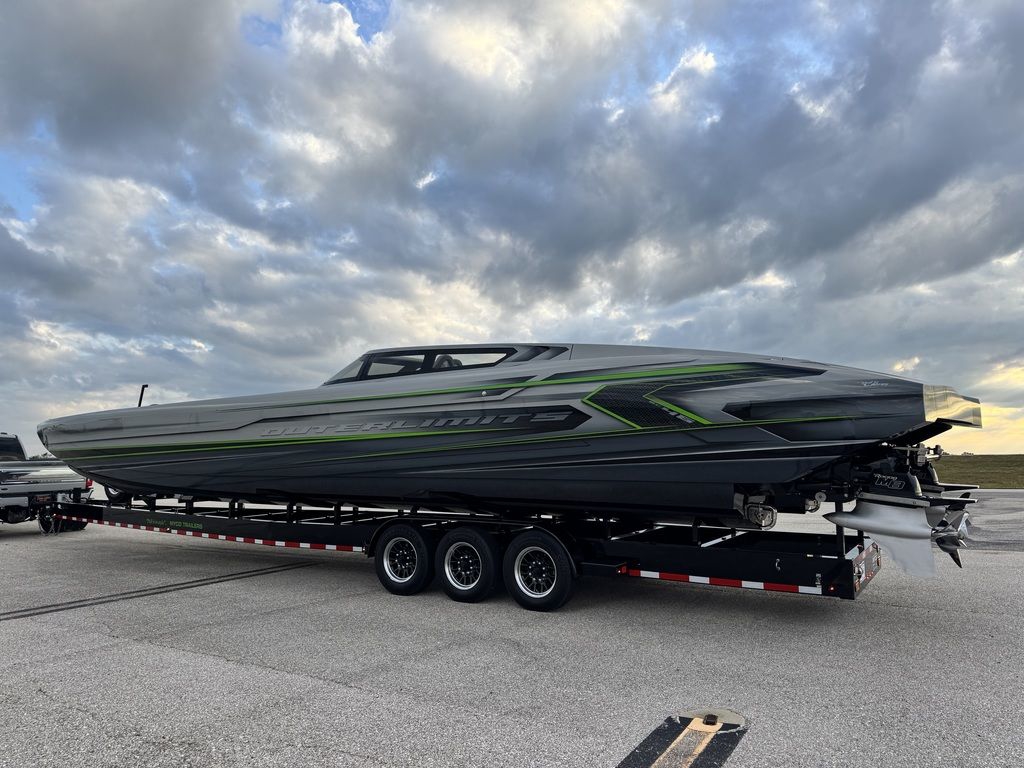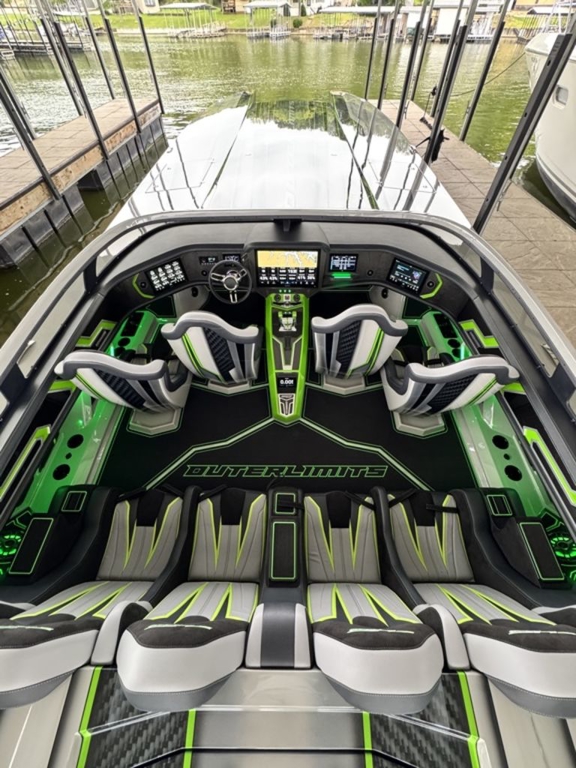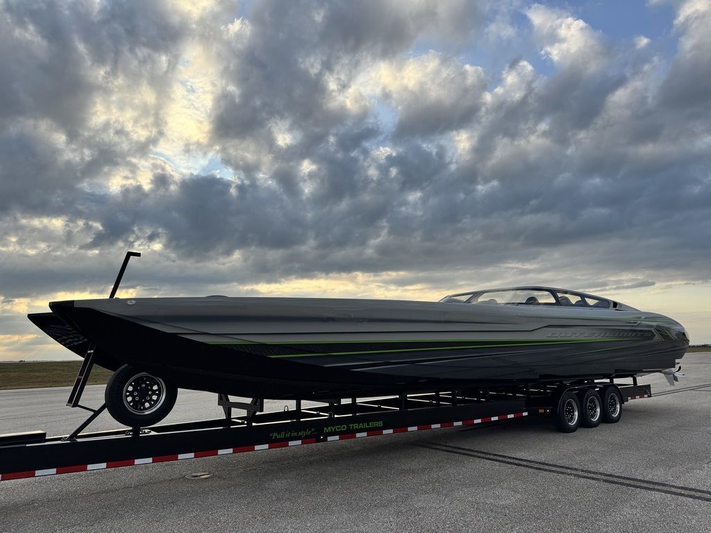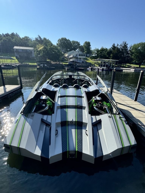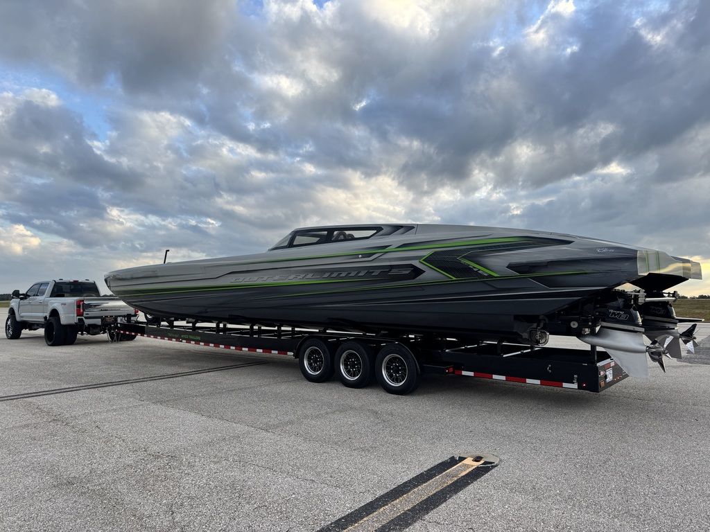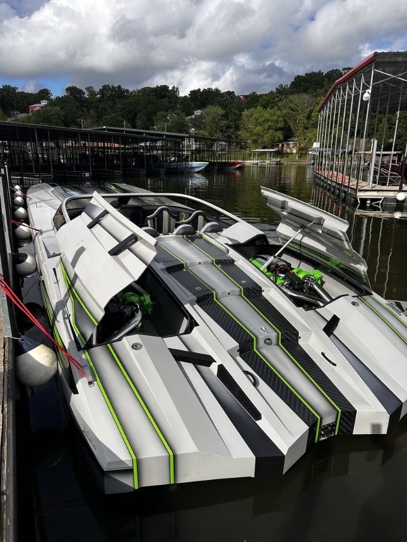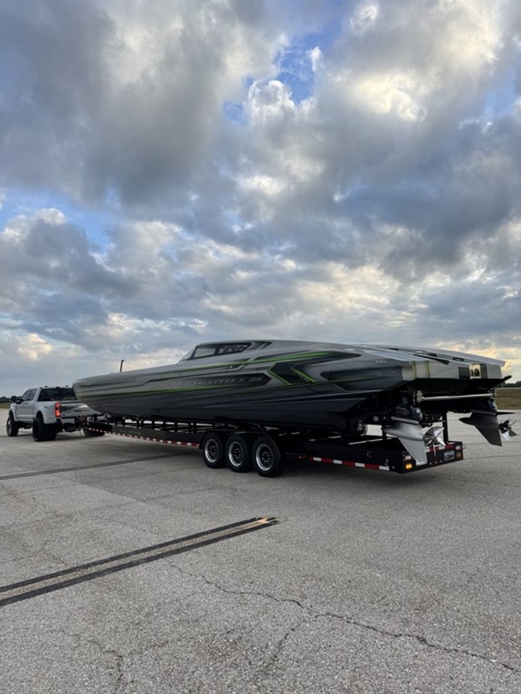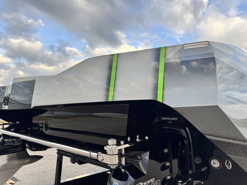 Offered by Elite Autos LLC in conjunction with Performance Boat Center of Osage Beach, Mo., this 2026 model-year Outerlimits Offshore Powerboats SC 46 catamaran is powered by dual-calibration Mercury Racing 1550/1350 with M8 drives. The turbocharged quad-cam four-valve engines have five operating hours, and the skegs for the drives were blueprinted by Wilson Custom Marine.