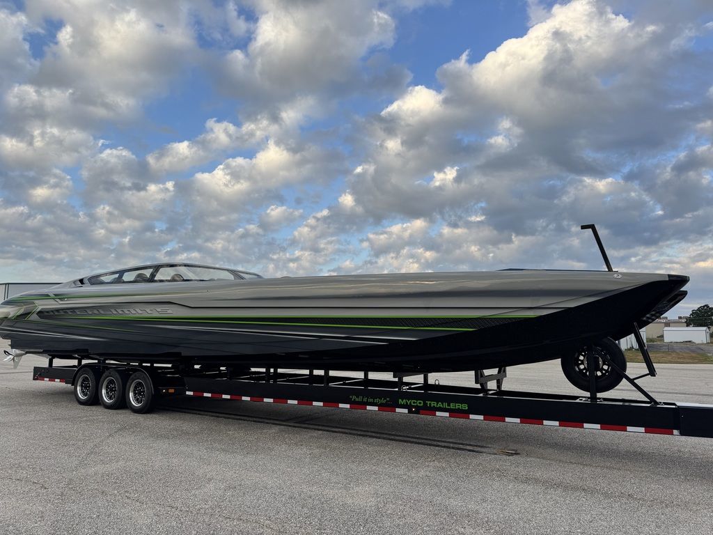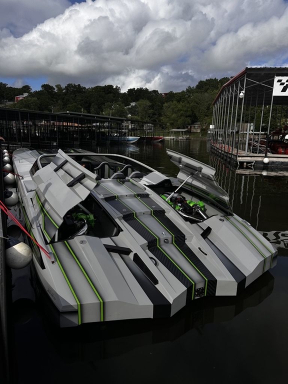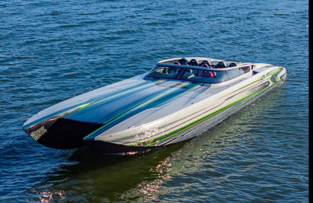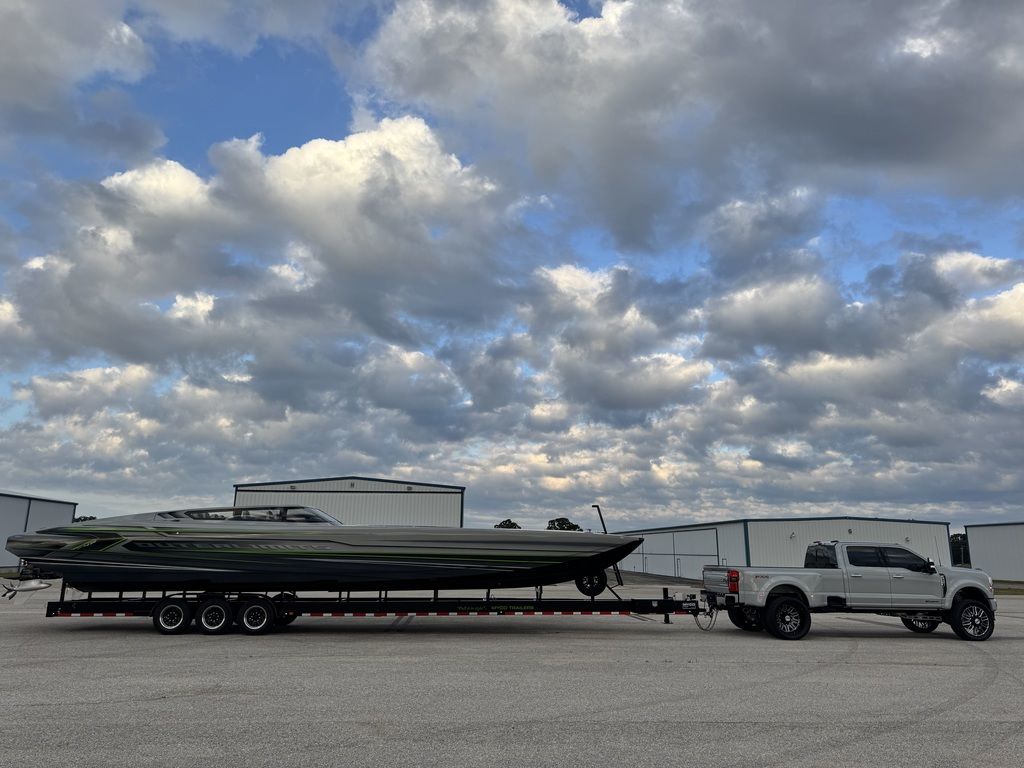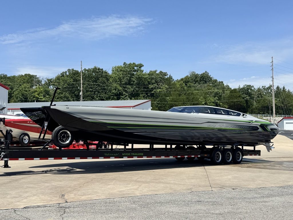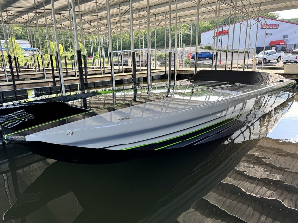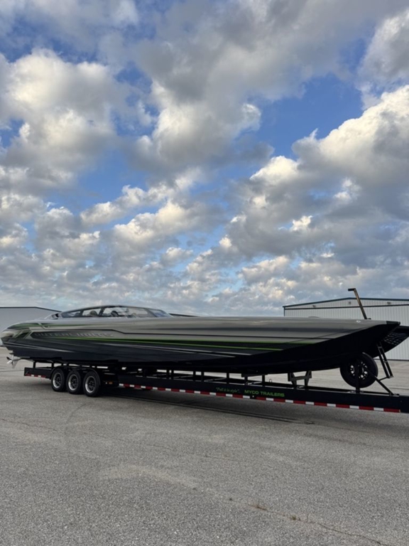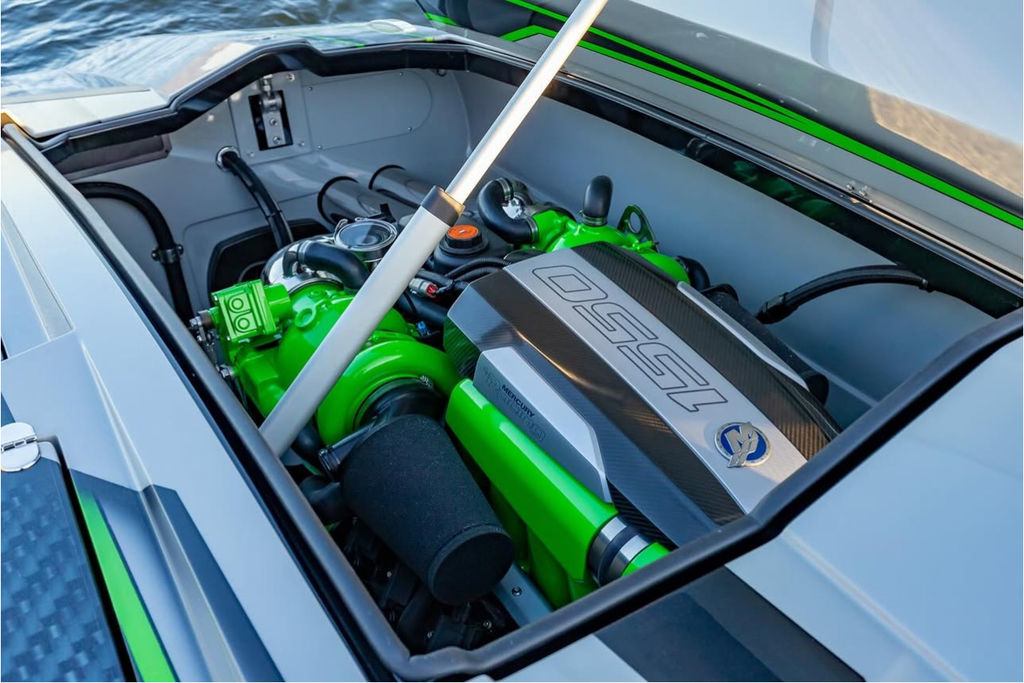 Offered by Elite Autos LLC in conjunction with Performance Boat Center of Osage Beach, Mo., this 2026 model-year Outerlimits Offshore Powerboats SC 46 catamaran is powered by dual-calibration Mercury Racing 1550/1350 with M8 drives. The turbocharged quad-cam four-valve engines have five operating hours, and the skegs for the drives were blueprinted by Wilson Custom Marine.