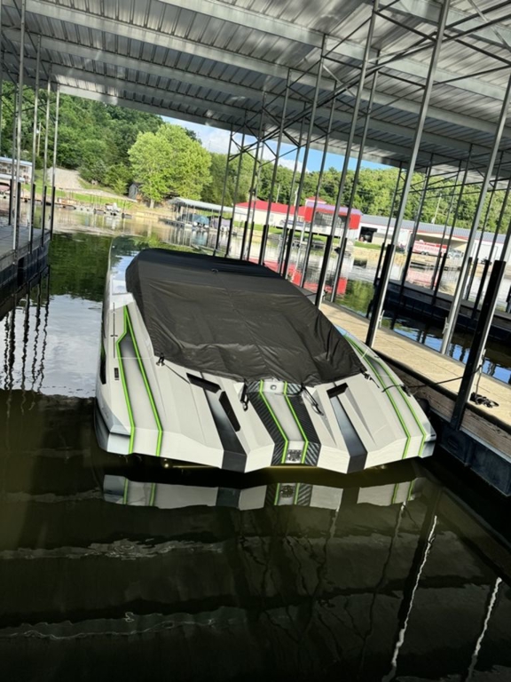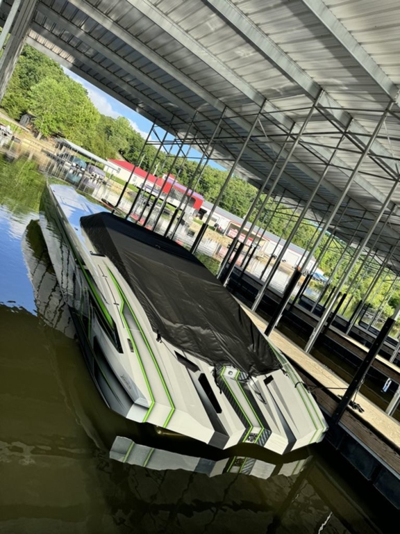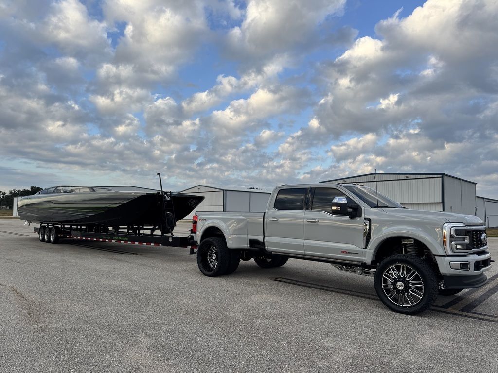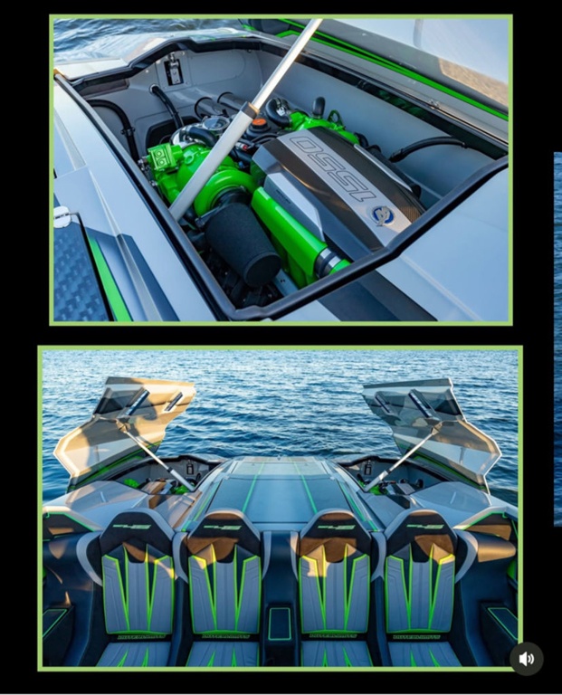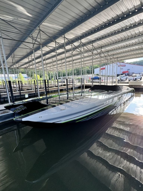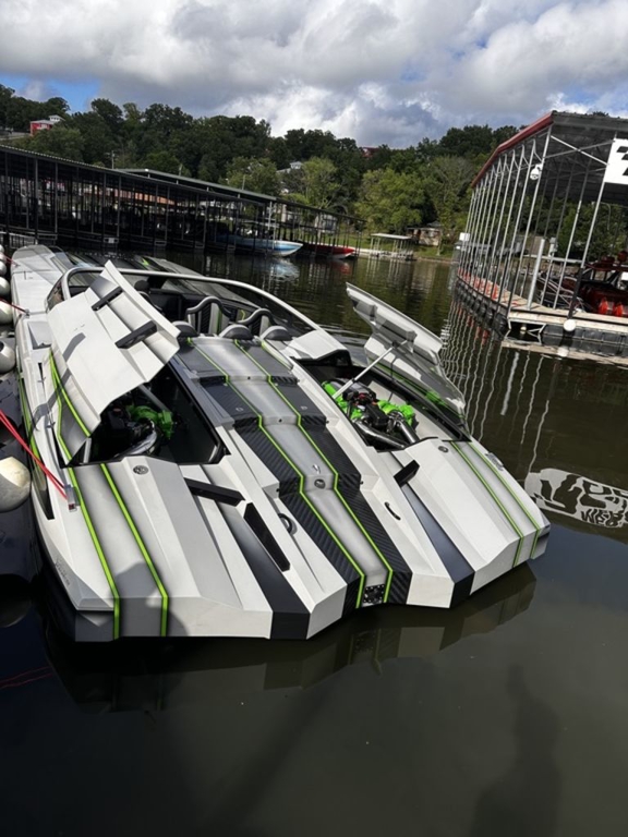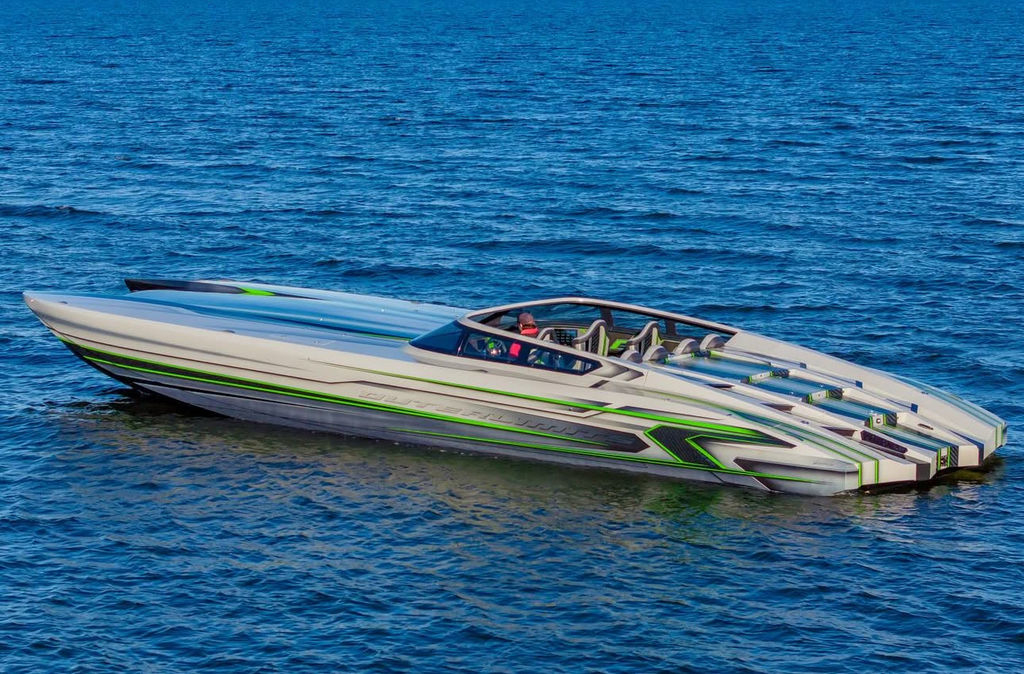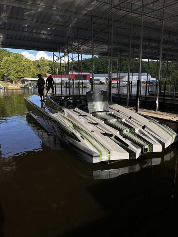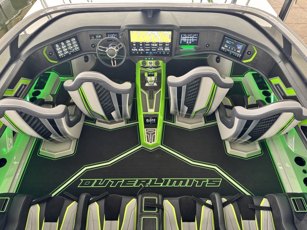 Offered by Elite Autos LLC in conjunction with Performance Boat Center of Osage Beach, Mo., this 2026 model-year Outerlimits Offshore Powerboats SC 46 catamaran is powered by dual-calibration Mercury Racing 1550/1350 with M8 drives. The turbocharged quad-cam four-valve engines have five operating hours, and the skegs for the drives were blueprinted by Wilson Custom Marine.