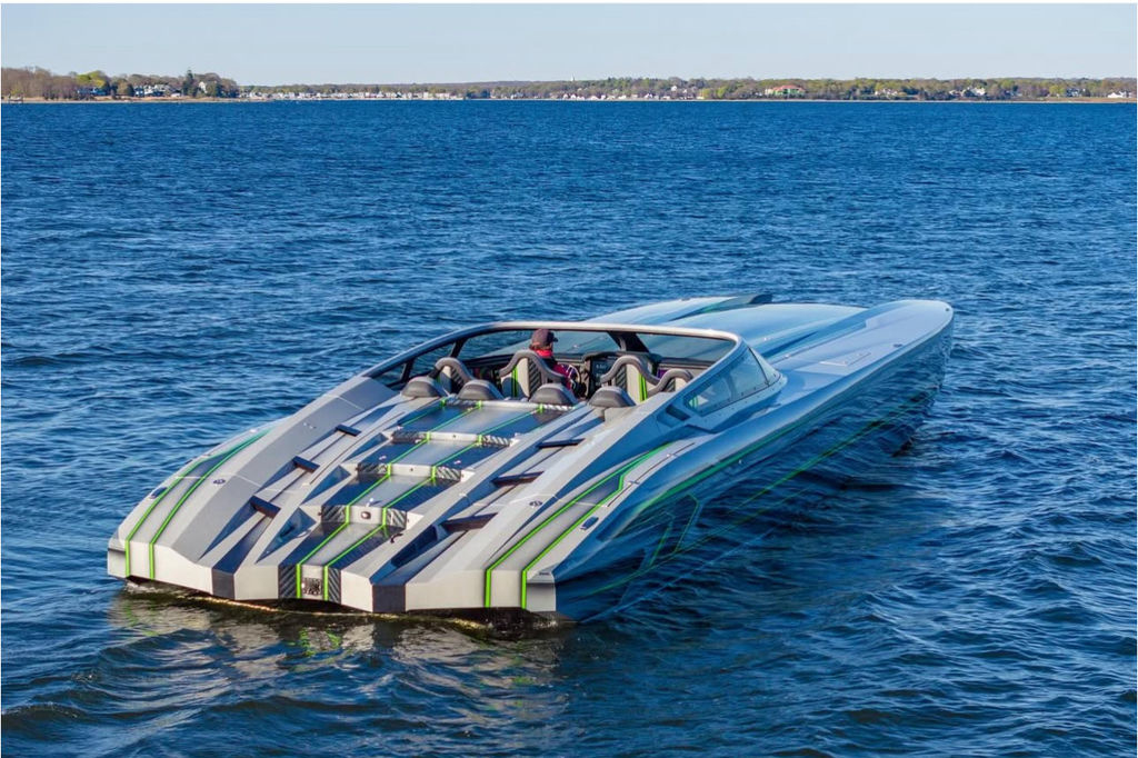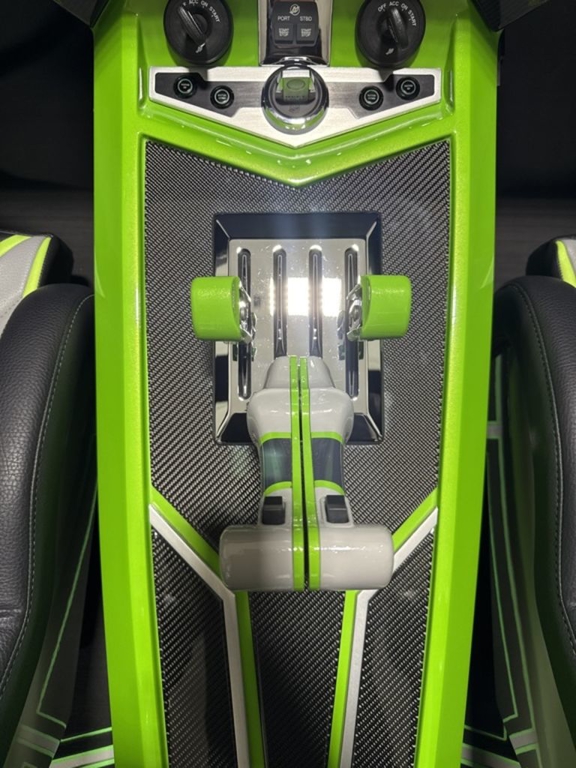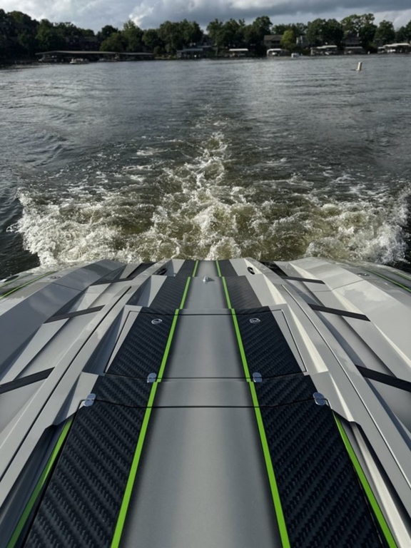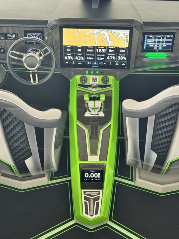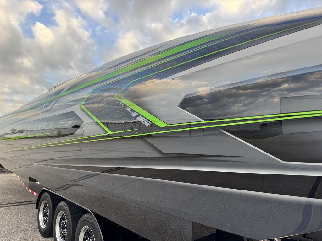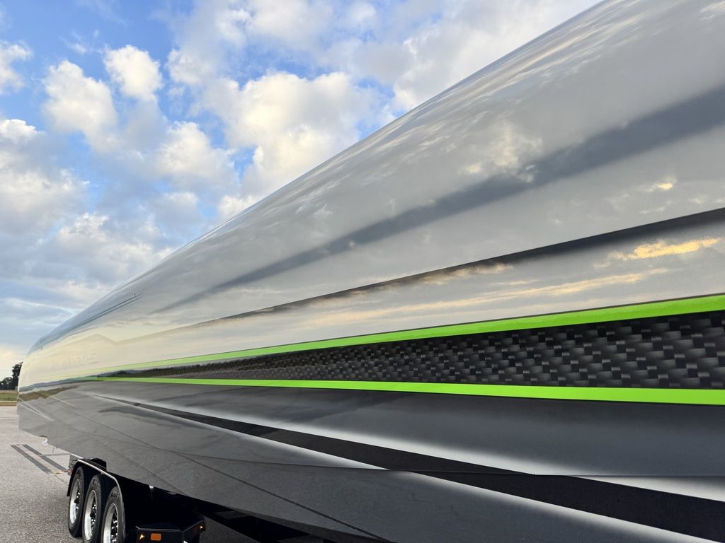 The full-carbon, eight-seat 46-footer was painted by Wes Jones using a graphics scheme created by Stephen Miles Design. Electronics mounted in the carbon fiber dash with billet in-lays include four Garmin GPS/Chartplotters, two Mercury Marine VesselView monitors and a JL Audio sound system with a Fusion head unit. The cat’s seat are upholstered in Alcantara and its sole is covered with HydraFoam decking.