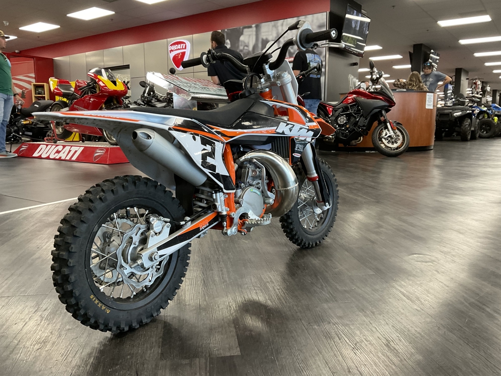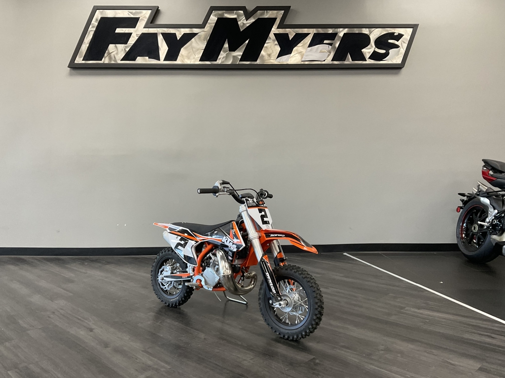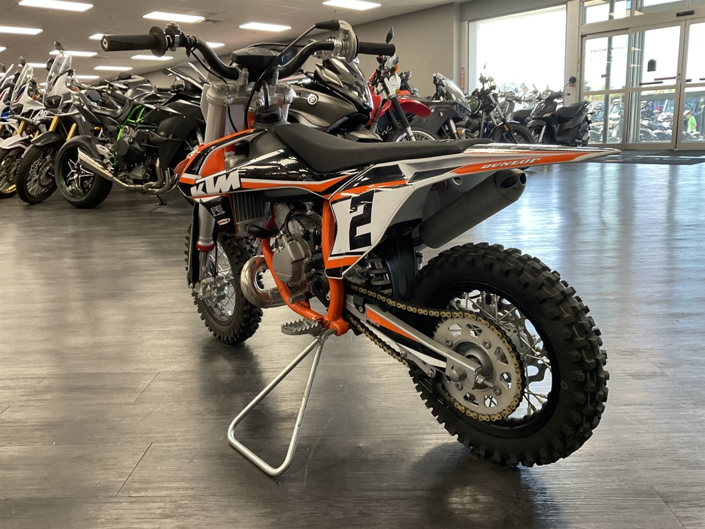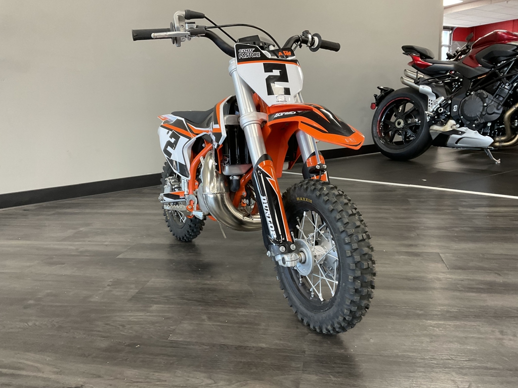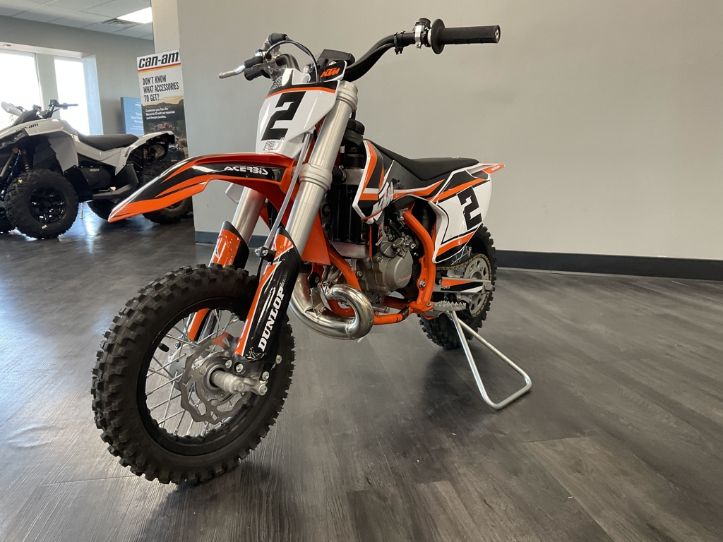 PODIUMS START HERE. The KTM 50 SX MINI is a true READY TO RACE motocross machine. It is a genuine dirt bike that, like its bigger siblings, is produced with top-quality components, real race-bred input, and thoughtful development. It goes without saying that the KTM 50 SX is the only choice when stepping into the world of MX, bringing even the youngest riders up to the starting gate. ENGINE & EXHAUST: ENGINE - This little ripper of an engine features a high-performance cylinder, exhaust pipe, and reed intake system, which are perfectly arranged for maximum performance, setting the standard in the highly competitive 50 cc class. CHASSIS: FRAME - The modern frame is made from lightweight, high-strength chromoly steel profiles and combines maximum longitudinal stiffness with optimum torsional rigidity. It guarantees easy handling and precise cornering, but also outstanding stability. ERGONOMICS & COMFORT: HANDLEBAR - The KTM 50 SX MINI uses a perfectly shaped handlebar made from a high-quality aluminum alloy. It provides a great feeling of control for the rider, helping with overall stability. A pad around the center brace also protects the rider from hard knocks. Advertised pricing excludes applicable taxes, title, and licensing and is subject to change without notice. The illustrated vehicles may vary in selected details from the production models and some illustrations feature optional equipment available at additional cost. All information concerning the scope of supply, appearance, services, dimensions, and weights is non-binding and specified with the proviso that errors, for instance in printing, setting, and/or typing, may occur; such information is subject to change without notice. The consumption values stated refer to the roadworthy series condition of the vehicles at the time of factory delivery.