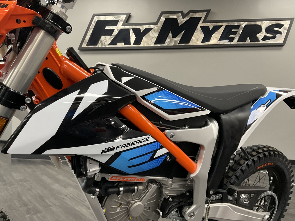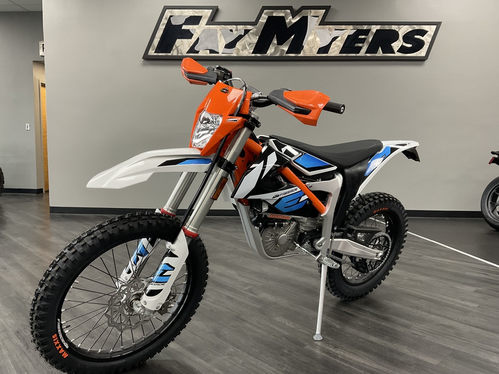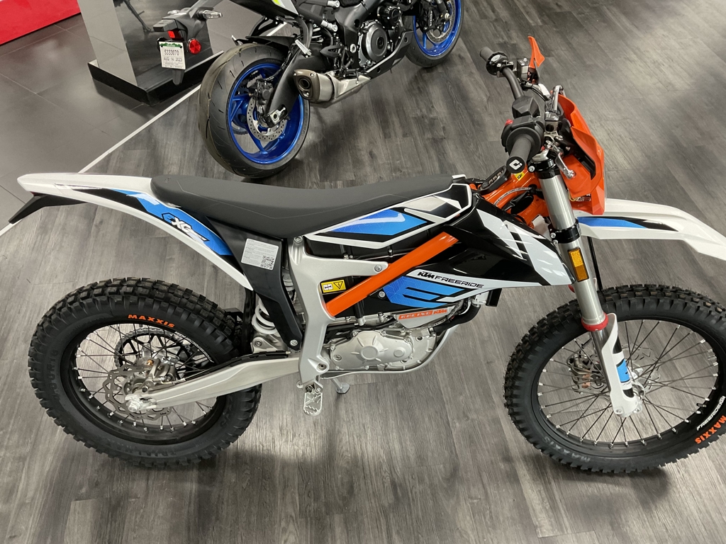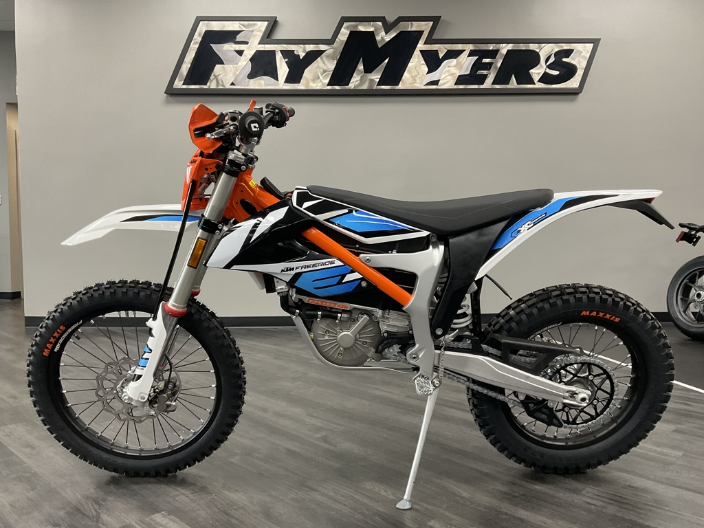 ENDLESS POSSIBILITIES. The KTM FREERIDE E-XC represents the latest generation of electric bikes. It features a brushless 18 kW synchronous motor in a modern FREERIDE chassis with WP XPLOR suspension front and rear, making it outstandingly agile, as well as highly dynamic with great offroad mobility. Featuring an updated brake system for 2021, the KTM FREERIDE E-XC is a true all-rounder for pure fun on every terrain. MODEL HIGHLIGHTS "¢ State-of-the-art electric motor with 18 kW of maximum output "¢ Quick change KTM PowerPack with 3.9 kWh capacity "¢ Adjustable WP XPLOR 43 front fork with 250 mm of travel "¢ Adjustable WP XPLOR PDS rear shock with 260 mm of travel "¢ Giant laced wheels 21"/18" with anodized aluminum rims "¢ FORMULA brakes for improved feeling & performance BODYWORK & GRAPHICS: DASHBOARD - The KTM FREERIDE E-XC features a dashboard with a digital speedometer from MAE and numerous features, including ease of use and integrated warning and indicator lights. The speedometer cable is well protected in the braided front brake hose tube, which has an integrated channel. In addition, the bike features a location for the ignition lock on the right-hand side of the headlight mask next to the speedometer guaranteeing easy access. CHASSIS: FRAME - The chassis of the KTM FREERIDE E-XC features a very lightweight composite frame design combining top-quality chrome-molybdenum steel with bolt-on forged aluminum sections. The frame has an open lower section, with the motor and massive aluminum skid plate functioning as stressed members. This design ensures optimal stiffness and stability for top safety, even in high jumps. ENGINE: CONTROL UNIT - The state-of-the-art control unit is an advanced set of electronics delivering an important contribution toward the responsive yet highly tractable power delivery of the KTM FREERIDE E-XC. It is water-cooled in order to ensure reliable function under any conditions. ERGONOMICS & COMFORT: HANDLEBAR - The tapered Neken high-strength aluminum handlebar of the KTM FREERIDE E-XC has the same bend and width as the EXC handlebar, providing the rider with enhanced ergonomics and control. The handlebar is equipped with ODI grips, with a convenient lock-on grip on the left, which requires neither adhesives nor wire for a secure fit. SOFTWARE & ELECTRONICS: CHARGER - The external charger can be connected to any regular 230V socket fused at 10A or 13A and can be easily connected to the KTM PowerPack by flipping up the seat. Charging time is about 110 minutes for a full charge or about 75 minutes for an 80 % charge. Advertised pricing excludes applicable taxes, title, and licensing and is subject to change without notice. The illustrated models may vary in selected details from the production models and some illustrations feature optional equipment available at additional cost. All information concerning the scope of supply, appearance, services, dimensions, and weights is non-binding and spec