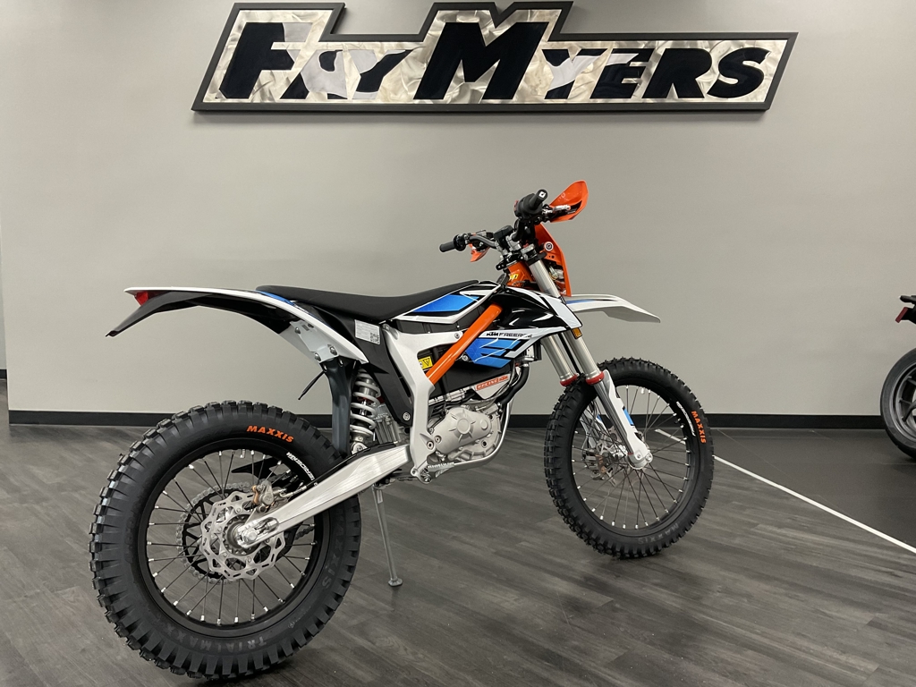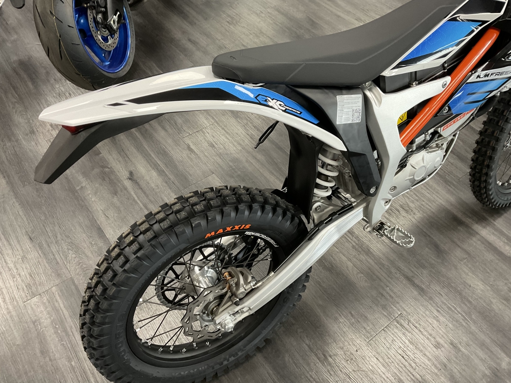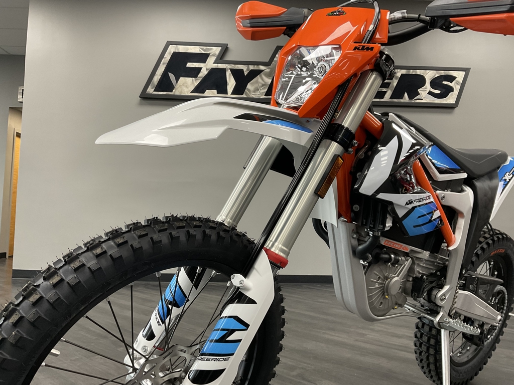 ENDLESS POSSIBILITIES. The KTM FREERIDE E-XC represents the latest generation of electric bikes. It features a brushless 18 kW synchronous motor in a modern FREERIDE chassis with WP XPLOR suspension front and rear, making it outstandingly agile, as well as highly dynamic with great offroad mobility. Featuring an updated brake system for 2021, the KTM FREERIDE E-XC is a true all-rounder for pure fun on every terrain. MODEL HIGHLIGHTS "¢ State-of-the-art electric motor with 18 kW of maximum output "¢ Quick change KTM PowerPack with 3.9 kWh capacity "¢ Adjustable WP XPLOR 43 front fork with 250 mm of travel "¢ Adjustable WP XPLOR PDS rear shock with 260 mm of travel "¢ Giant laced wheels 21"/18" with anodized aluminum rims "¢ FORMULA brakes for improved feeling & performance BODYWORK & GRAPHICS: DASHBOARD - The KTM FREERIDE E-XC features a dashboard with a digital speedometer from MAE and numerous features, including ease of use and integrated warning and indicator lights. The speedometer cable is well protected in the braided front brake hose tube, which has an integrated channel. In addition, the bike features a location for the ignition lock on the right-hand side of the headlight mask next to the speedometer guaranteeing easy access. CHASSIS: FRAME - The chassis of the KTM FREERIDE E-XC features a very lightweight composite frame design combining top-quality chrome-molybdenum steel with bolt-on forged aluminum sections. The frame has an open lower section, with the motor and massive aluminum skid plate functioning as stressed members. This design ensures optimal stiffness and stability for top safety, even in high jumps. ENGINE: CONTROL UNIT - The state-of-the-art control unit is an advanced set of electronics delivering an important contribution toward the responsive yet highly tractable power delivery of the KTM FREERIDE E-XC. It is water-cooled in order to ensure reliable function under any conditions. ERGONOMICS & COMFORT: HANDLEBAR - The tapered Neken high-strength aluminum handlebar of the KTM FREERIDE E-XC has the same bend and width as the EXC handlebar, providing the rider with enhanced ergonomics and control. The handlebar is equipped with ODI grips, with a convenient lock-on grip on the left, which requires neither adhesives nor wire for a secure fit. SOFTWARE & ELECTRONICS: CHARGER - The external charger can be connected to any regular 230V socket fused at 10A or 13A and can be easily connected to the KTM PowerPack by flipping up the seat. Charging time is about 110 minutes for a full charge or about 75 minutes for an 80 % charge. Advertised pricing excludes applicable taxes, title, and licensing and is subject to change without notice. The illustrated models may vary in selected details from the production models and some illustrations feature optional equipment available at additional cost. All information concerning the scope of supply, appearance, services, dimensions, and weights is non-binding and spec