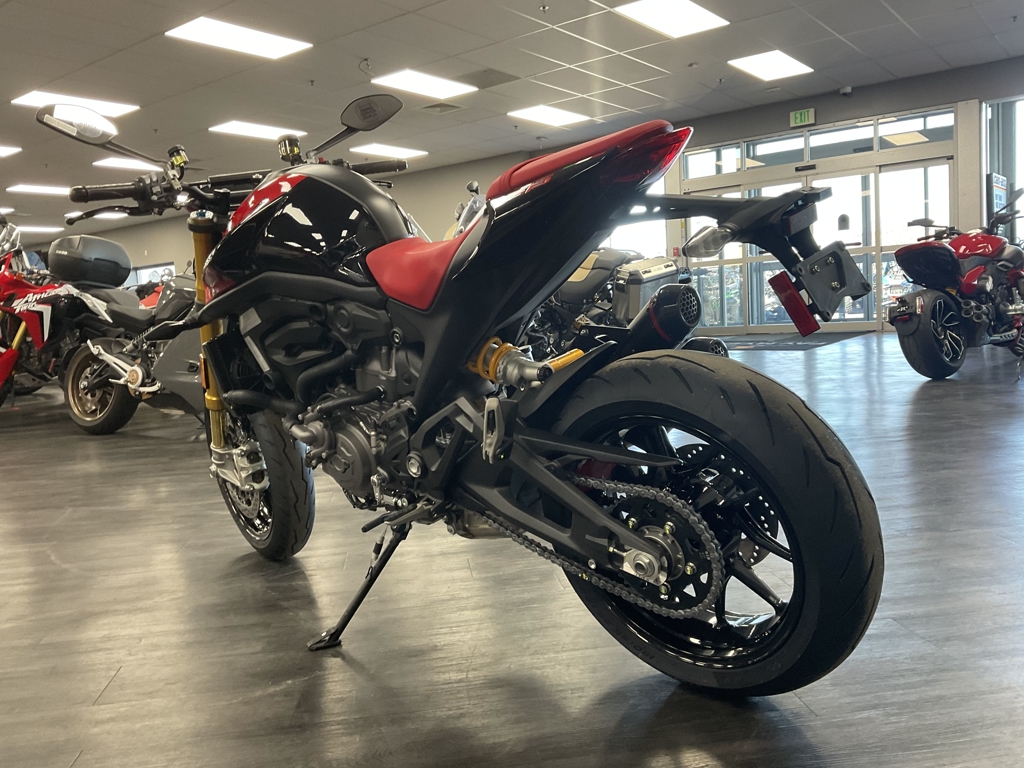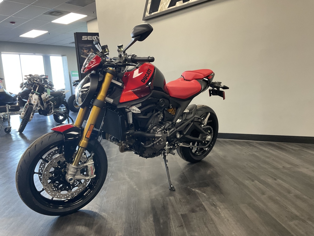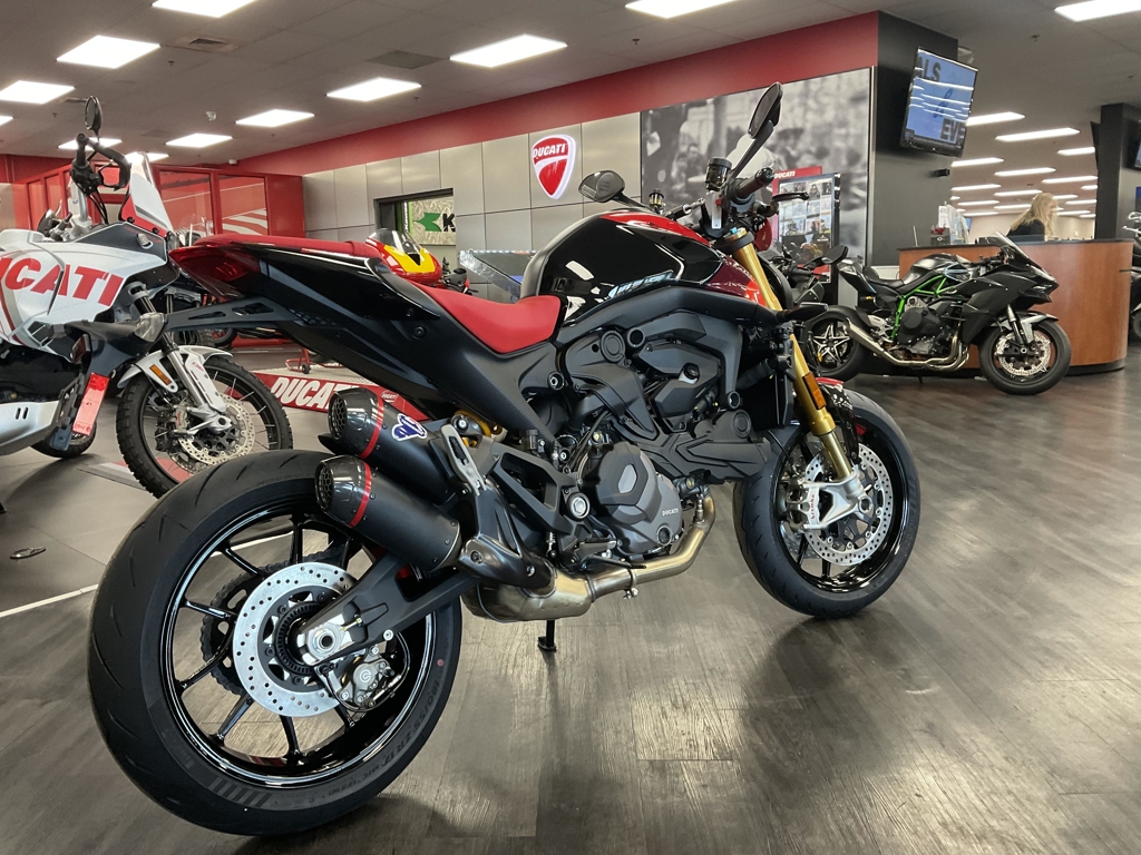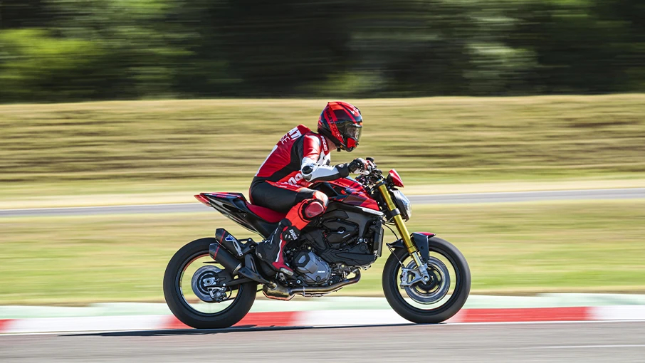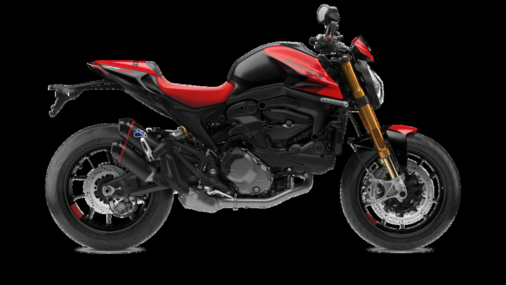 MAD FOR FUN. The Monster range grows with the SP version, designed to enhance fun, thanks to technical equipment perfect for those who love sporty riding and embellish style with the Moto GP-inspired livery. The Monster SP takes the 2022 colors of the official team's Desmosedici GP, mounts the Öhlins NIX30 fork and Termignoni homologated silencer, Brembo Stylema® front calipers and Pirelli Diablo Rosso IV tires. True supersport equipment that will make you fall in love with the new Monster SP. Are you ready for more? ELECTRONICS AT THE TOP OF THE SEGMENT Standard equipment includes ABS Cornering, Ducati Traction Control, Ducati Wheelie Control, all adjustable to different levels of intervention. The sporty character of the Monster is also emphasized by Launch Control, which ensures lightning-fast starts. This top-of-the-line motorcycle equipment allows the Monster to safely express its performance. Sport, Road and Wet Riding Modes allow you to mold the character of the Monster according to your tastes and needs. Everything is easily managed through the handlebar controls and the 4.3-inch color TFT dashboard. DUCATI TRACTION CONTROL Traction control is an intelligent system that acts as a "filter" between the accelerator and the rear tire. The system allows a choice of eight different levels of intervention. The traction control levels are preset for each of the three Riding Modes, but can be customized to suit the rider and road characteristics, as well as for other electronic driving aid systems. LAUNCH CONTROL The Monster SP is equipped with a Launch Control system that enables incredibly efficient starts. The system once "armed" autonomously manages the engine revs (whatever the throttle grip is opened) and leaving the rider with only the task of managing the clutch at the start. A "drag race" proof mode that allows the best possible acceleration. DUCATI WHEELIE CONTROL Wheelie Control allows the motorcycle maximum acceleration by eliminating or limiting wheelie phenomenon. This provides a high level of safety while ensuring the best acceleration performance. Wheelie control can be adjusted to several levels independently of the other controls. DUCATI QUICK SHIFT UP/ DOWN The Ducati Quick Shifer (DQS) up/down is an electronic shift assist system that allows gear engagement without the need to pull the clutch either up or downshifting. This system not only makes sporty riding more fun, but is also a valuable aid in city traffic and on winding roads that require frequent use of the transmission. COLOR OPTION: "¢ Dark Stealth Pricing and specifications are subject to change without notice. See Dealer for details.