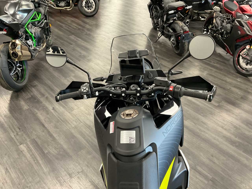 TRUST IN THE NORTH. Setting a high standard in the adventure motorcycle segment, the Norden 901 allows touring enthusiasts to discover the hidden corners of the globe. Highly capable on road and excelling off road, the long-distance travel machine is designed to enhance rider comfort on longer rides. Powered by a smooth and torquey 889 cc parallel twin engine, which is housed inside a lightweight, steel trellis frame, the Norden 901 is complete with premium components, offering maximum performance and reliability. Explore the world your way with the Norden 901. Wherever you plan to go or wherever your inner north navigation takes you, the chrome-molybdenum steel trellis frame is designed for distance - able to take the load and deliver day-long comfort. By using the engine as a stressed member the frame can be light and compact. Engineered to deliver precise feedback with agility and light-handling through the tightest bends, stability, and comfort over distance, and superior offroad ability on the less-traveled tracks. Although it is compact and light the frame is as tough as any challenge you set it, carrying luggage, a passenger, or both anywhere from the street to the most remote trail. The geometry of the Norden 901 was developed to create a world-class travel motorcycle for every voyage of discovery. Seat height is manageable for every adventurer thanks to an angled rear shock. The ergonomics place you towards the front wheel for a better feel and grip on all surfaces. Control and comfort rank high on your list of demands from the Norden 901. With 220 mm of travel, the WP APEX 43 mm upside-down front forks guarantee faultless performance and comfort in every environment, whether that means taut handling on tarmac or smoothing the way offroad. You can quickly and easily vary the ride characteristics to suit your own preference and varying conditions thanks to the adjustability of the compression and rebound damping of the forks. Likewise, the WP APEX rear shock offers a generous 215 mm of travel and is adjustable for rebound damping and spring preload to cater to the roads you ride and the loads you carry. Adjusting the settings is quick and easy so that when conditions change, you can set the suspension to match them. With comfort and control from compliant suspension, there are fewer limits to the distance your travels take you. Every twist of the ride-by-wire throttle delivers just the right amount of power you require to reach new horizons. A pair of balancer shafts in the 889 cc, double overhead cam, liquid-cooled, parallel-twin engine increase comfort and reduce vibration, adding to your riding pleasure. The engine has plentiful power, with a maximum output of 77 kW (105 hp) at 8,000 rpm and 100 Nm of torque at 6,500 rpm. This, combined with finesse and manageability, make the engine capable of delivering everything you demand of it, wherever you want to go. Long service intervals of 15,000 km and low fuel consumption make
