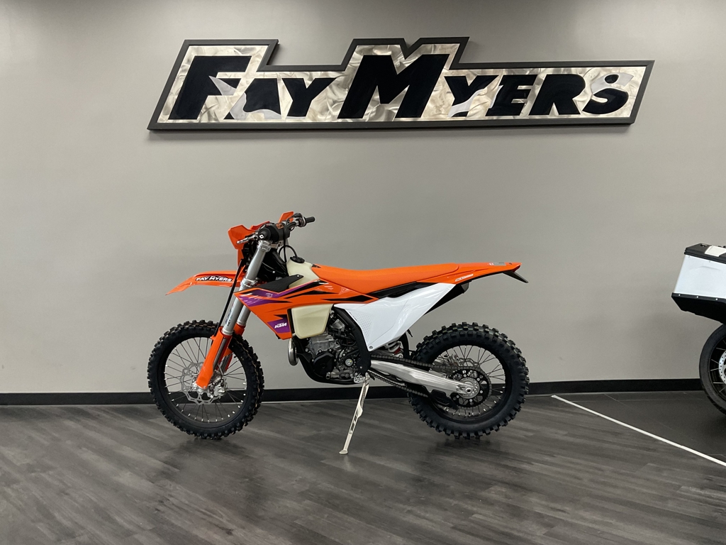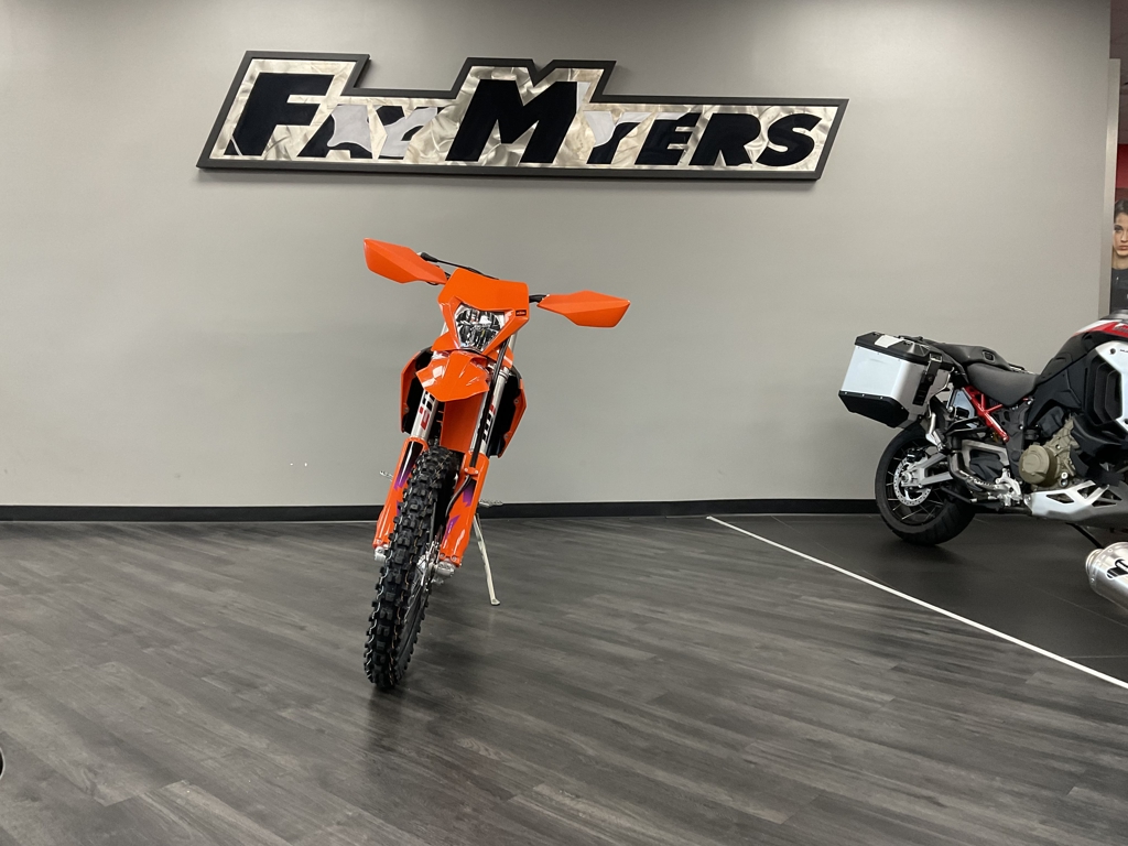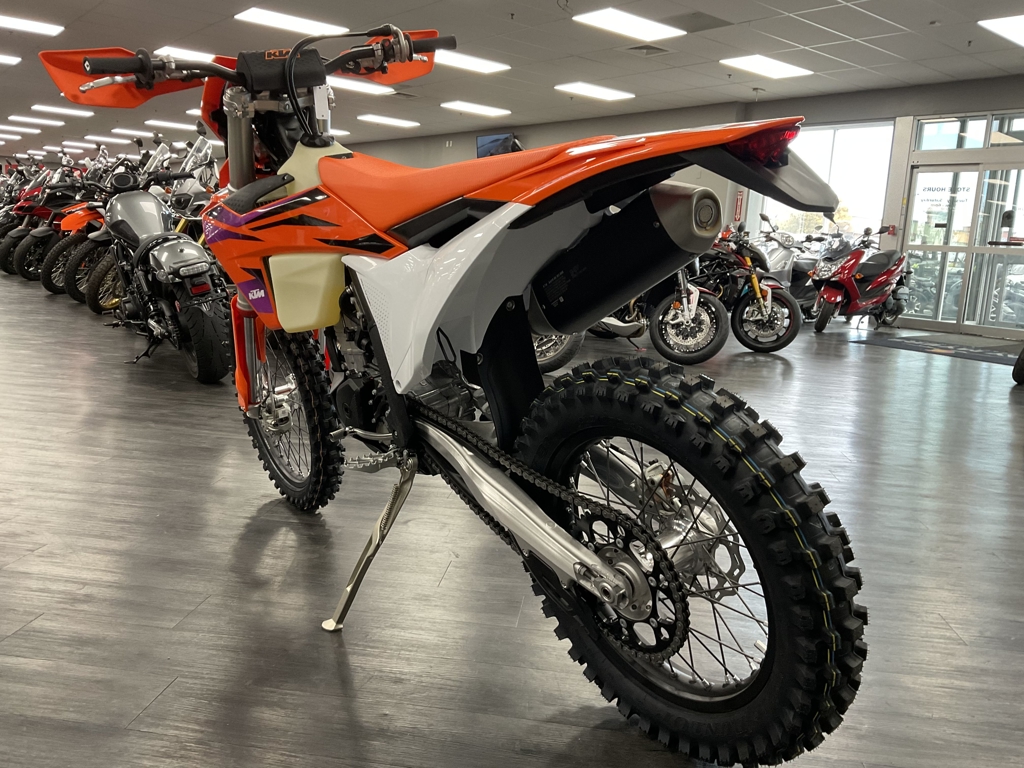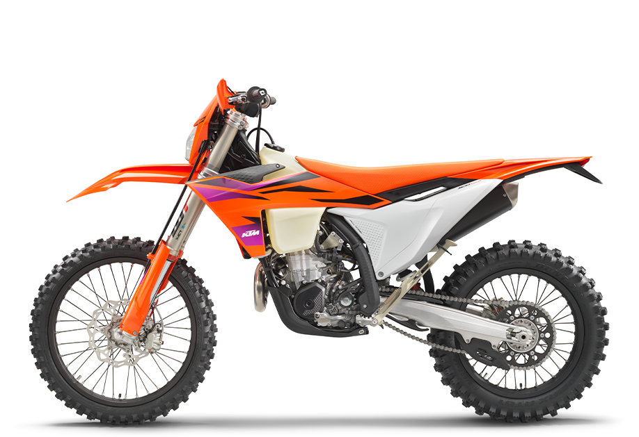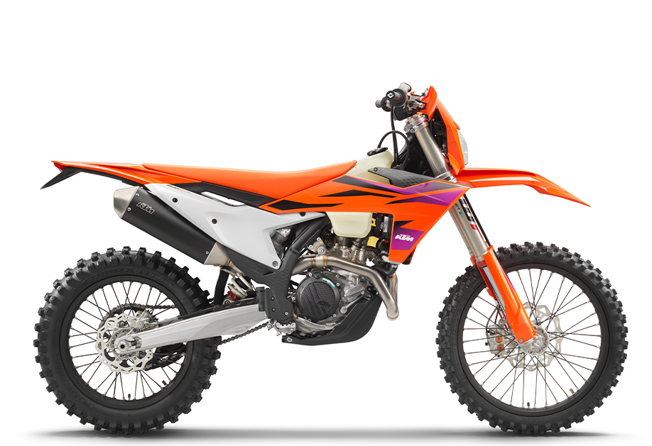 PERFECT BALANCE. Heading off to explore an abandoned town? Done. Churning dirt in a haunted forest? Easy. Charging through the deep sandy deserts? Let's go! The new 2024 KTM 500 XW-F doesn't shy away from anything. Built around an all-new frame with best-in-class suspension, this large-displacement powerhouse is surprisingly usable, making the KTM 500 XW-F the ultimate half-liter weapon in anyone's offroad arsenal. ENGINE Warp speed, engaged! The Tm 500 XW-F is an undeniable powerhouse. Weighing in at a mee 65 lb (29.5 kg), it's not only more powerful but lighter than previous generation engine too. For 2024, it's been designed with mass centralization in mind, tilting the engine 2 degrees backwards and repositioning the sprocket 3 mm lower. The result? An improved center of gravity, better handle, maneuverability, and anti-squat behavior. ADJUSTABILITY Getting READY TO RACE has never been easier. Thanks in part to its all-new suspension, the 2024 KTM XW-F range boasts totally tool-free suspension setup at both ends. At the rear, our legendary, race-winning PDS technology features an all-new shock absorber design with hand-adjustable dual compression controls. This allows riders to adjust high- and low-speed settings in a matter of seconds. On the front, the forks are also easily adjusted thanks to hand-adjustable clickers on the bottom of the fork shoe and on the fork top cap, making changing settings on the fly as easy as twisting the throttle. OFFROAD CONTROL UNIT An all-new Offroad Control Unit - or OCU - under the seat replaces all the electronic fuses and relays. All outputs are switched depending on signals from the voltage regulator and the ECU continuously. In the event of over-current, outputs are deactivated individually. This makes for easy error detection as the status of each output is indicated by a red or green LED light. This means diagnosing an electrical issue out on the trail is as easy as lifting the seat, and there's no more need to carry fiddly fuses. Advertised pricing excludes applicable taxes, title, and licensing and is subject to change without notice. The illustrated vehicles may vary in selected details from the production models and some illustrations feature optional equipment available at additional cost. All information concerning the scope of supply, appearance, services, dimensions, and weights is non-binding and specified with the proviso that errors, for instance in printing, setting, and/or typing, may occur; such information is subject to change without notice. The consumption values stated refer to the roadworthy series condition of the vehicles at the time of factory delivery.