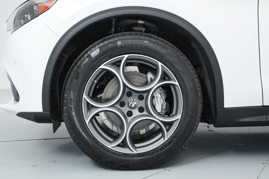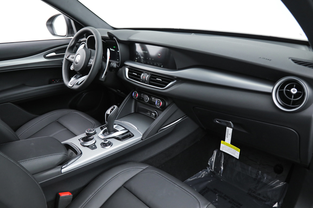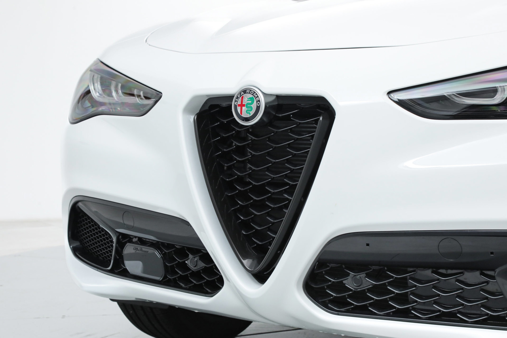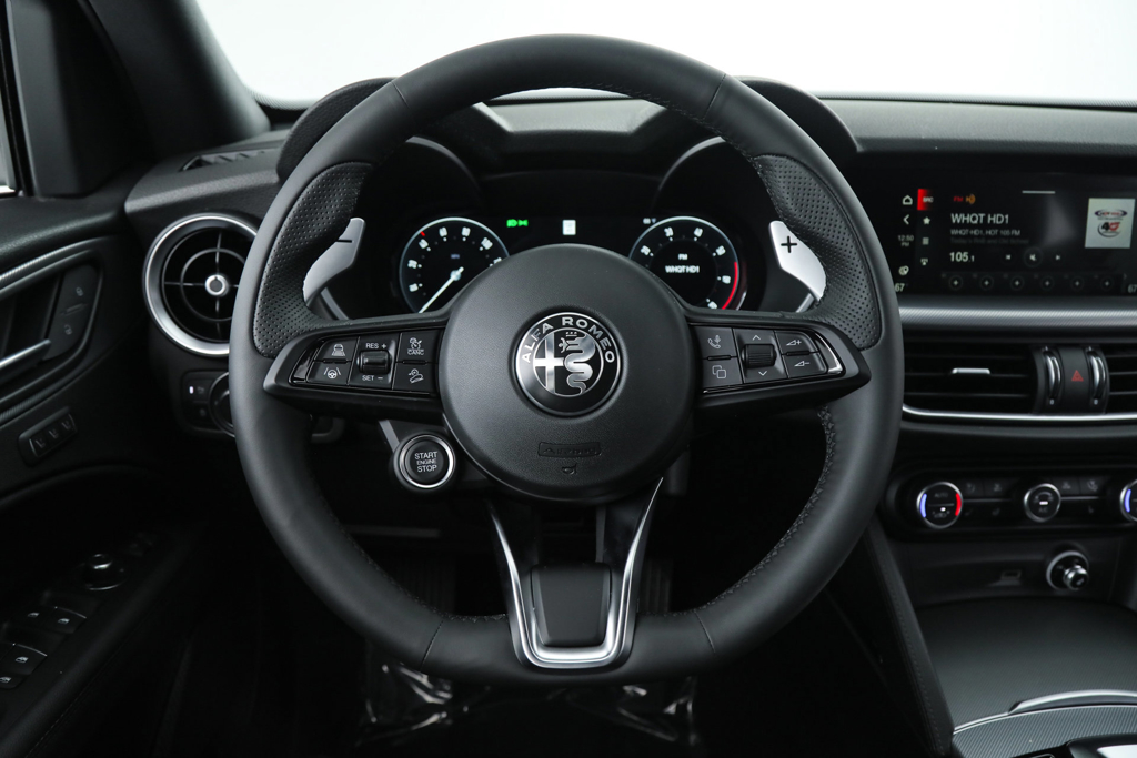 The 2025 Stelvio is equipped as standard with All-Wheel-Drive, LED Tri-Lobe Headlights, 12.3-inch TFT Digital Gauge Cluster, Navigation, Satellite and HD Radio, Apple CarPlay, Android Auto, Wireless Charging, Aluminum Paddle Shifters, Heated F/R Seats and Steering Wheel, Power Adjustable Front Seats with Lumbar, Adaptive Headlamps, Reverse Camera, AutoDimming Exterior Mirrors, Power-Folding Heated Mirrors, RainSensitive Windshield Wipers, Keyless Entry and Start, Remote Start, HomeLink, Carbon Fiber Drive Shaft, Alfa DNA Drive Mode System, ForwardCollision Warning Plus, Lane-Keep Assist, Traffic Sign Recognition, Driver Attention Alert, Adaptive Cruise Control with Full Stop, Blind Spot and Cross Path Detection, Front and Rear ParkAssist Sensors, LED DRLs and Dark Tail Lamps, 19-inch Sport 5-Hole Aluminum Wheels, Brembo Front Brakes, Dual Dark Exhaust Tips, and Vulcano Black Mirror Caps.