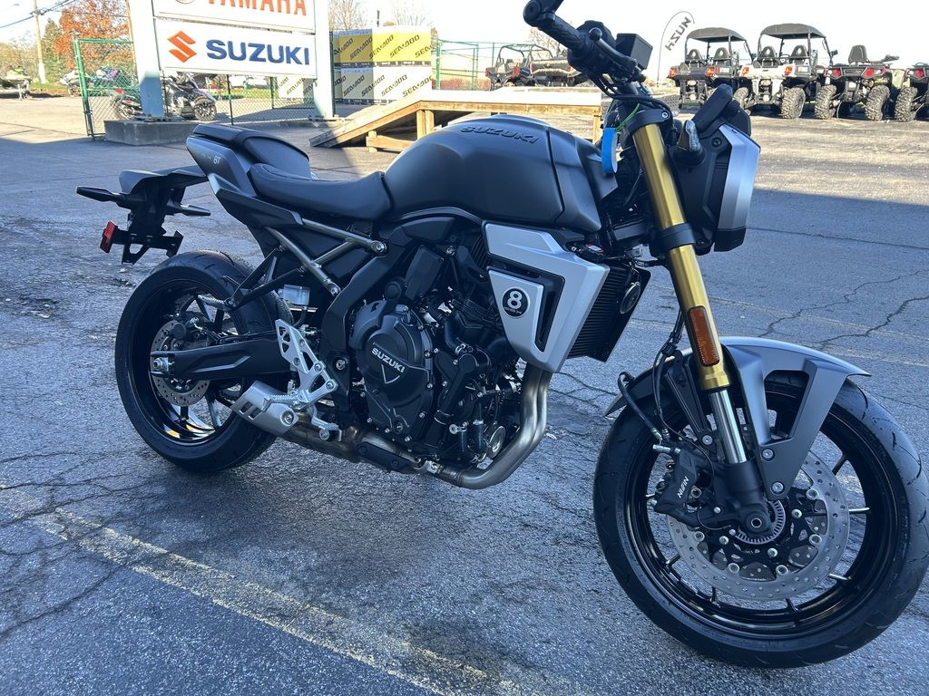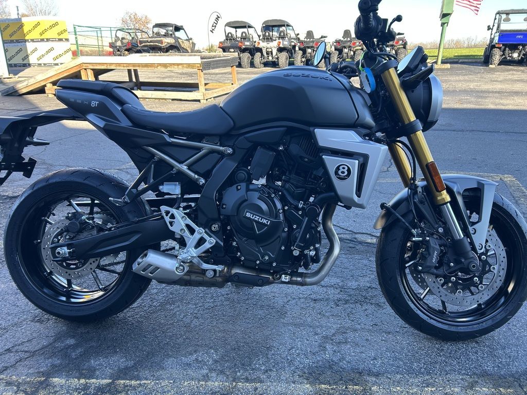 - The GSX-8T has a distinctive short muffler design with a brushed heat shield so it looks as good as it sounds. Most of the exhaust system is located under the chassis in an optimal, centralized location that also benefits